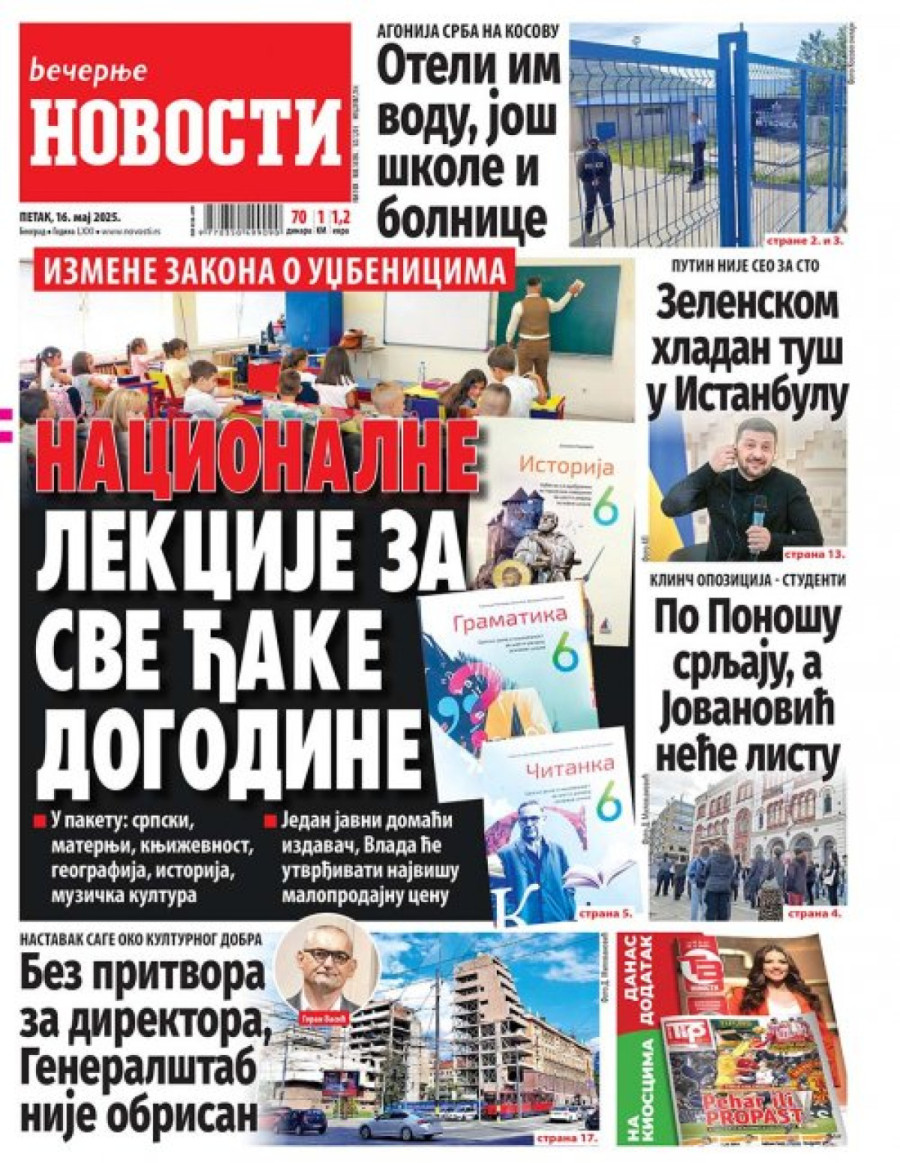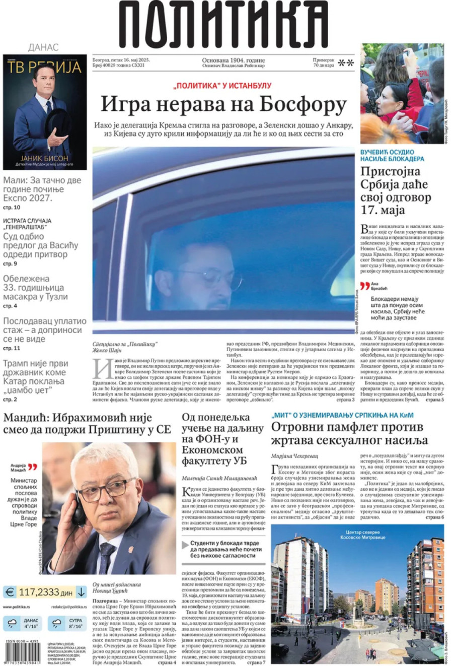 Dnevne novine u Srbiji za petak, 16. maj 2025. godine