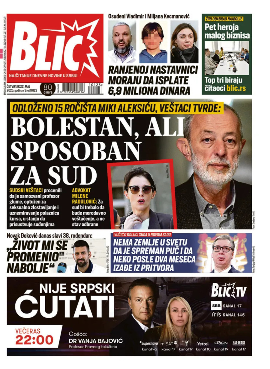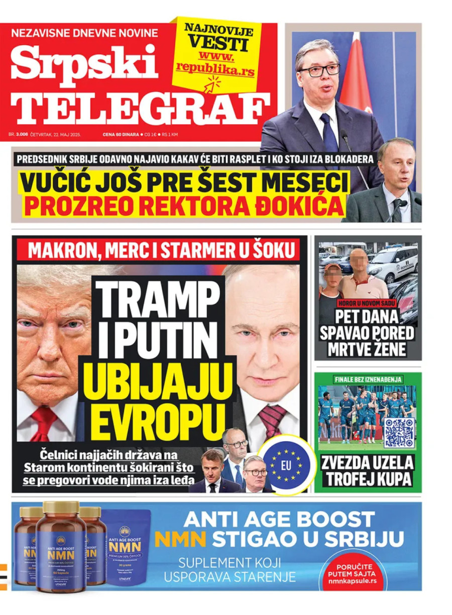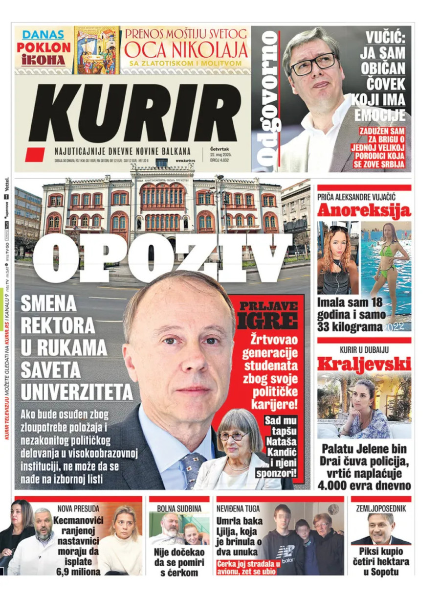 Dnevne novine u Srbiji za četvrtak 22. maj 2025. godine, na naslovnim stranama najavljuju brojne aktuelne društveno-političke teme i donose ekskluzivne priče.
