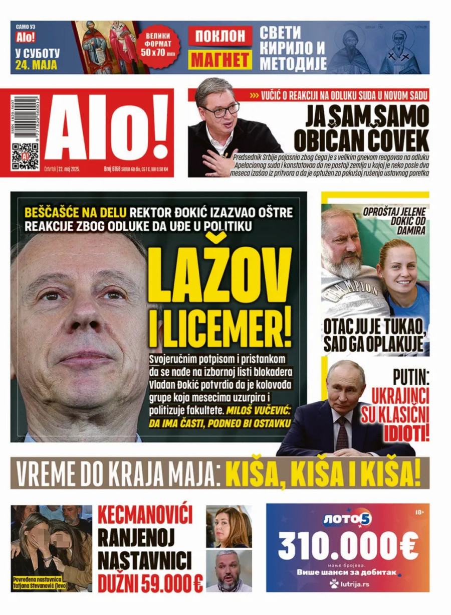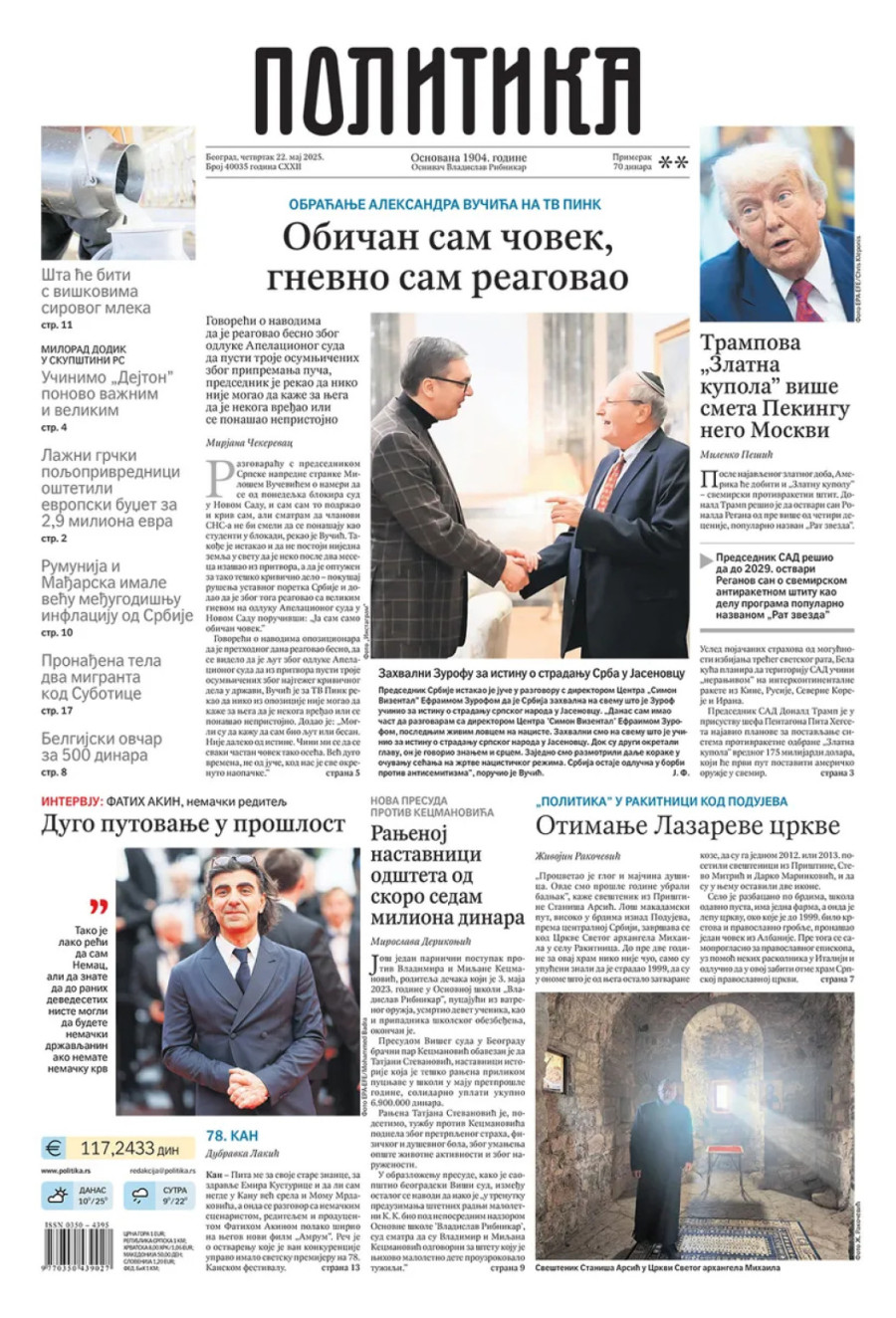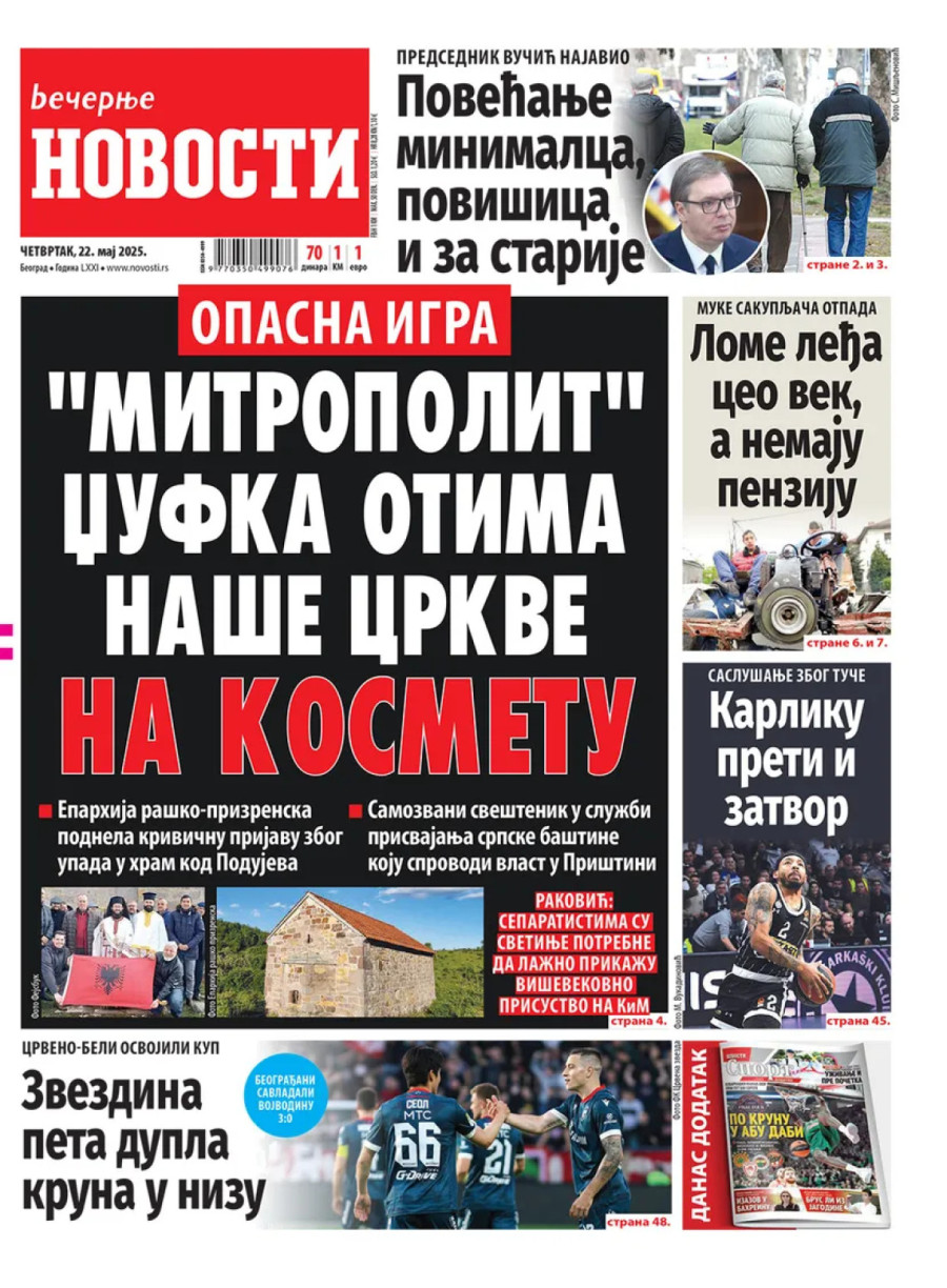Dnevne novine u Srbiji za četvrtak 22. maj 2025. godine, na naslovnim stranama najavljuju brojne aktuelne društveno-političke teme i donose ekskluzivne priče.