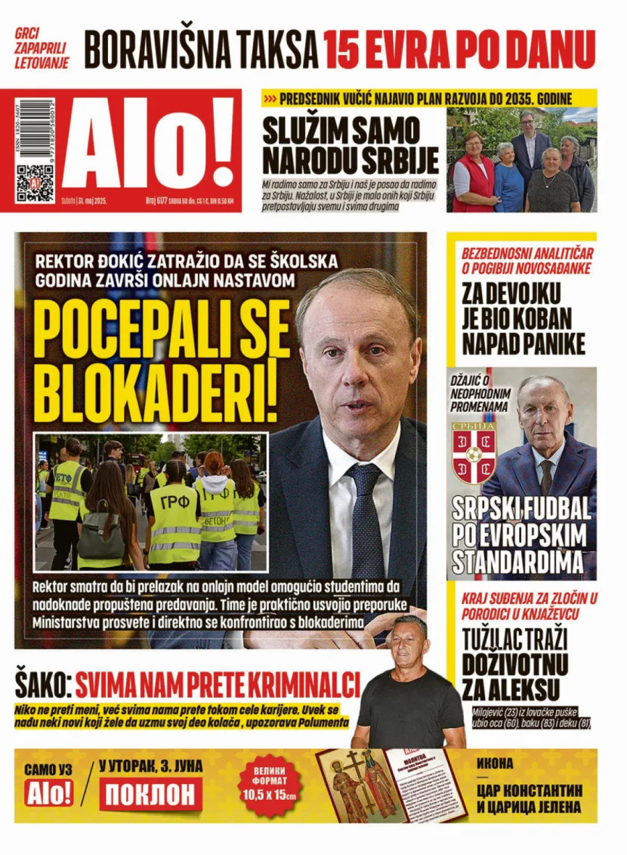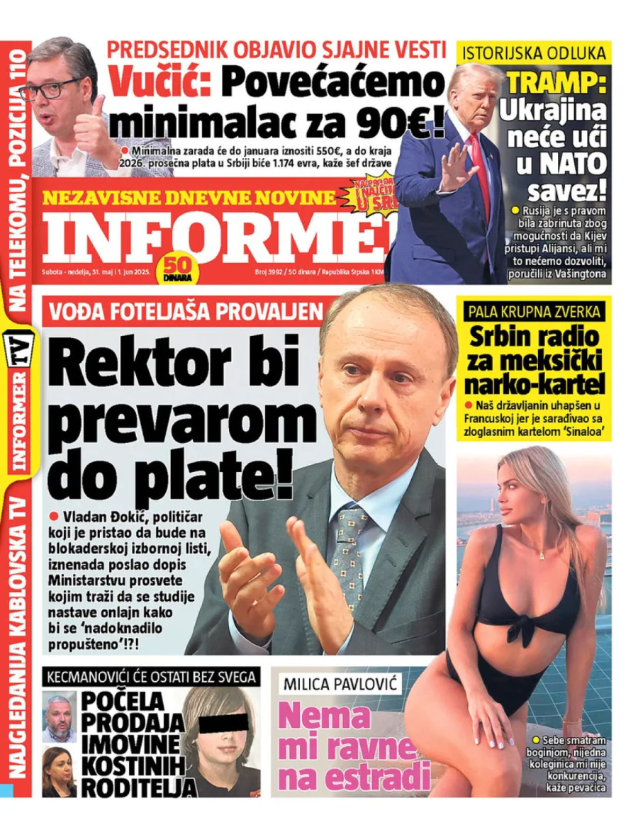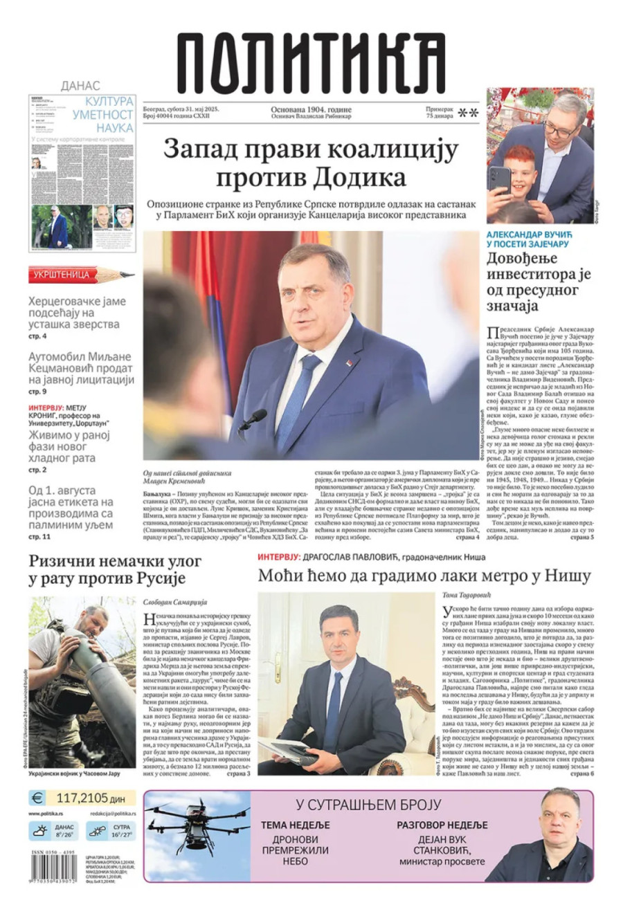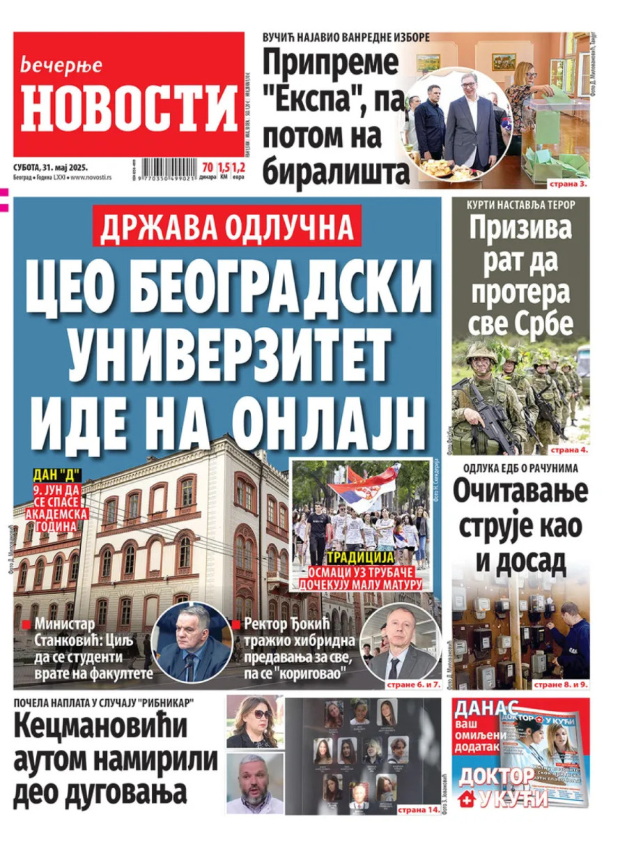 Dnevne novine u Srbiji za subotu, 31. maj 2025. godine, na naslovnim stranama najavljuju brojne aktuelne društveno-političke teme i donose ekskluzivne priče.