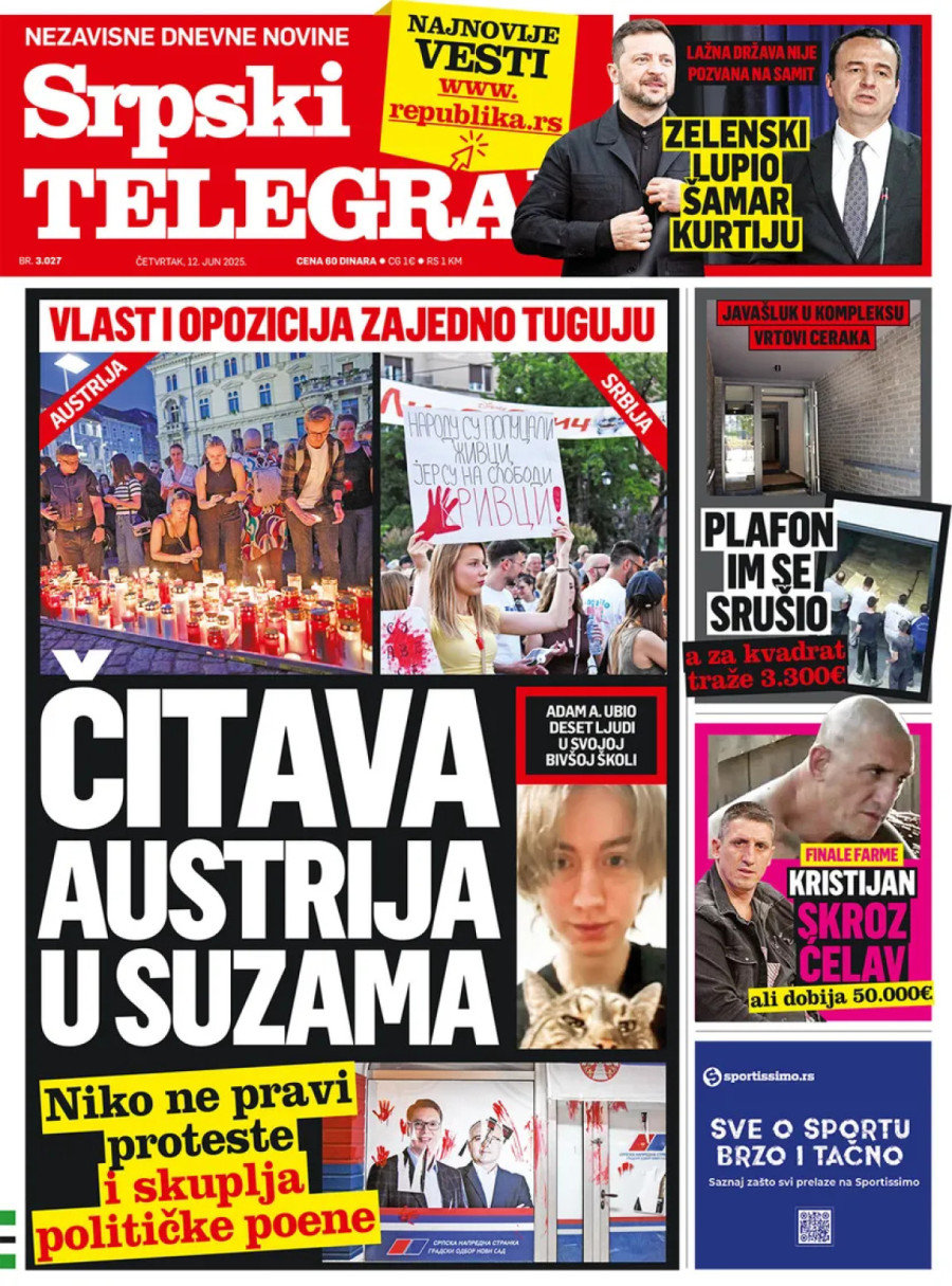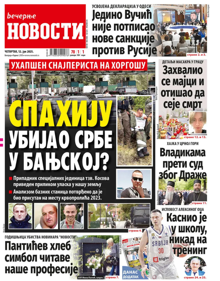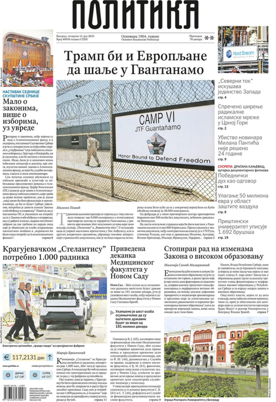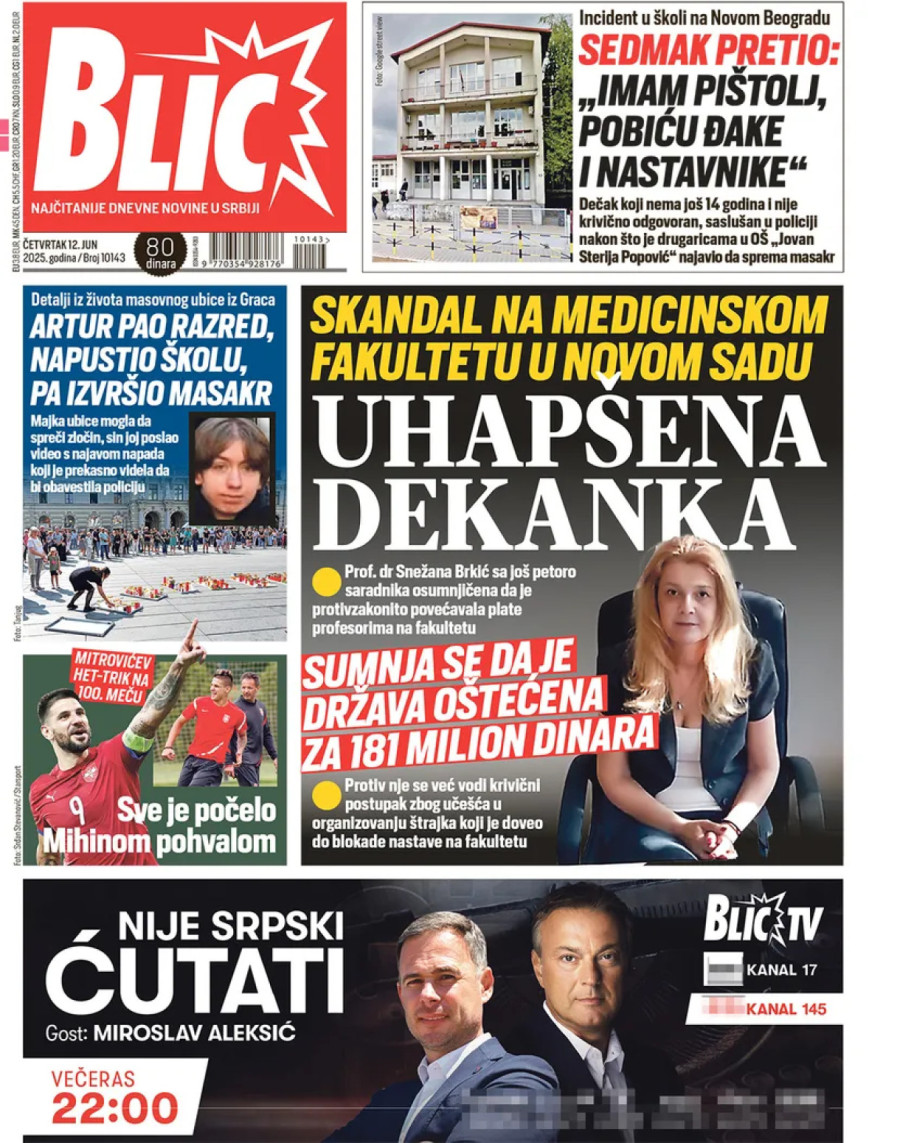 Dnevne novine u Srbiji za četvrtak, 12. jun 2025. godine, na naslovnim stranama donose brojne aktuelne društveno-političke teme i ekskluzivne priče.