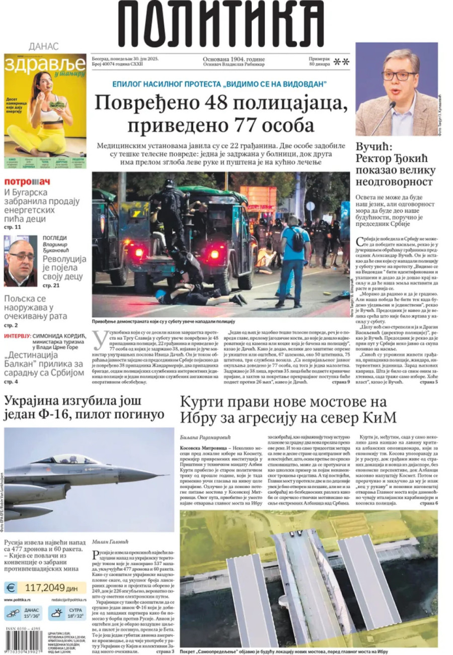 Dnevne novine u Srbiji za ponedeljak, 30. jun 2025. godine