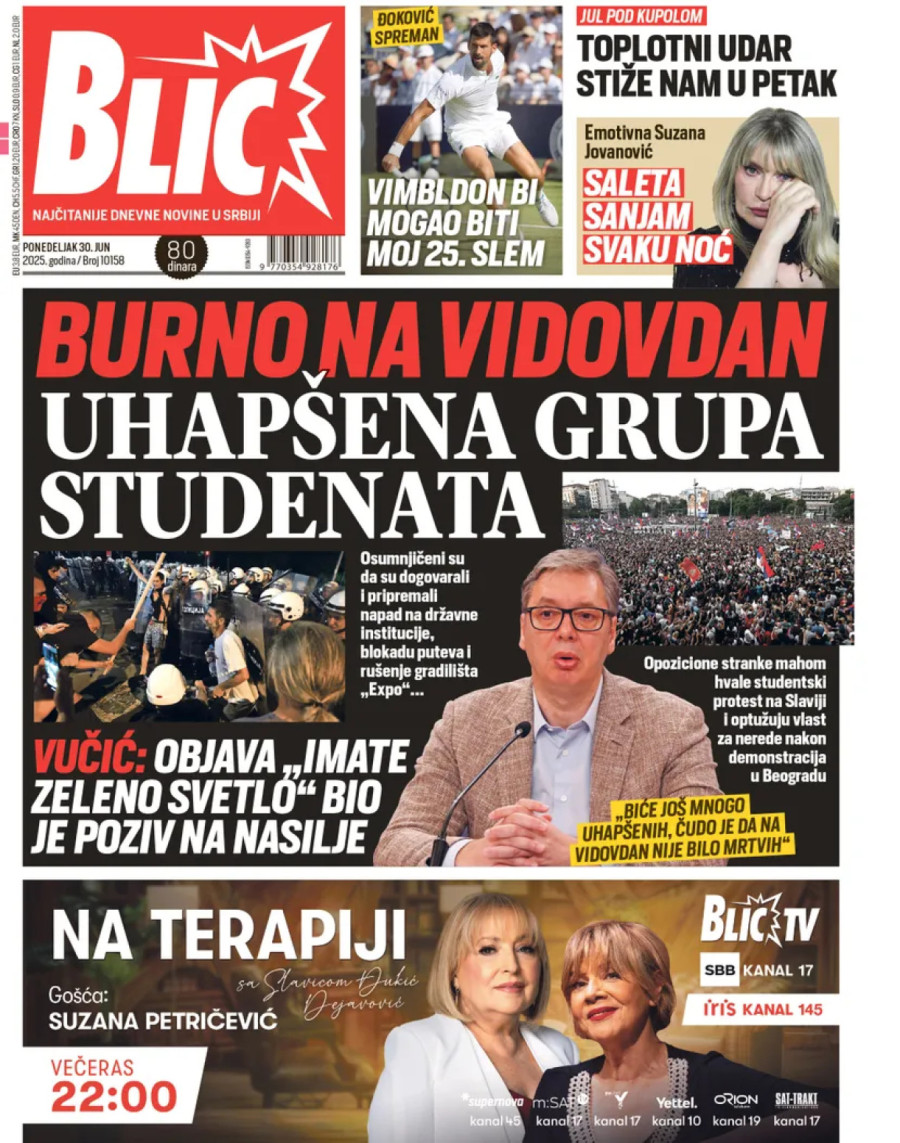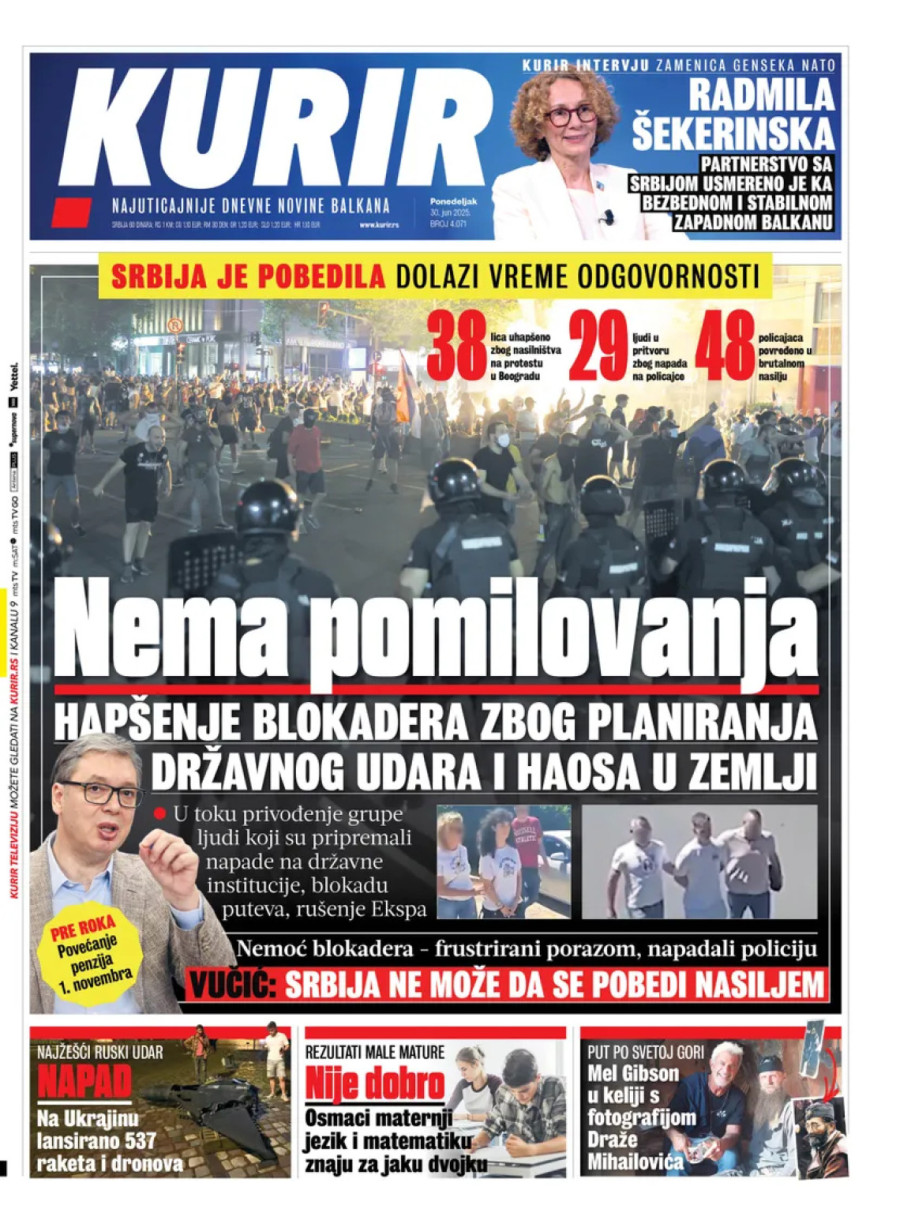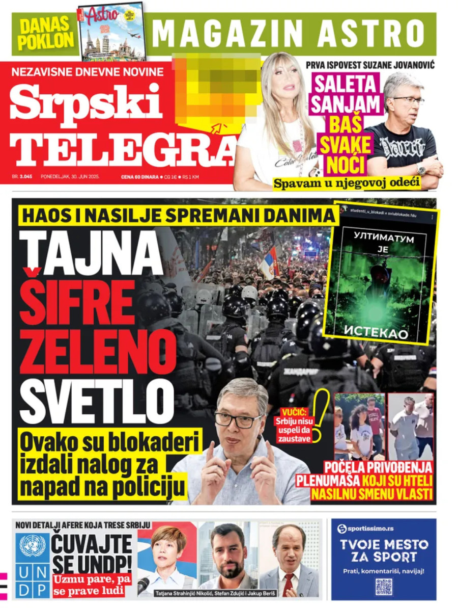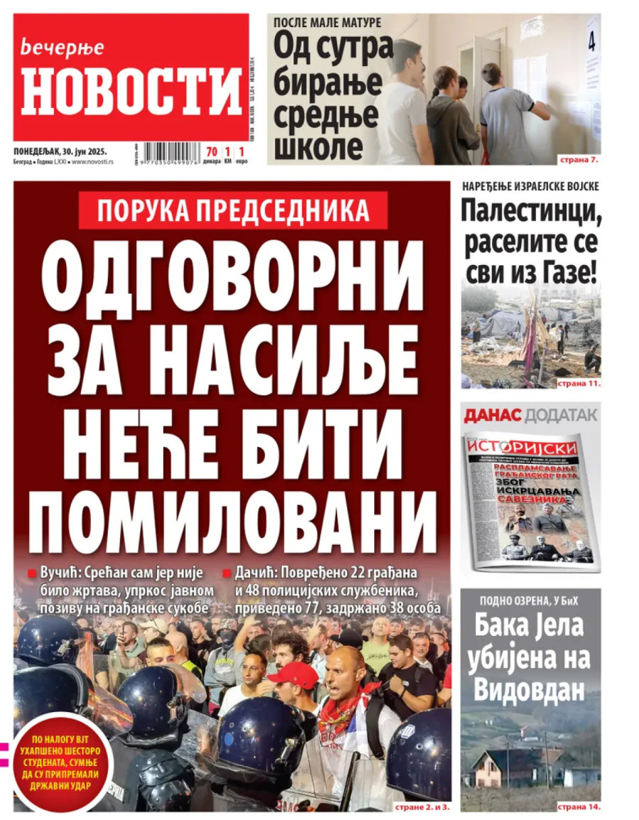 Dnevne novine u Srbiji za ponedeljak, 30. jun 2025. godine, na naslovnim stranama najavljuju brojne aktuelne društveno-političke teme i donose eksluzivne priče.