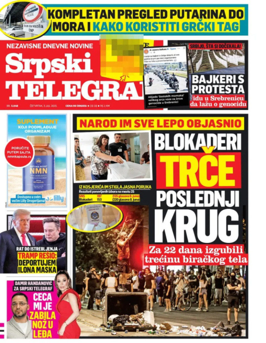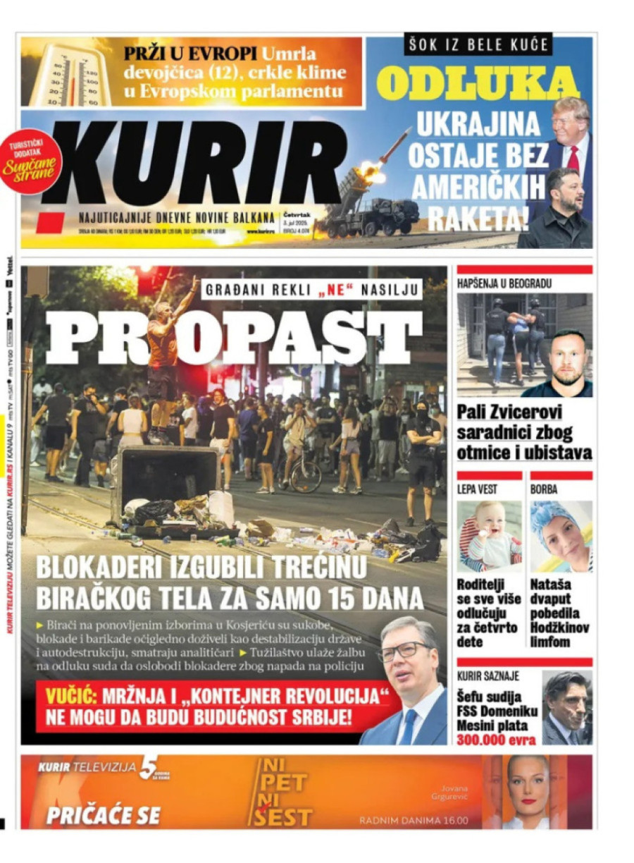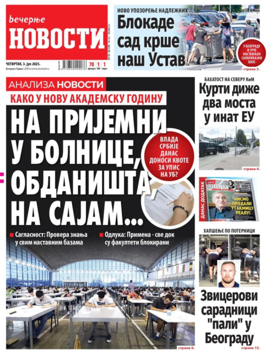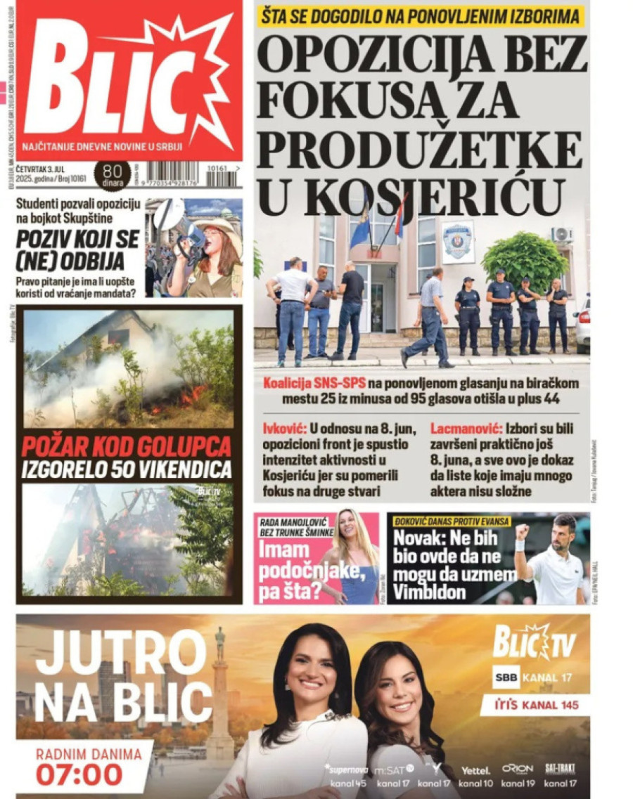 Dnevne novine u Srbiji za četvrtak, 3. jul 2025. godine, na naslovnim stranama najavljuju brojne aktuelne društveno-političke teme i donose eksluzivne priče.