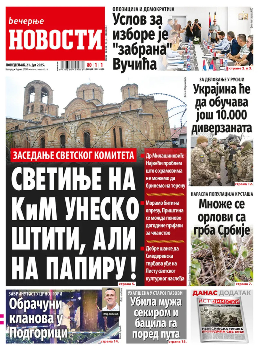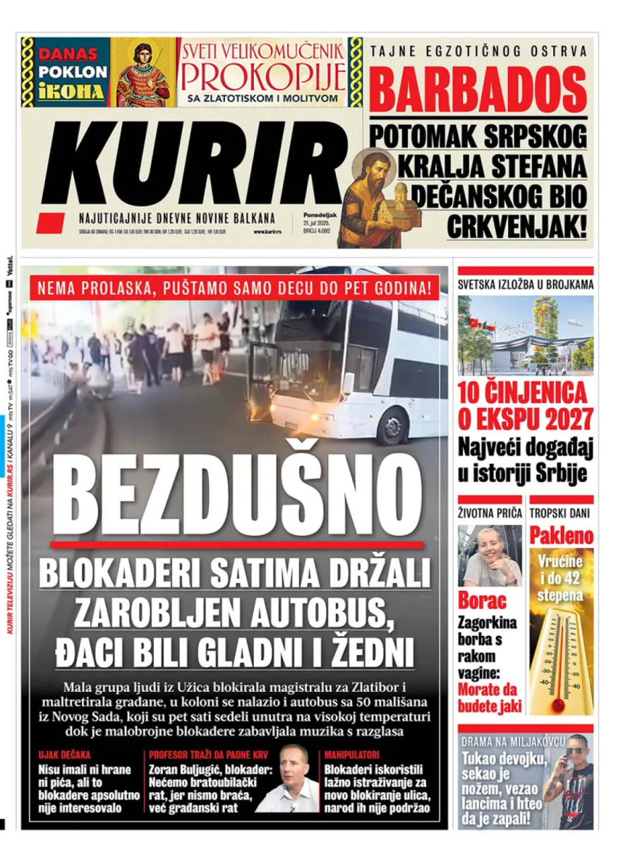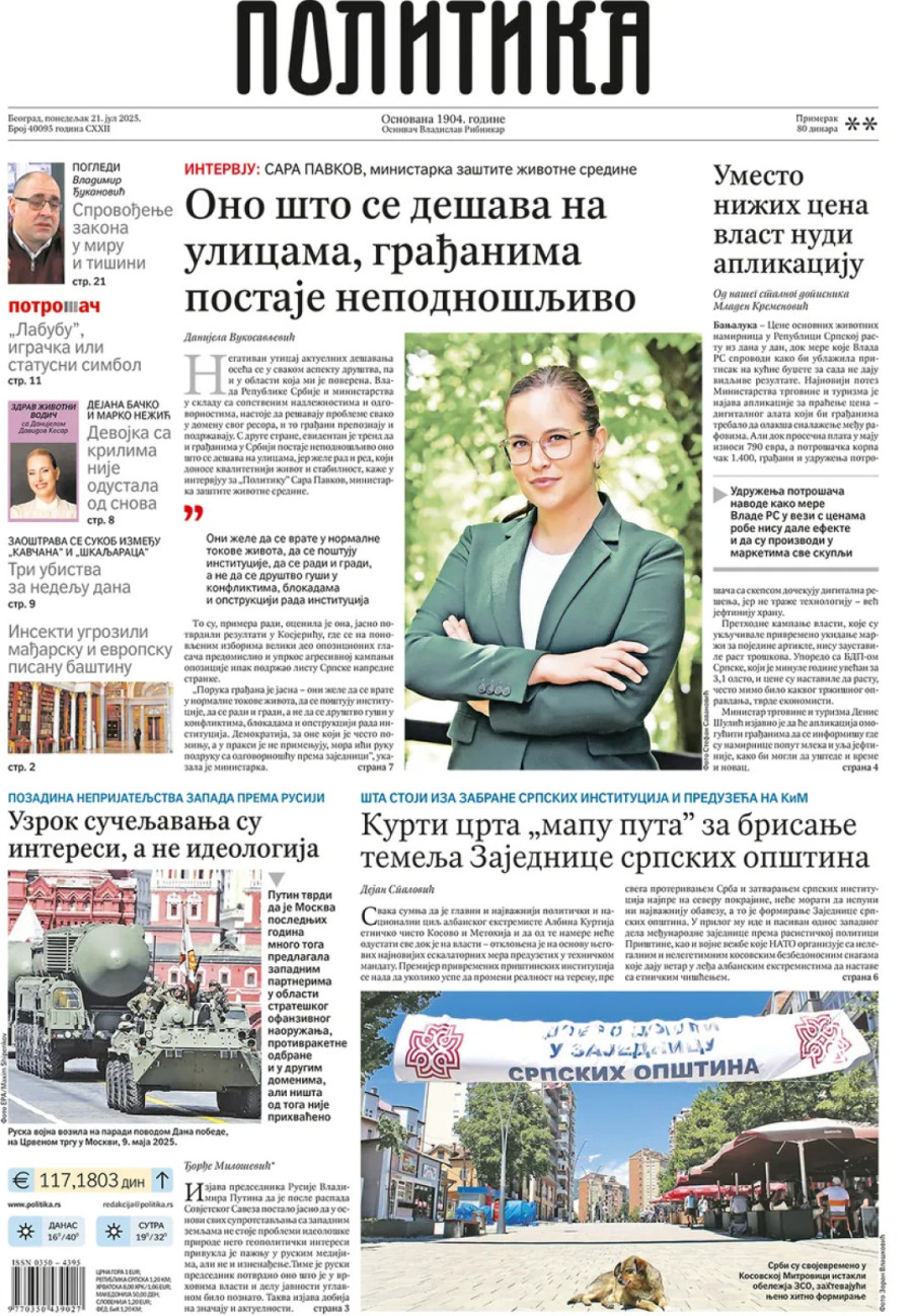 Dnevne novine u Srbiji za ponedeljak, 21. jul 2025. godine, na naslovnim stranama donose brojne aktuelne društveno-političke teme i eksluzivne priče.