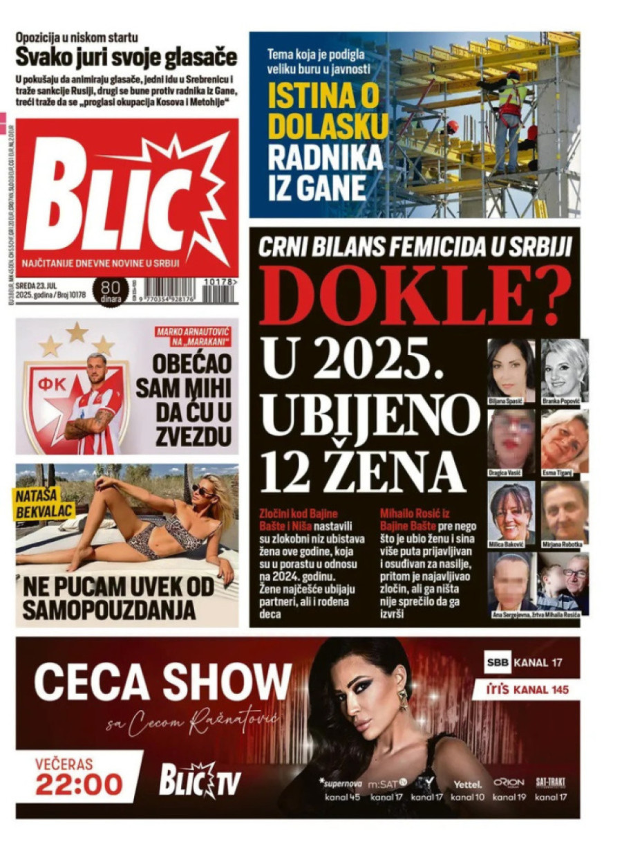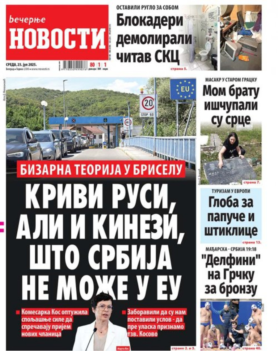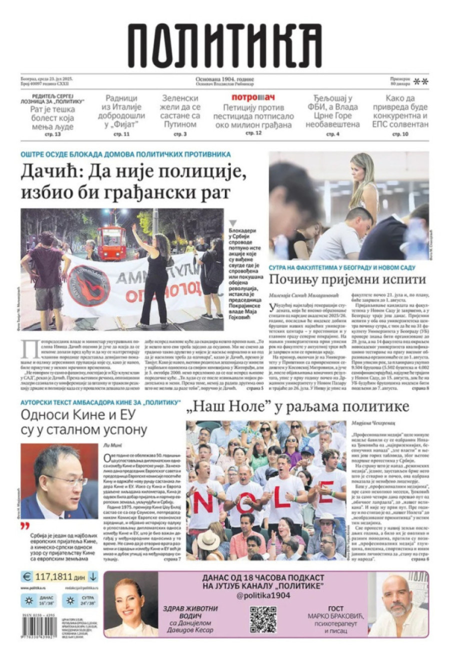 Dnevne novine u Srbiji za sredu, 23. jul 2025. godine, na naslovnim stranama donose brojne aktuelne društveno-političke teme i eksluzivne priče.