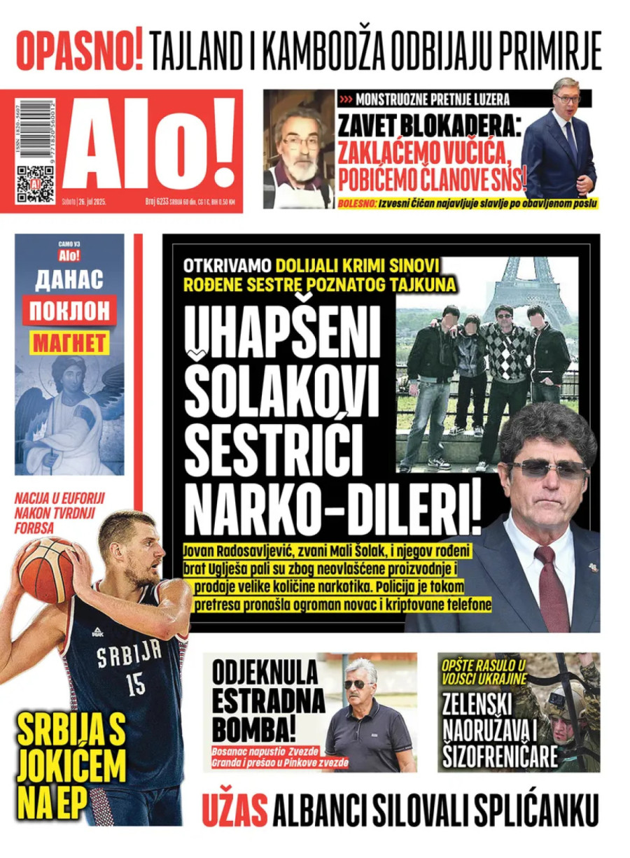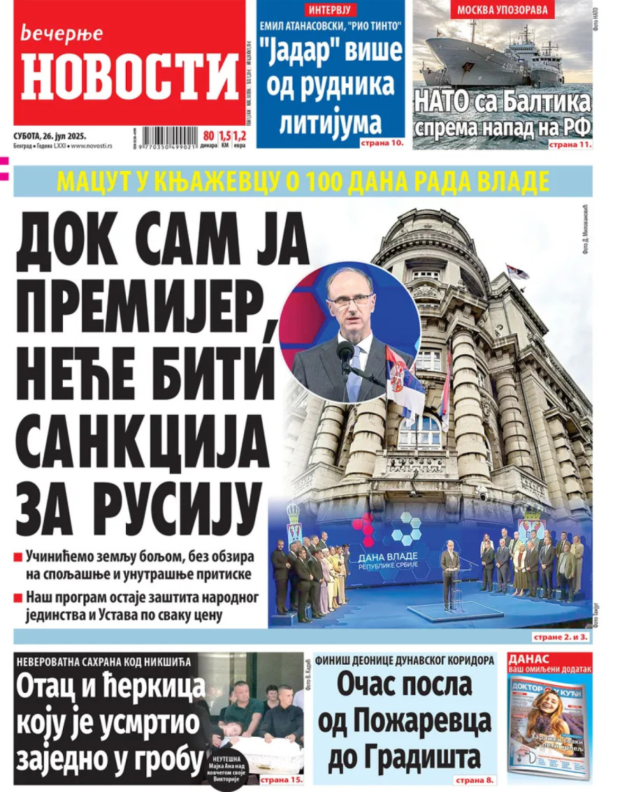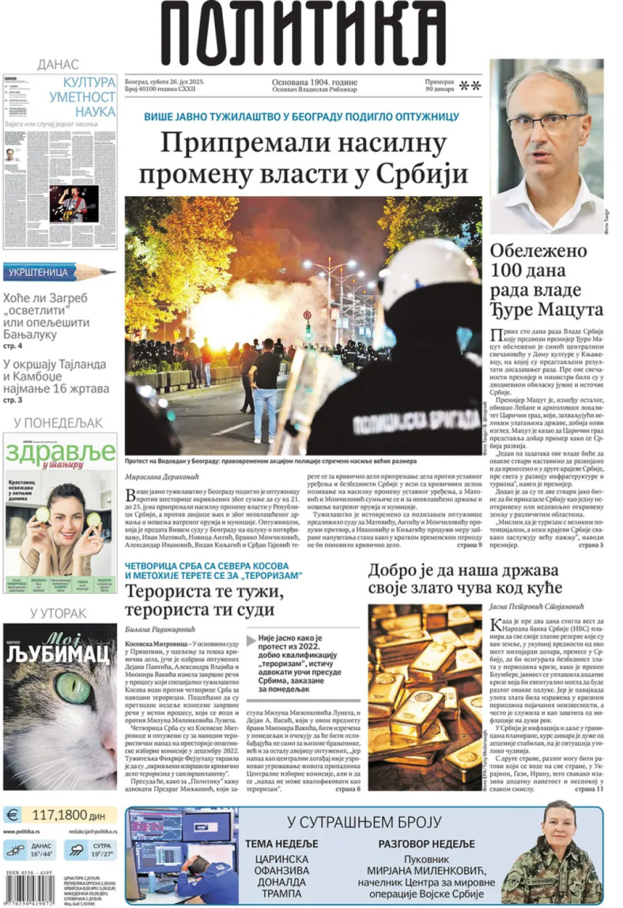 Dnevne novine u Srbiji za subotu, 26. jul 2025. godine, na naslovnim stranama najavljuju brojne aktuelne društveno-političke teme i donose eksluzivne priče.