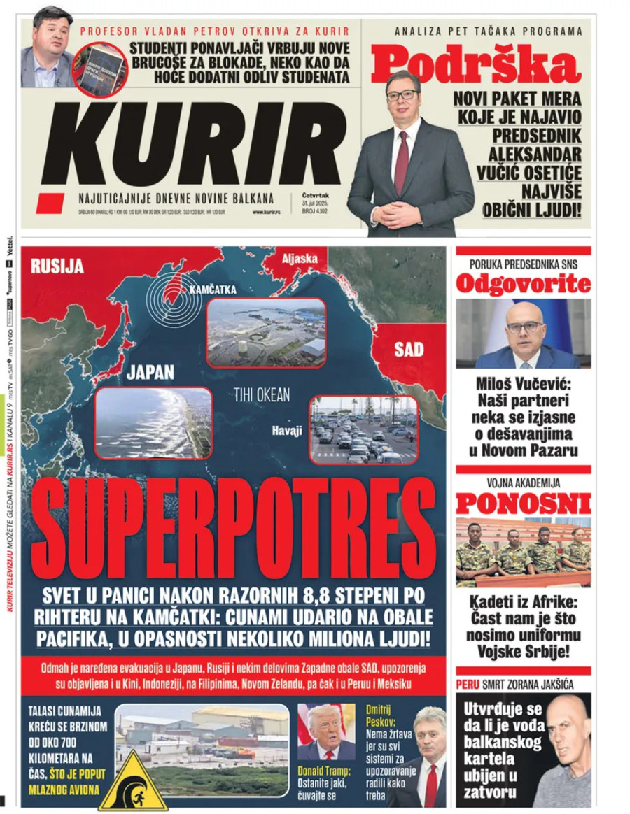 Novine: "Kurti i Ugljanin pale Preševo i Novi Pazar"; "Cunami uplašio čak tri kontinenta"