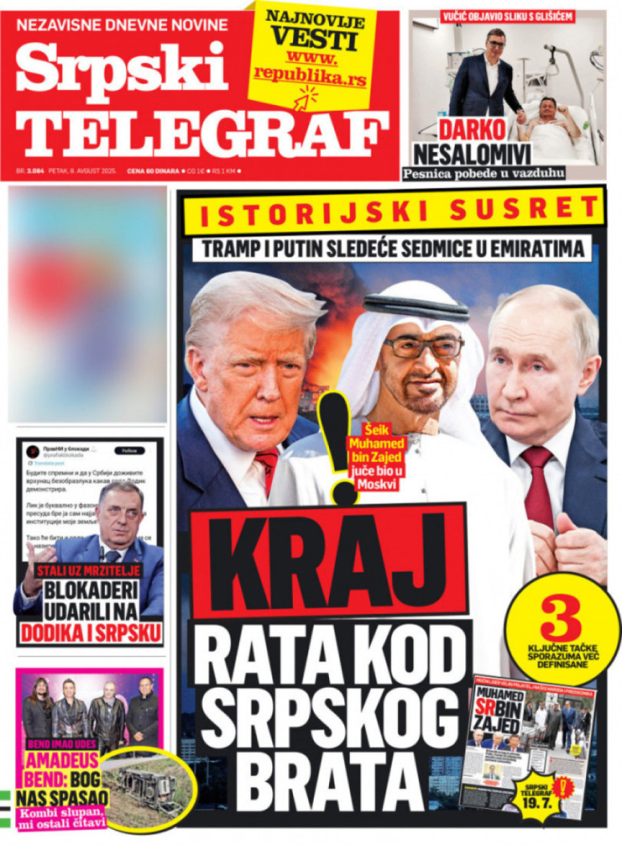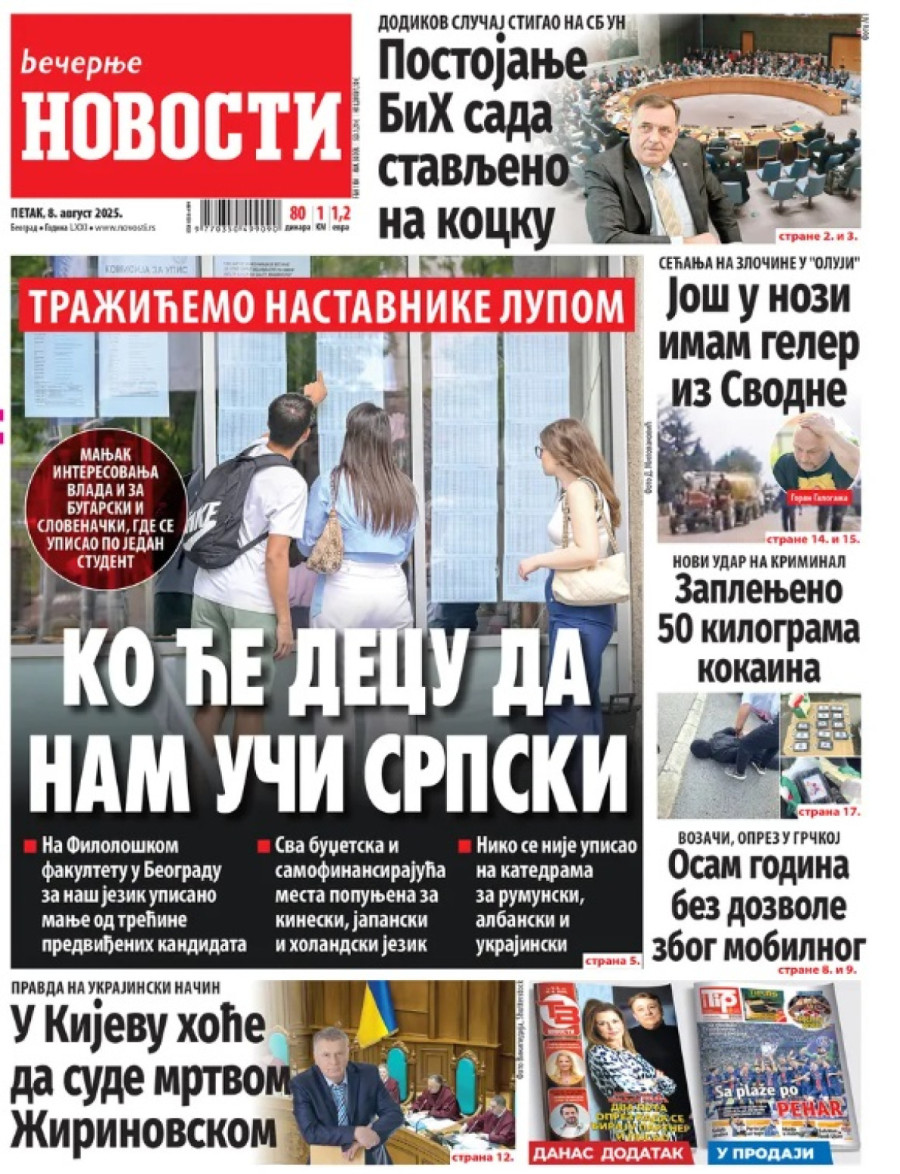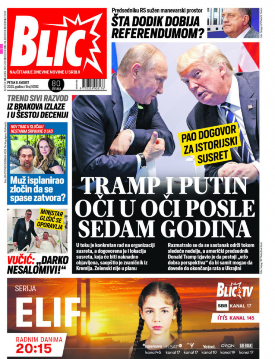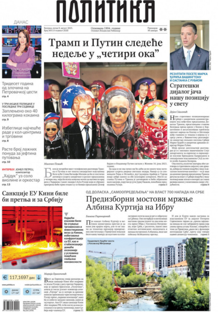 Dnevne novine u Srbiji za petak, 8. avgust 2025. godine na naslovnim stranama najavljuju brojne aktuelne društveno-političke teme i donose eksluzivne priče.