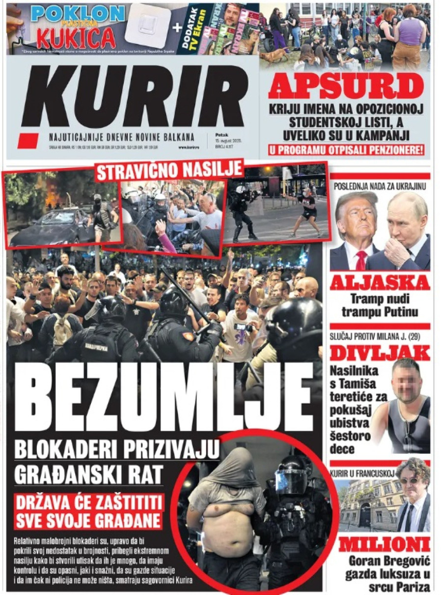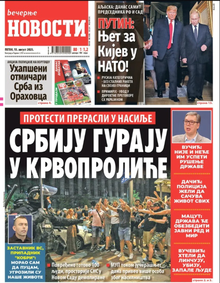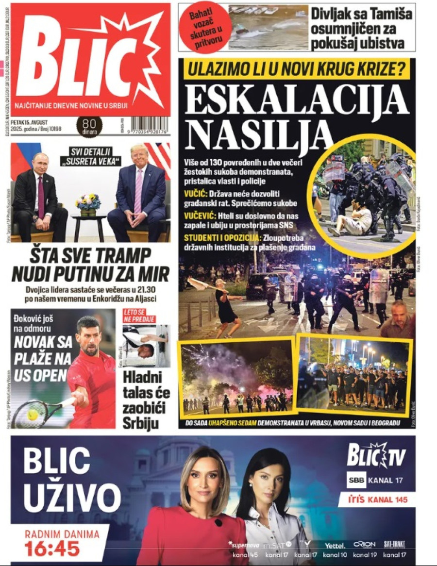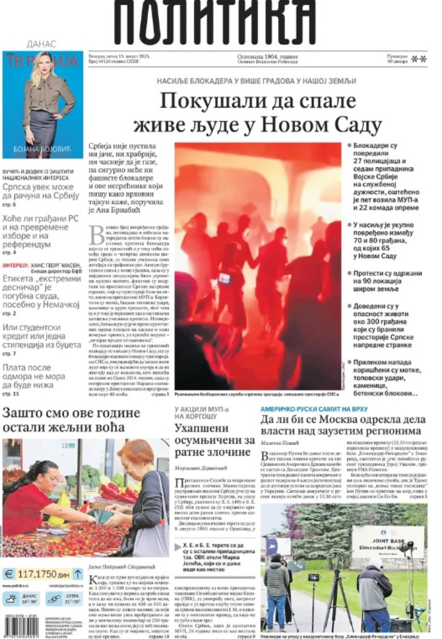 Dnevne novine u Srbiji za petak, 15. avgust 2025. godine na naslovnim stranama najavljuju brojne aktuelne društveno-političke teme i donose eksluzivne priče.