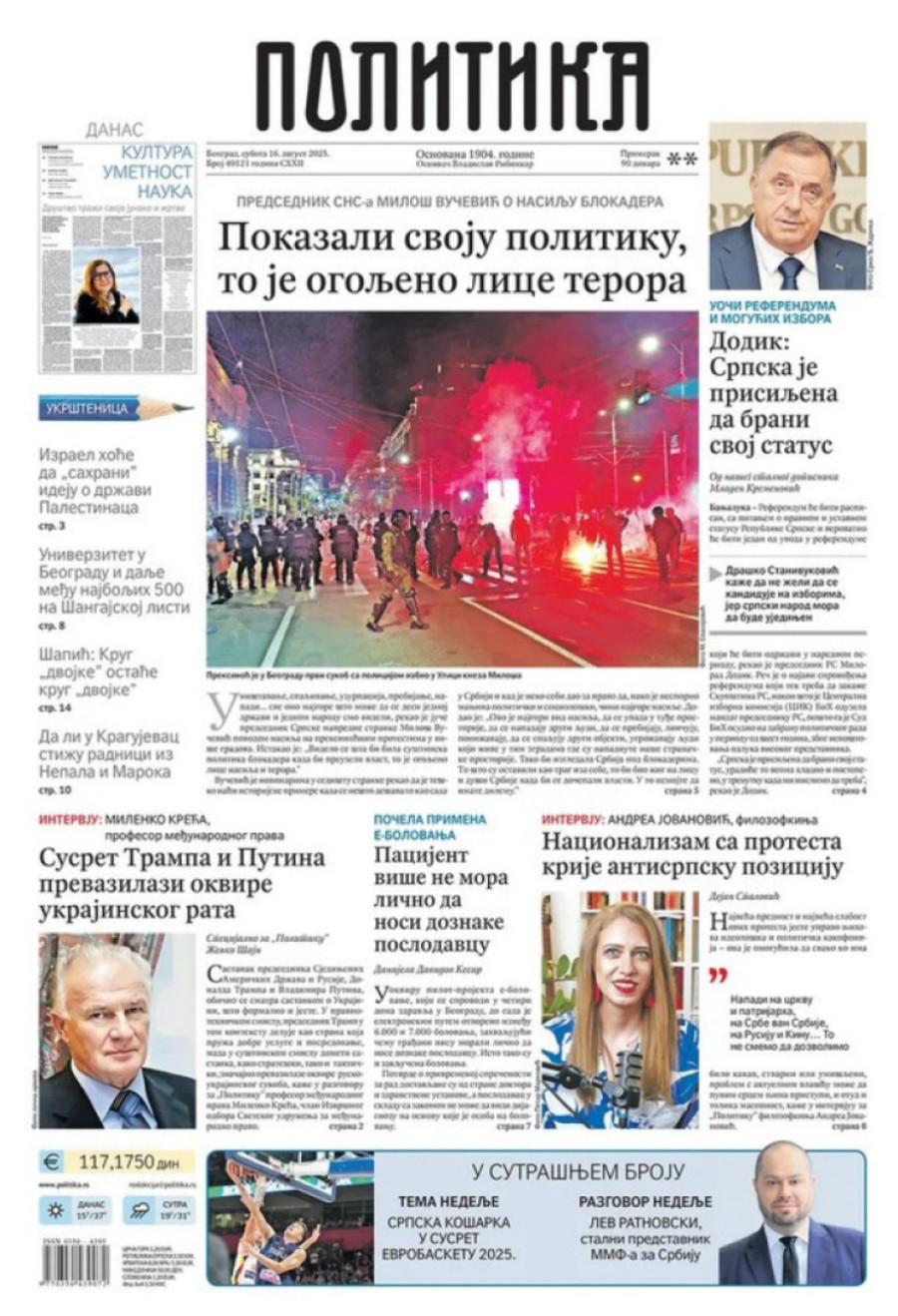 Dnevne novine u Srbiji za subotu, 16. avgust 2025. godine na naslovnim stranama najavljuju brojne aktuelne društveno-političke teme i donose eksluzivne priče.