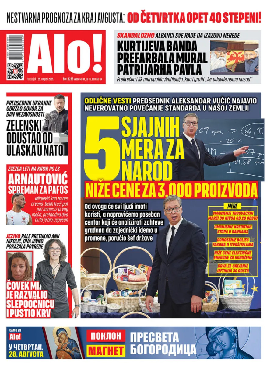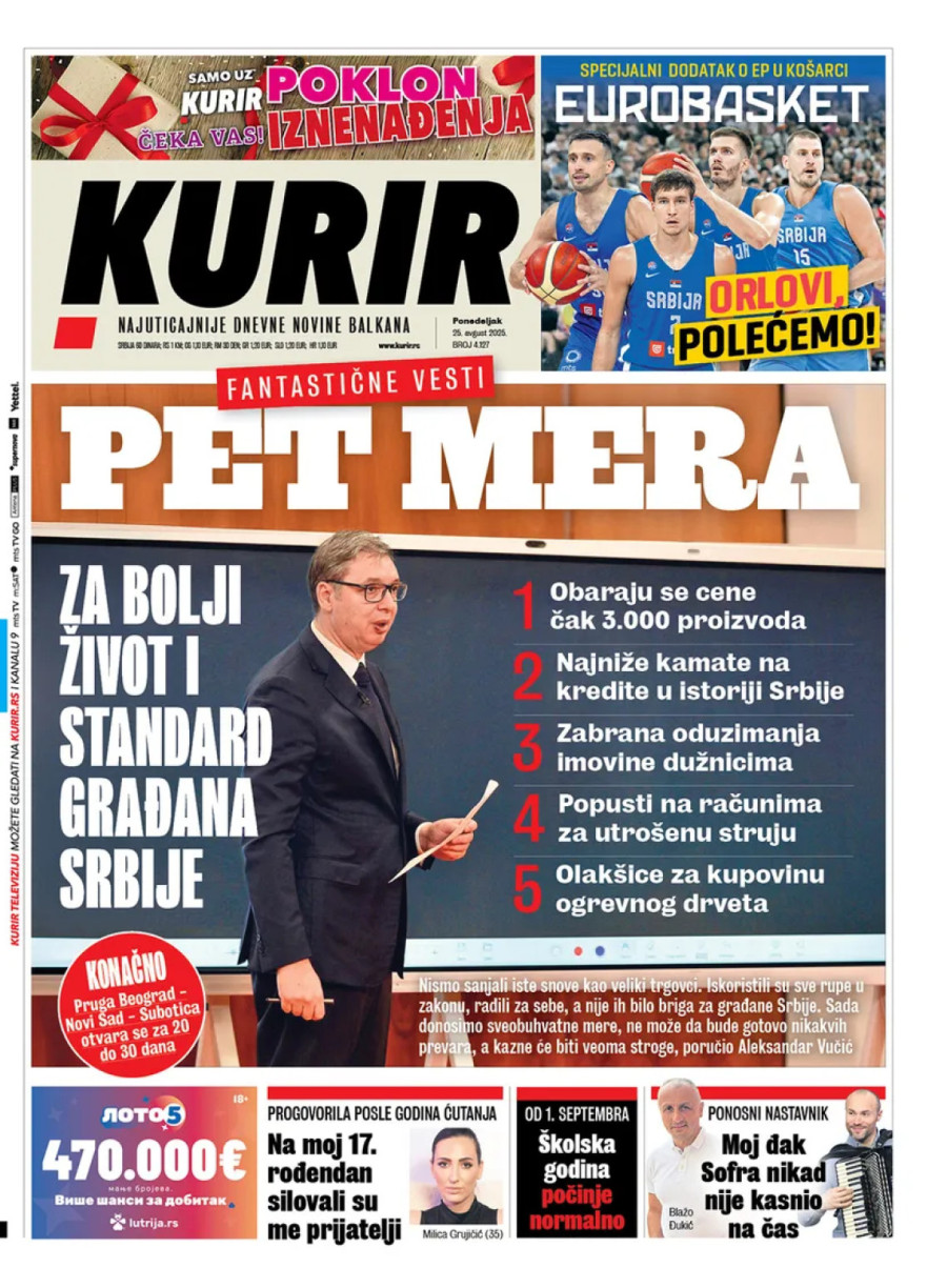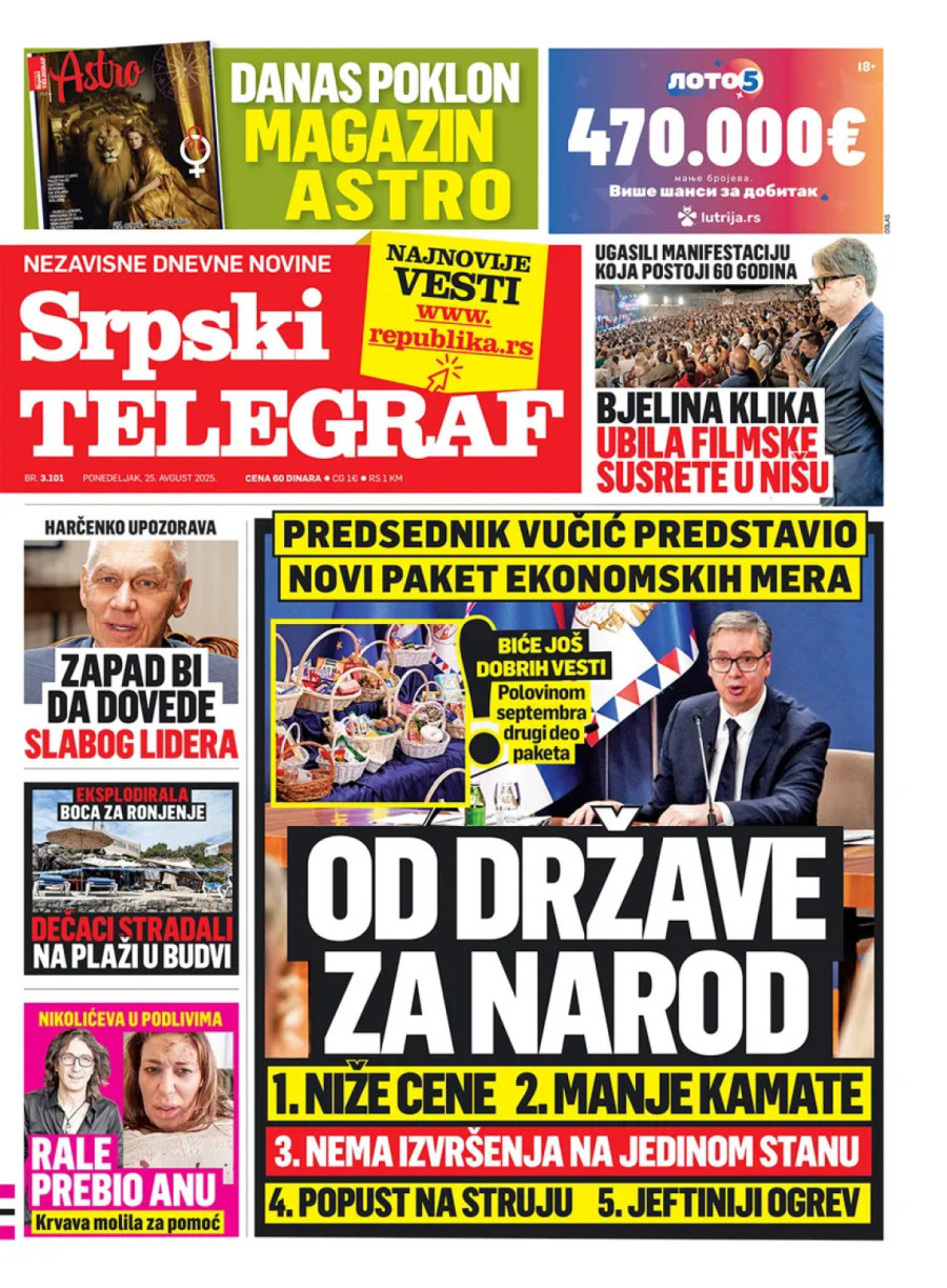 Dnevne novine u Srbiji za ponedeljak, 25. avgust 2025. godine na naslovnim stranama najavljuju brojne aktuelne društveno-političke teme i donose eksluzivne priče.