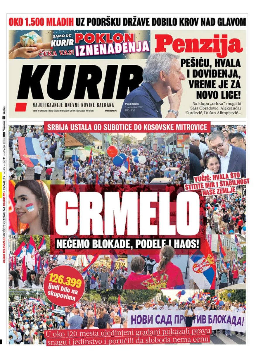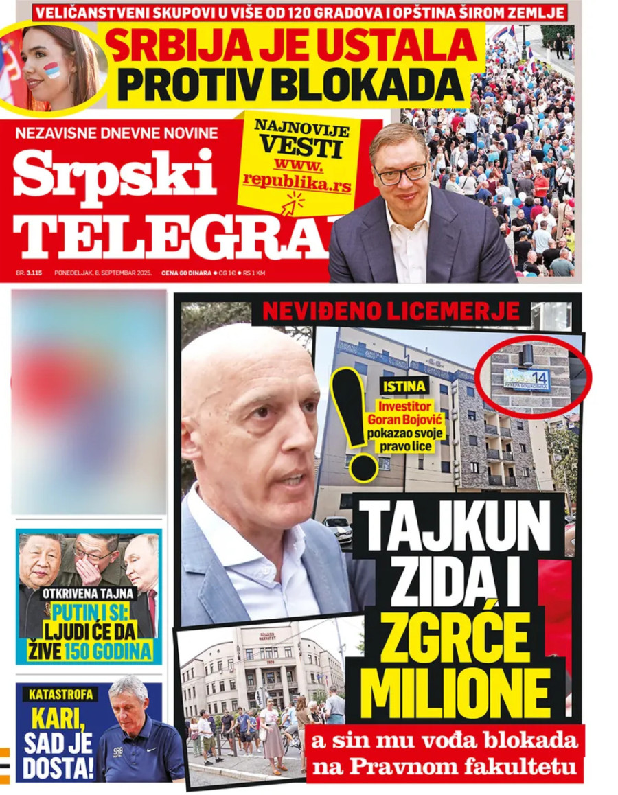 Dnevne novine u Srbiji za ponedeljak, 8. septembar 2025. godine na naslovnim stranama najavljuju brojne aktuelne društveno-političke teme i donose eksluzivne priče.