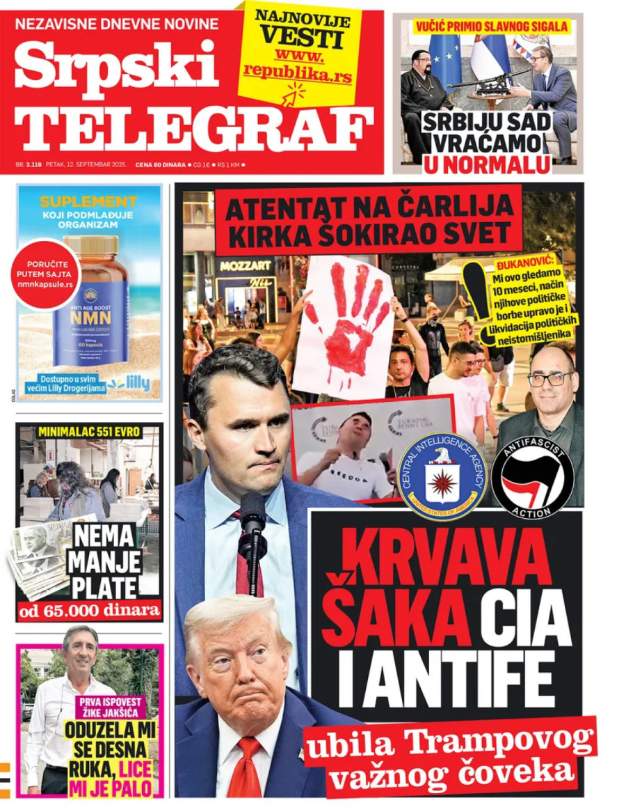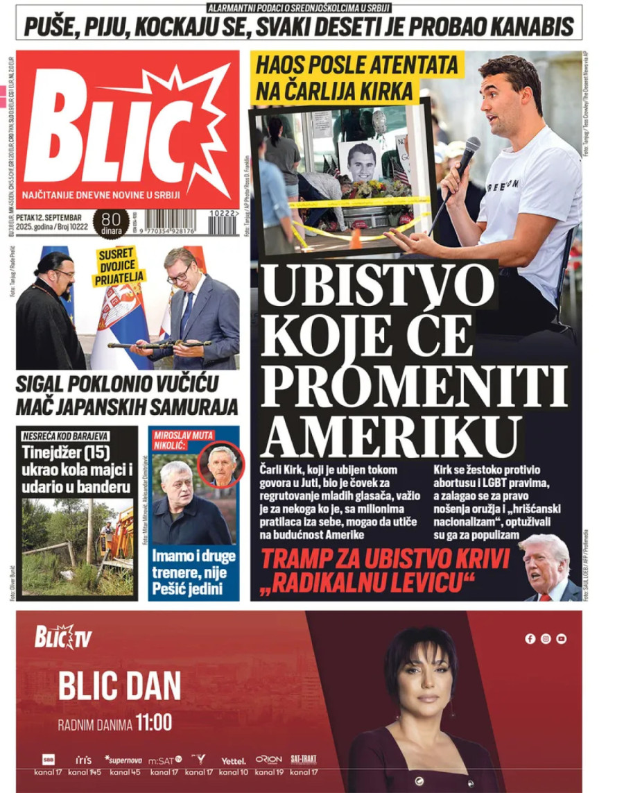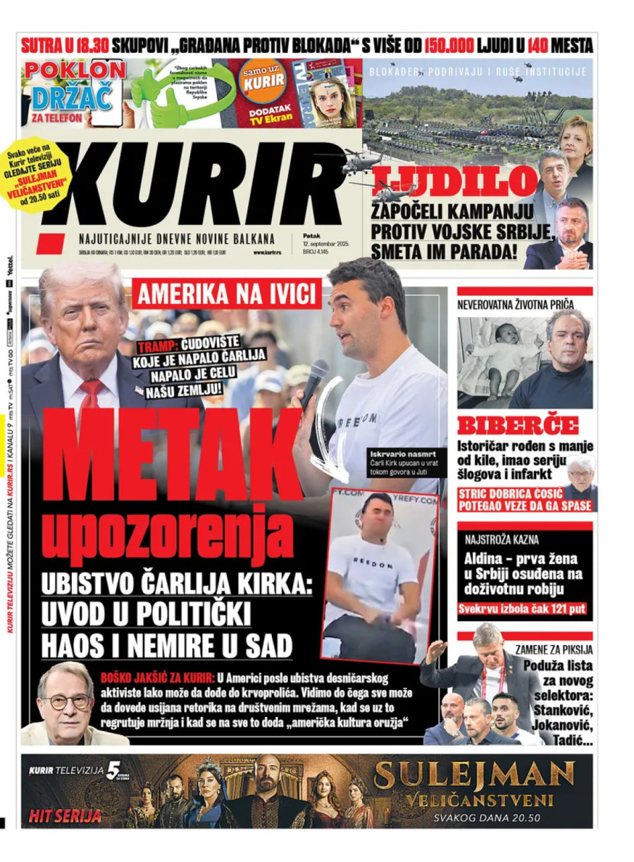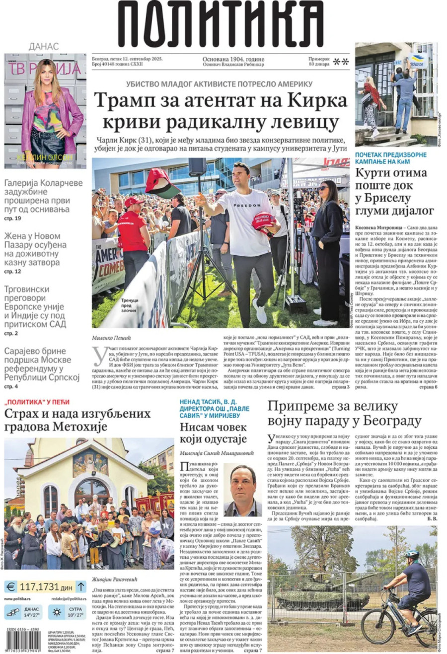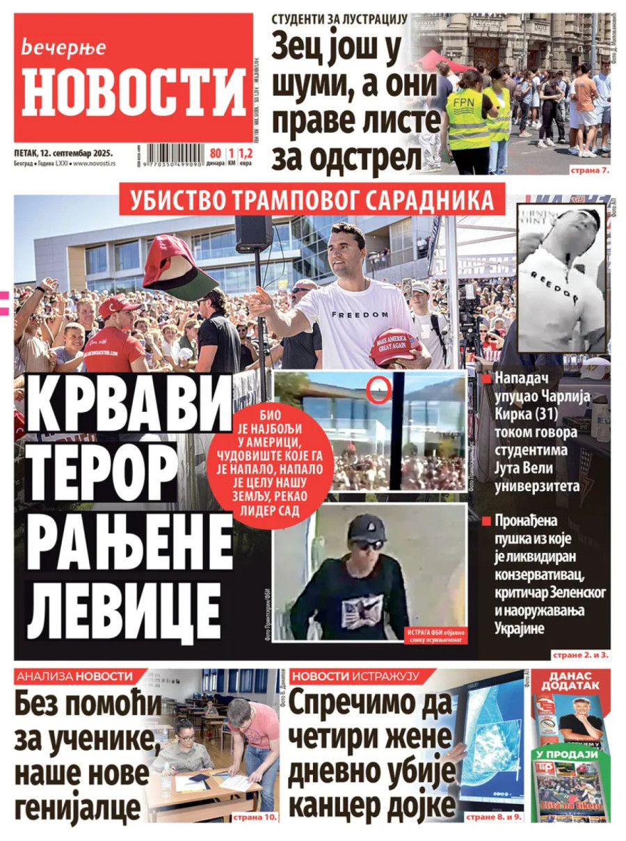 Dnevne novine u Srbiji za petak, 12. septembar 2025. godine na naslovnim stranama donose brojne aktuelne društveno-političke teme i eksluzivne priče.