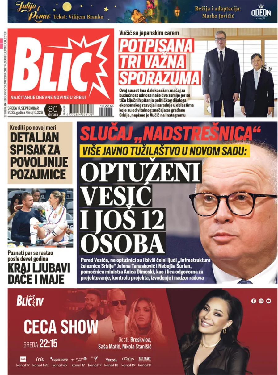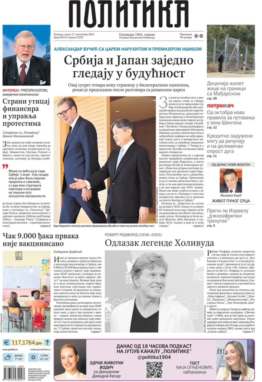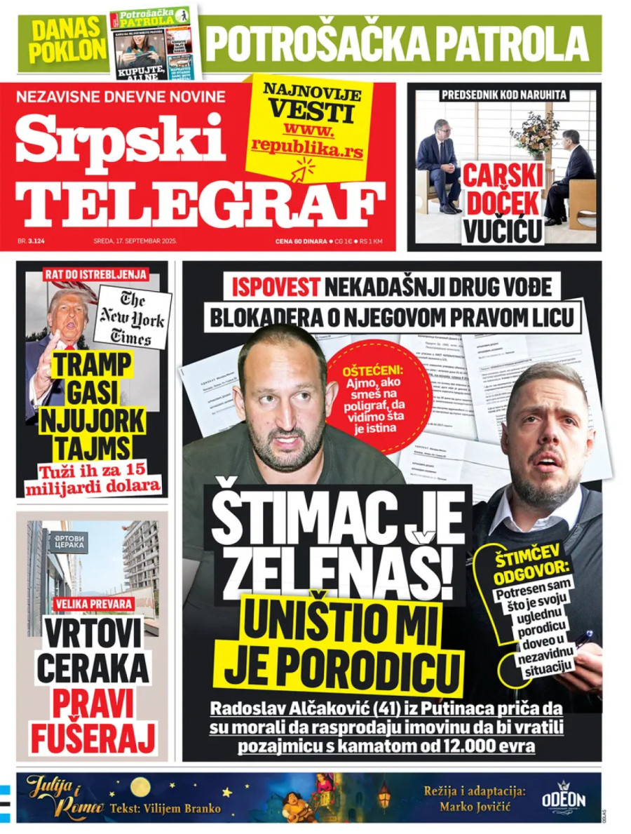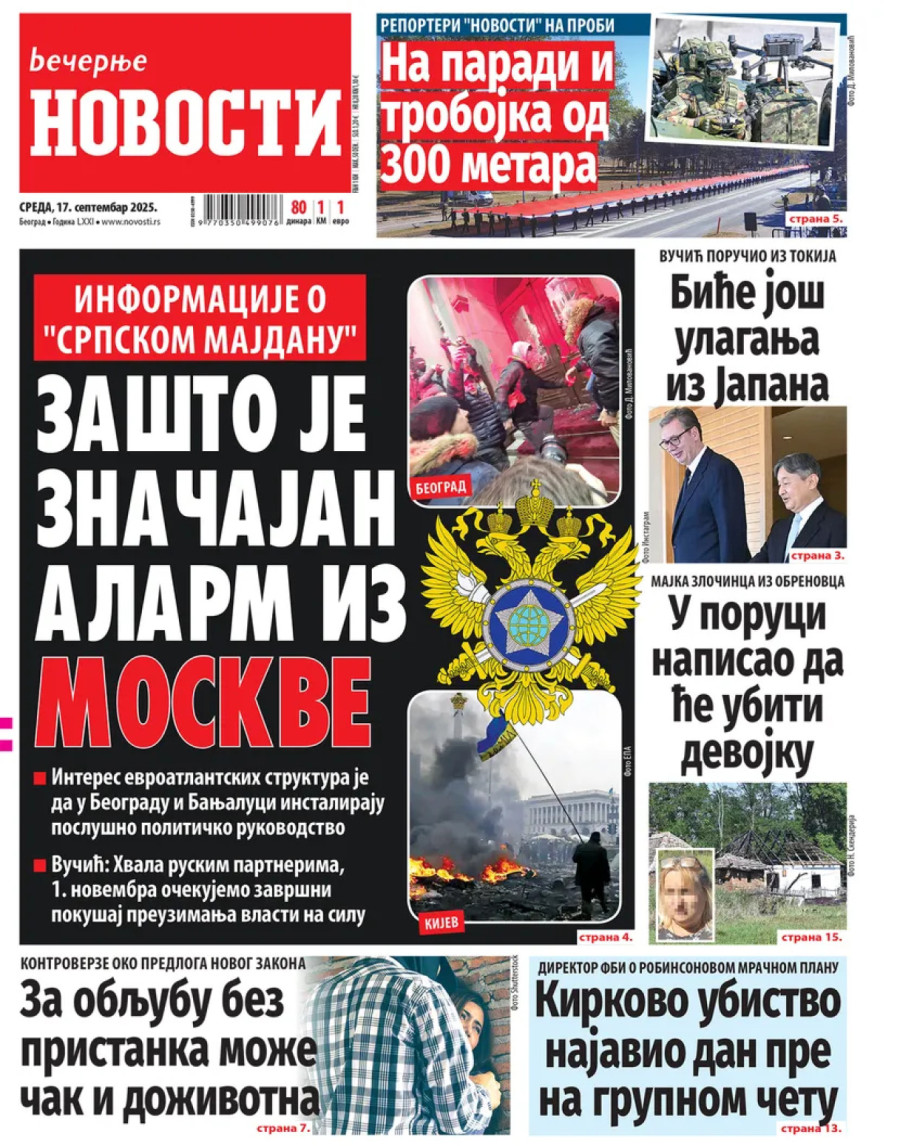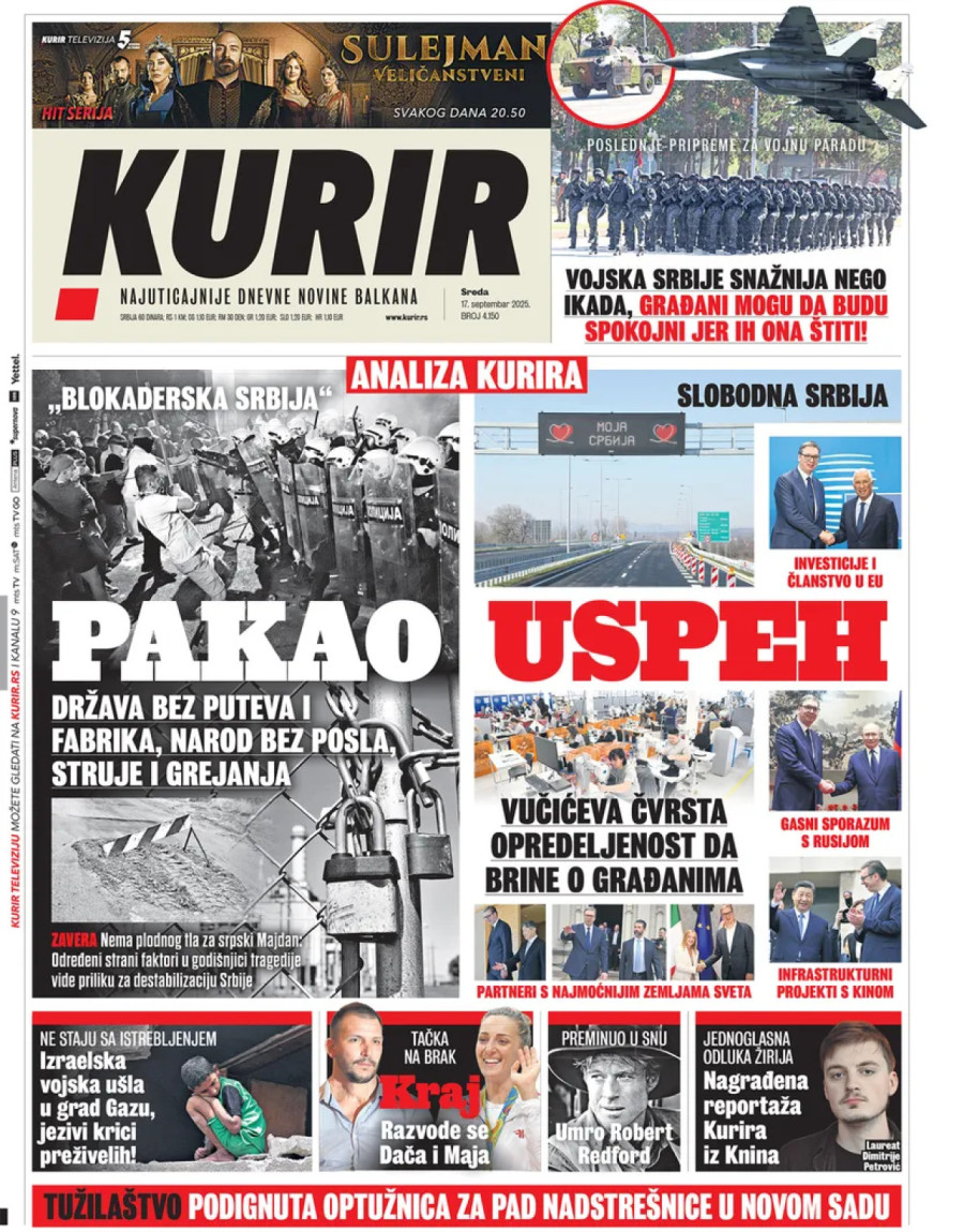 Dnevne novine u Srbiji za sredu, 17. septembar 2025. godine na naslovnim stranama donose brojne aktuelne društveno-političke teme i eksluzivne priče.
