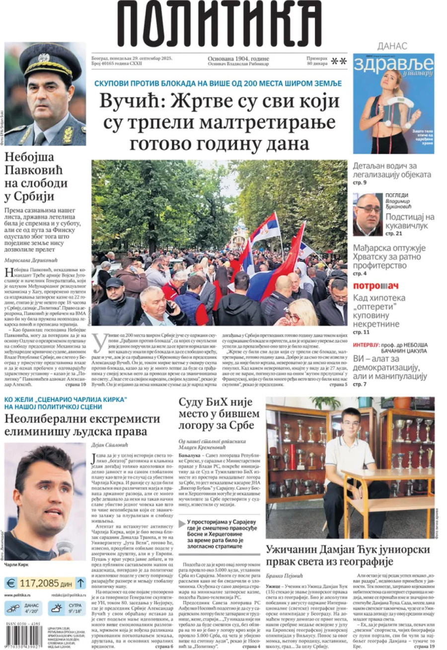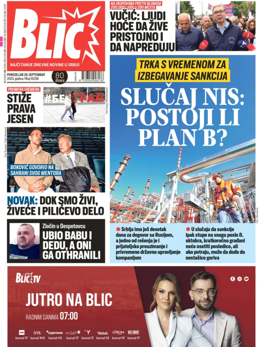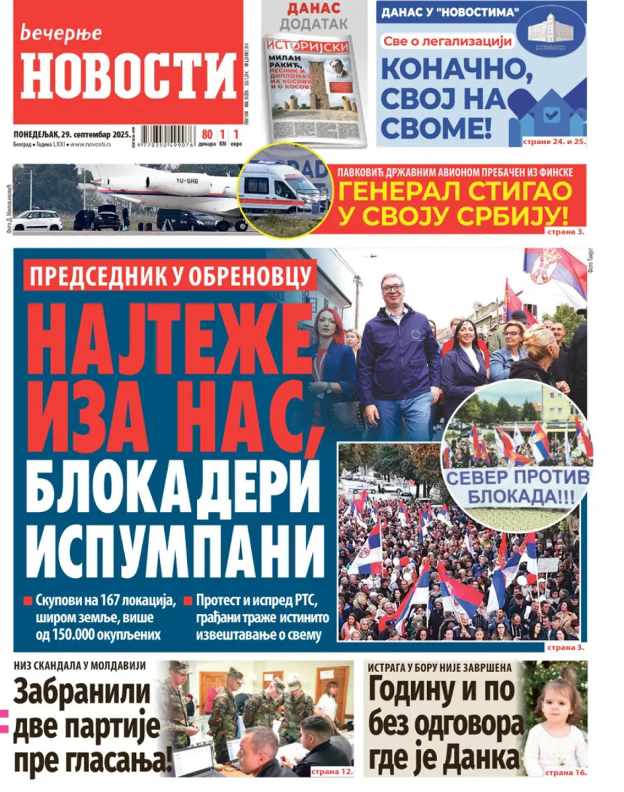 Dnevne novine u Srbiji za ponedeljak, 29. septembar 2025. godine na naslovnim stranama najavljuju brojne aktuelne društveno-političke teme i donose eksluzivne priče.