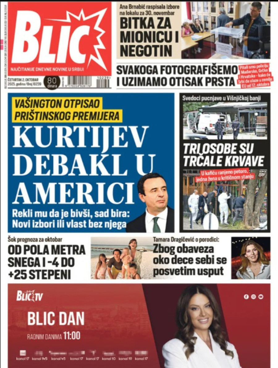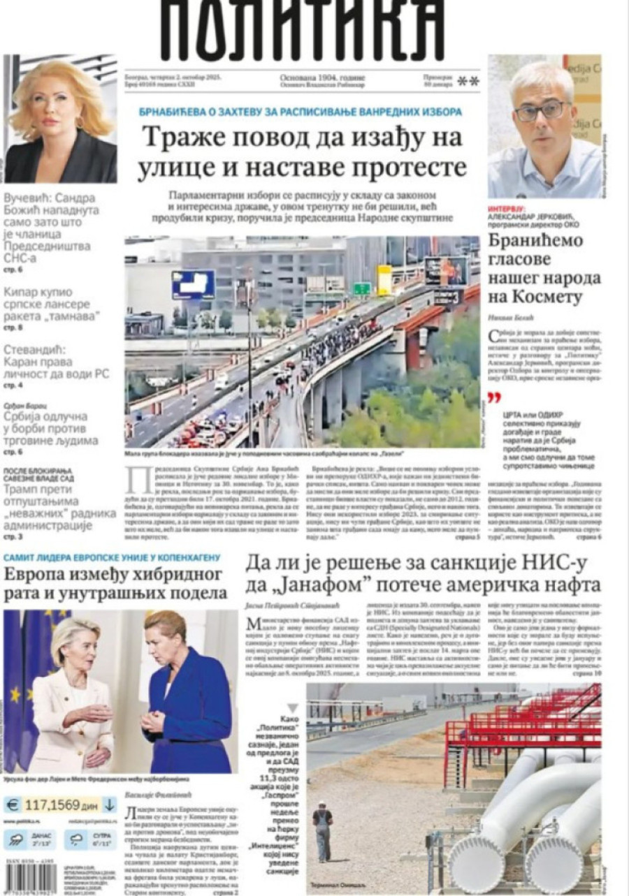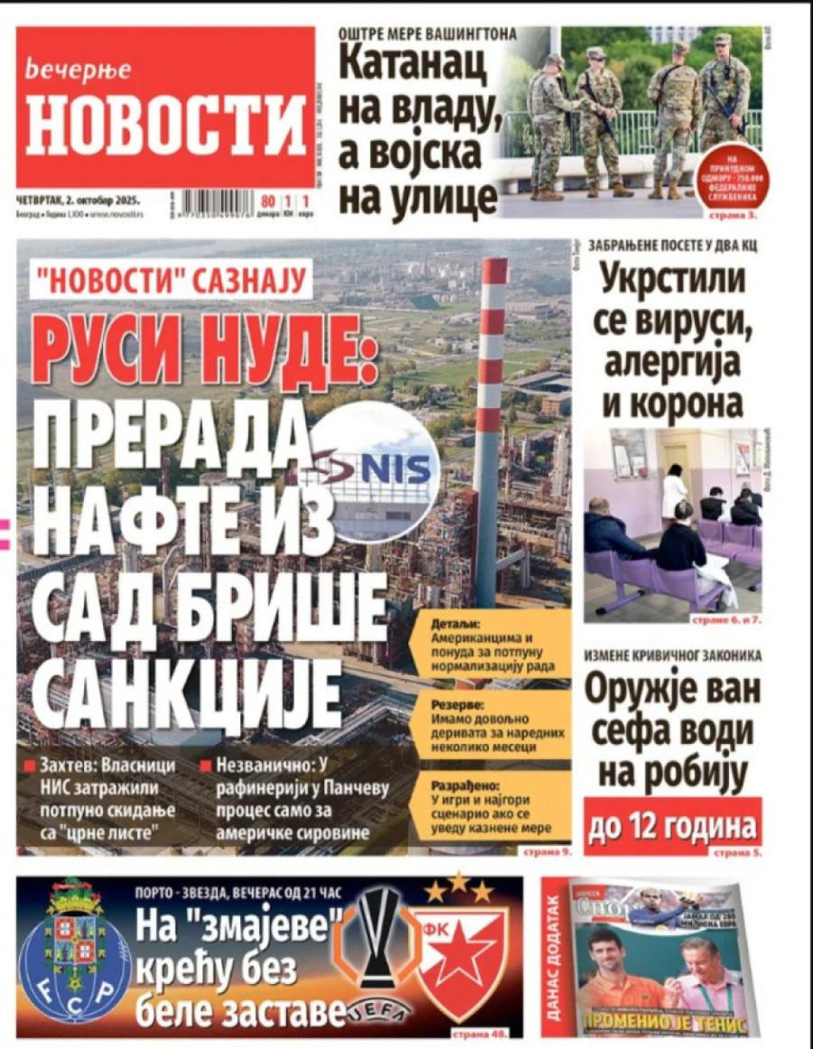 Dnevne novine u Srbiji za četvrtak, 2. oktobar 2025. godine na naslovnim stranama najavljuju brojne aktuelne društveno-političke teme i donose eksluzivne priče.