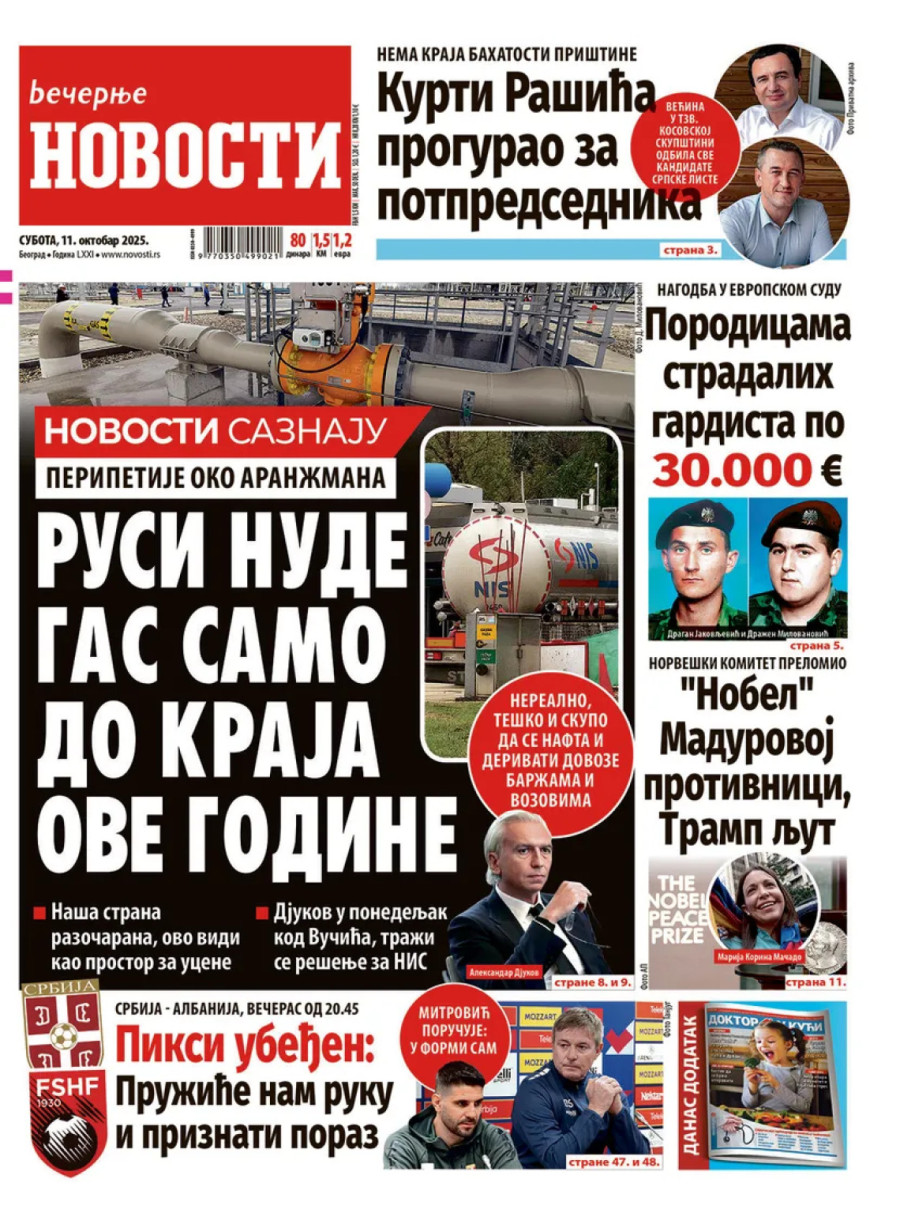Novine: "Trobojka se ponovo zavijorila u Mitrovici"; "Prinudna uprava kuca na vrata NIS"