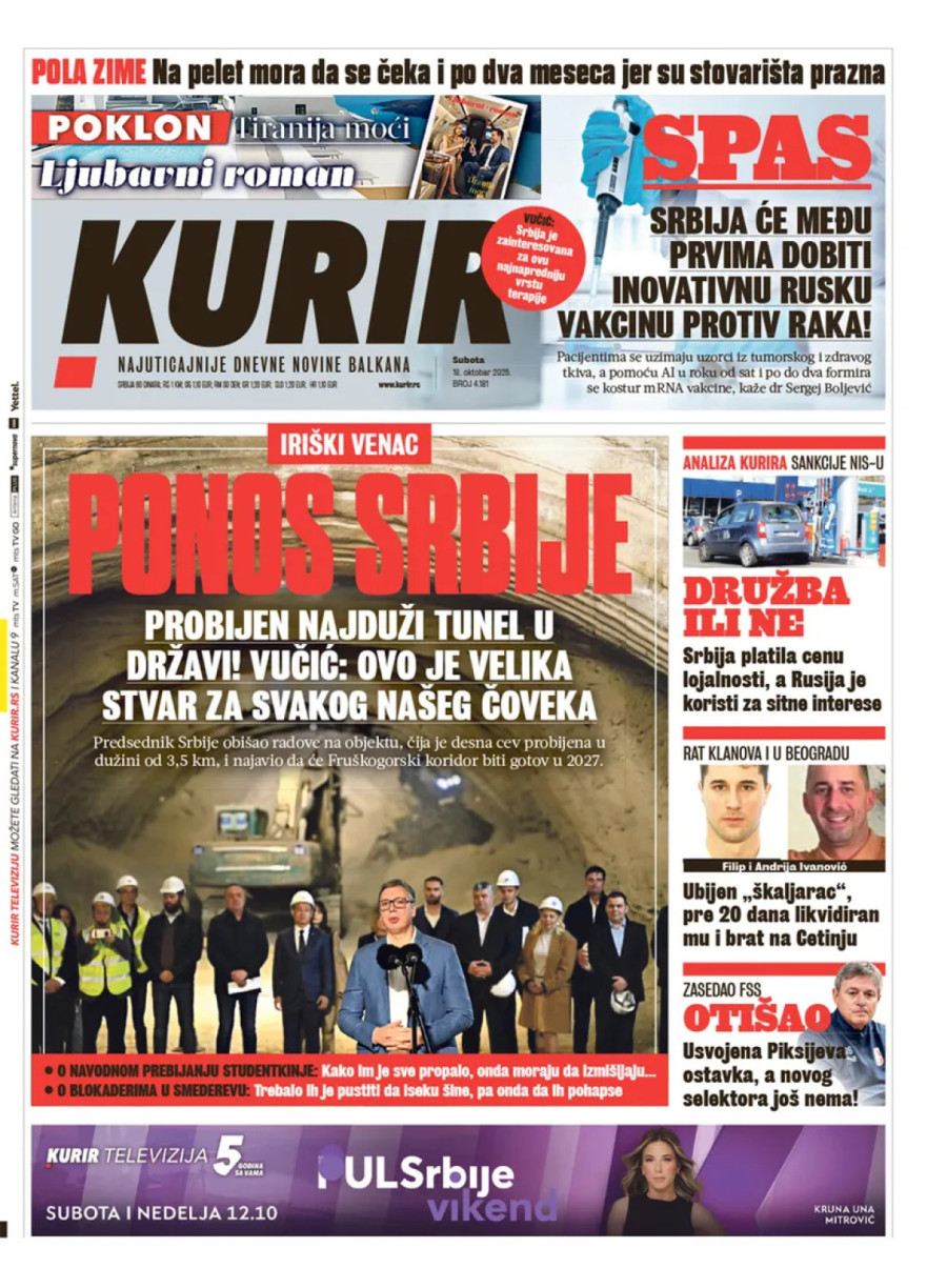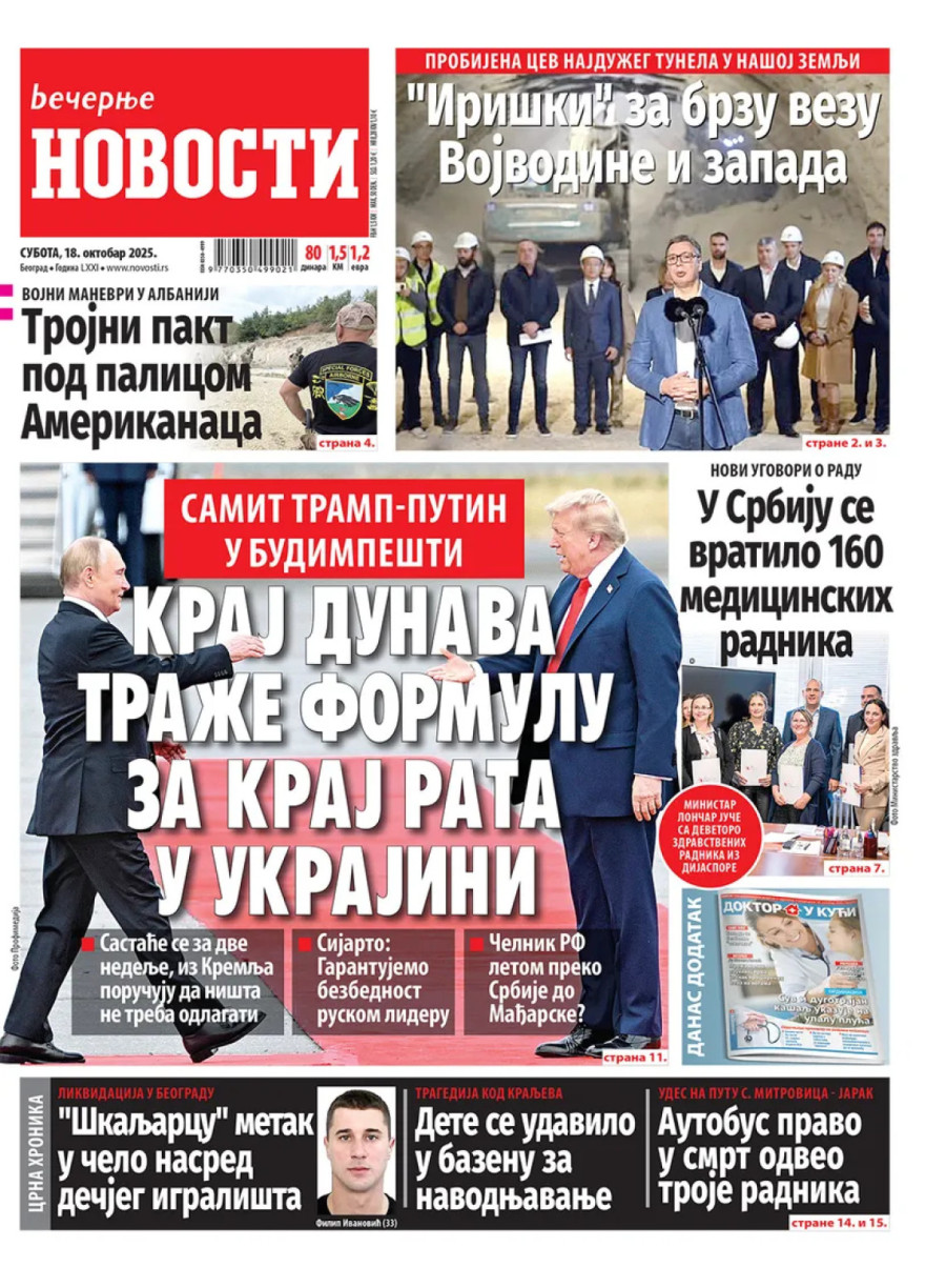 Dnevne novine u Srbiji za subotu, 18. oktobar 2025. godine na naslovnim stranama najavljuju brojne aktuelne društveno-političke teme i donose eksluzivne priče.