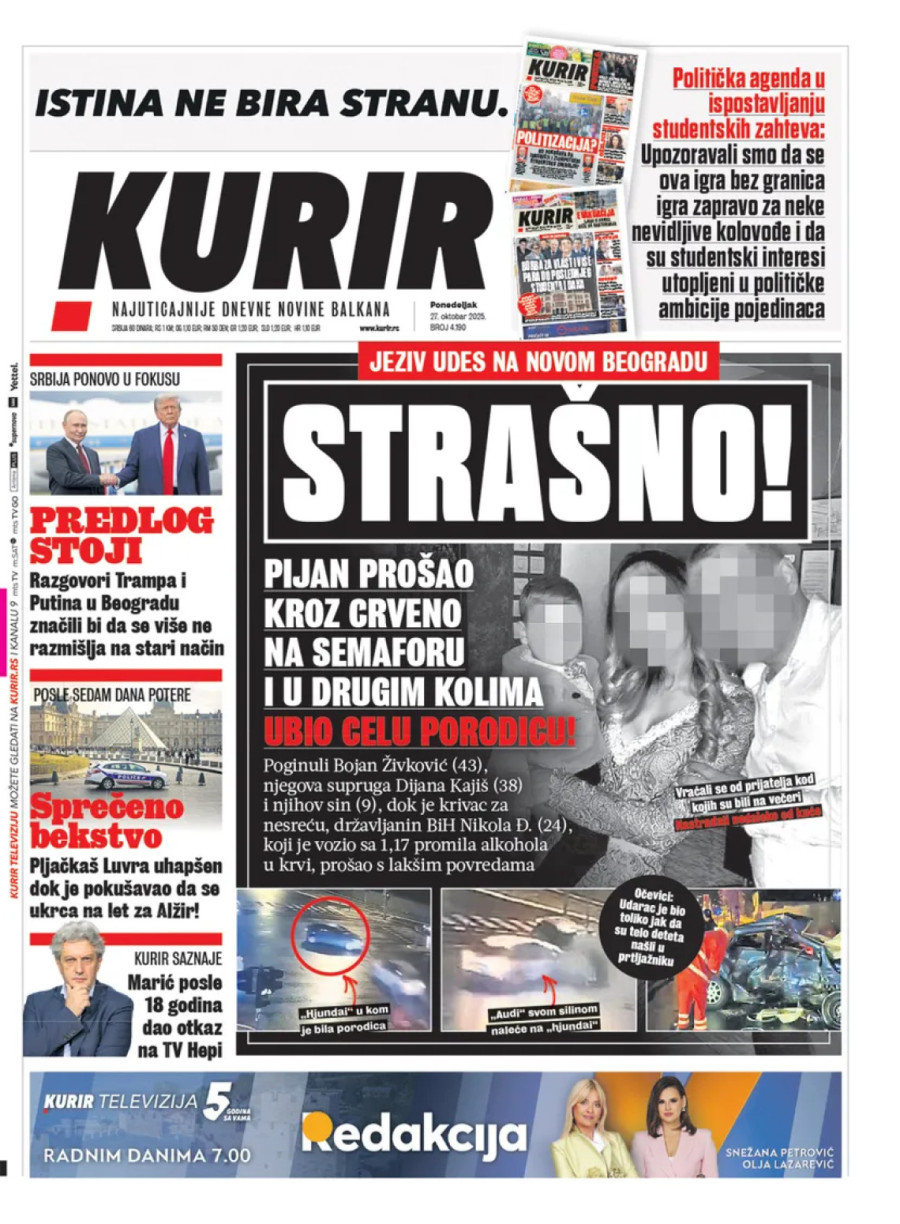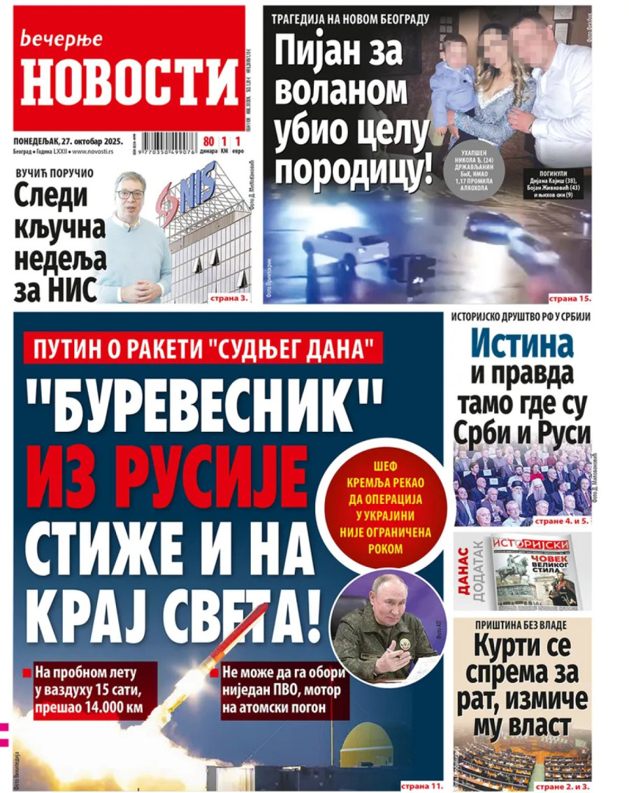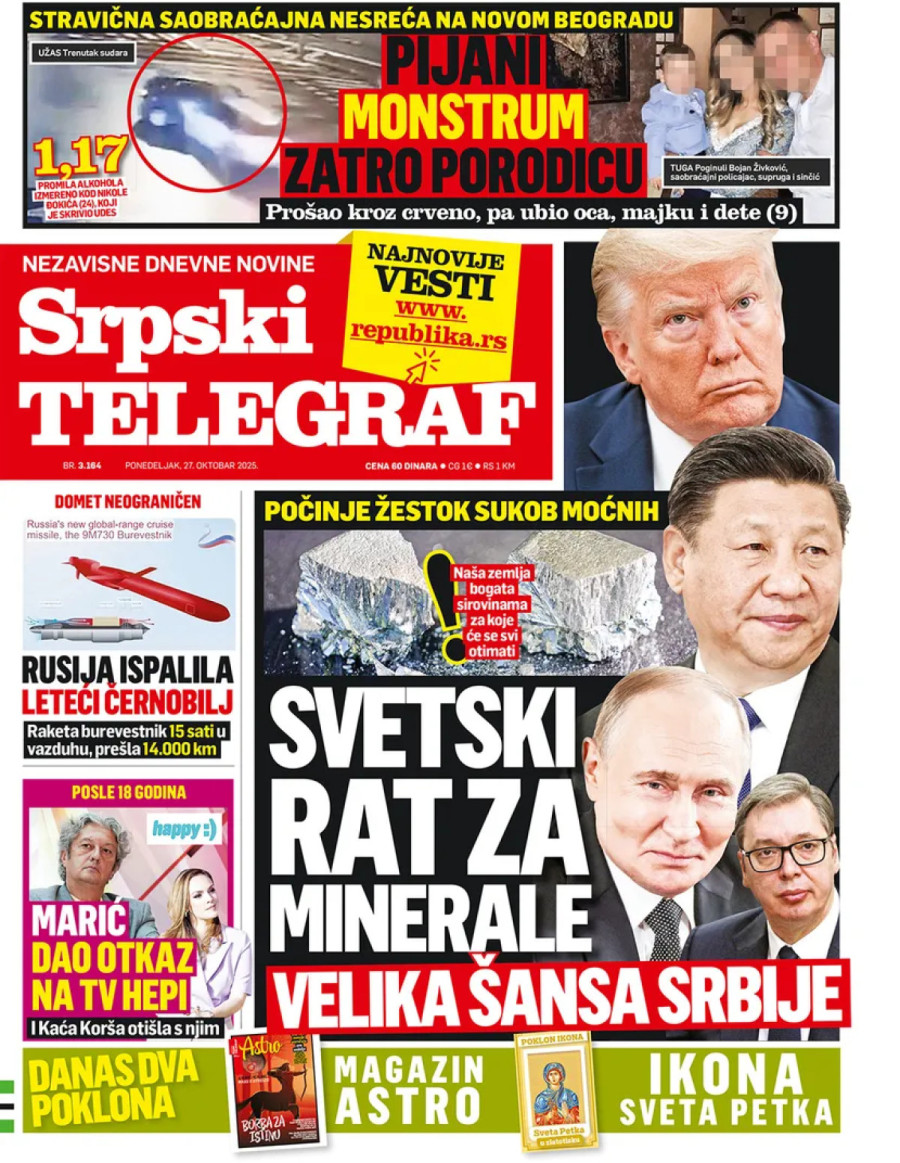 Dnevne novine u Srbiji za ponedeljak, 27. oktobar 2025. godine na naslovnim stranama najavljuju brojne aktuelne društveno-političke teme i donose eksluzivne priče.