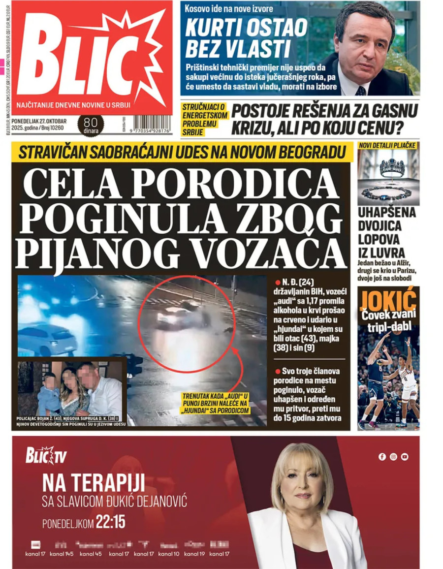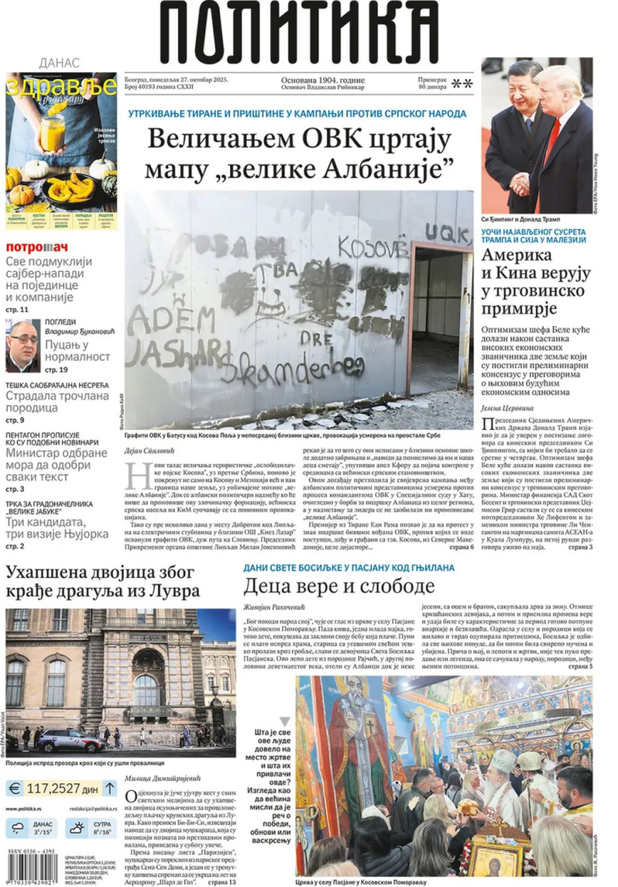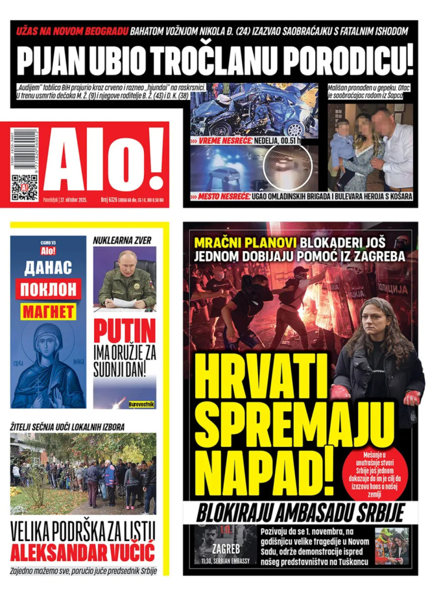 Dnevne novine u Srbiji za ponedeljak, 27. oktobar 2025. godine na naslovnim stranama najavljuju brojne aktuelne društveno-političke teme i donose eksluzivne priče.