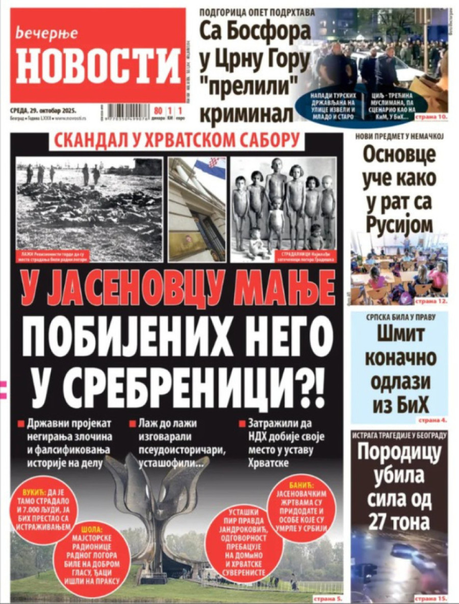 Novine: "Sramni skup u Hrvatskom saboru o logoru Jasenovac"; "Osnovce uče kako u rat sa Rusijom"