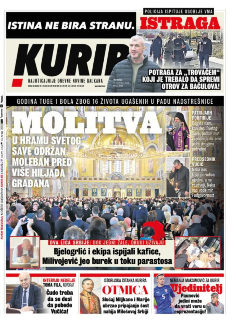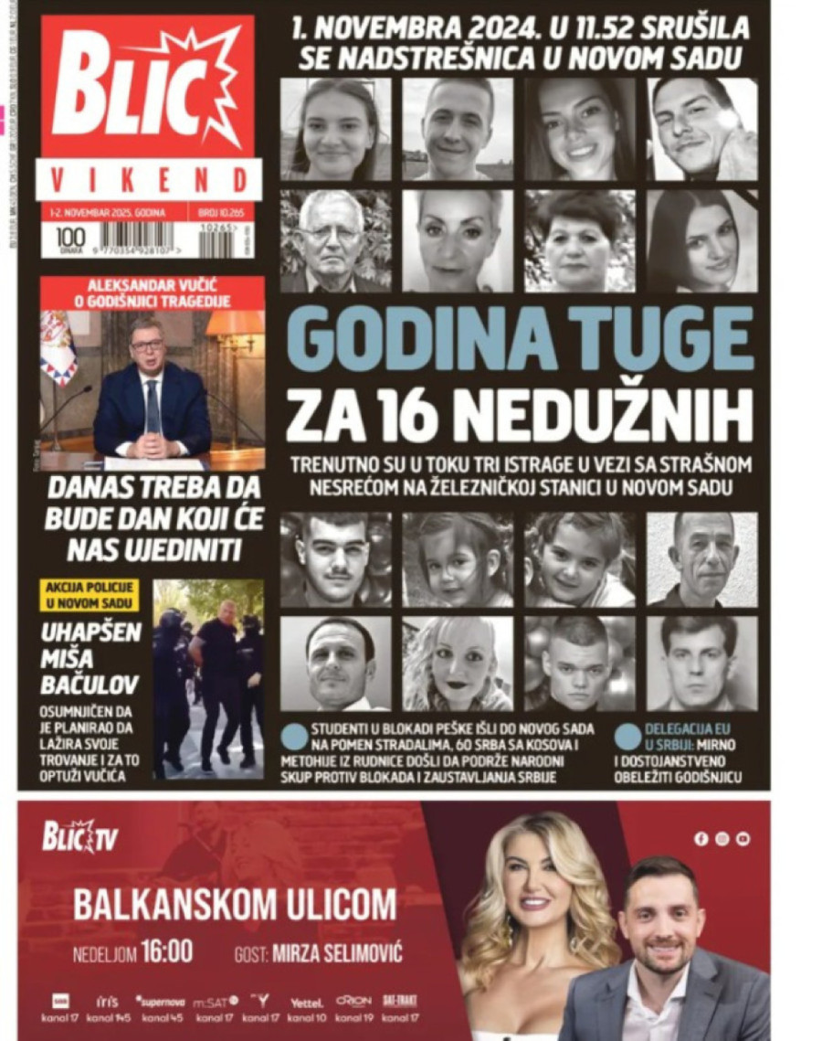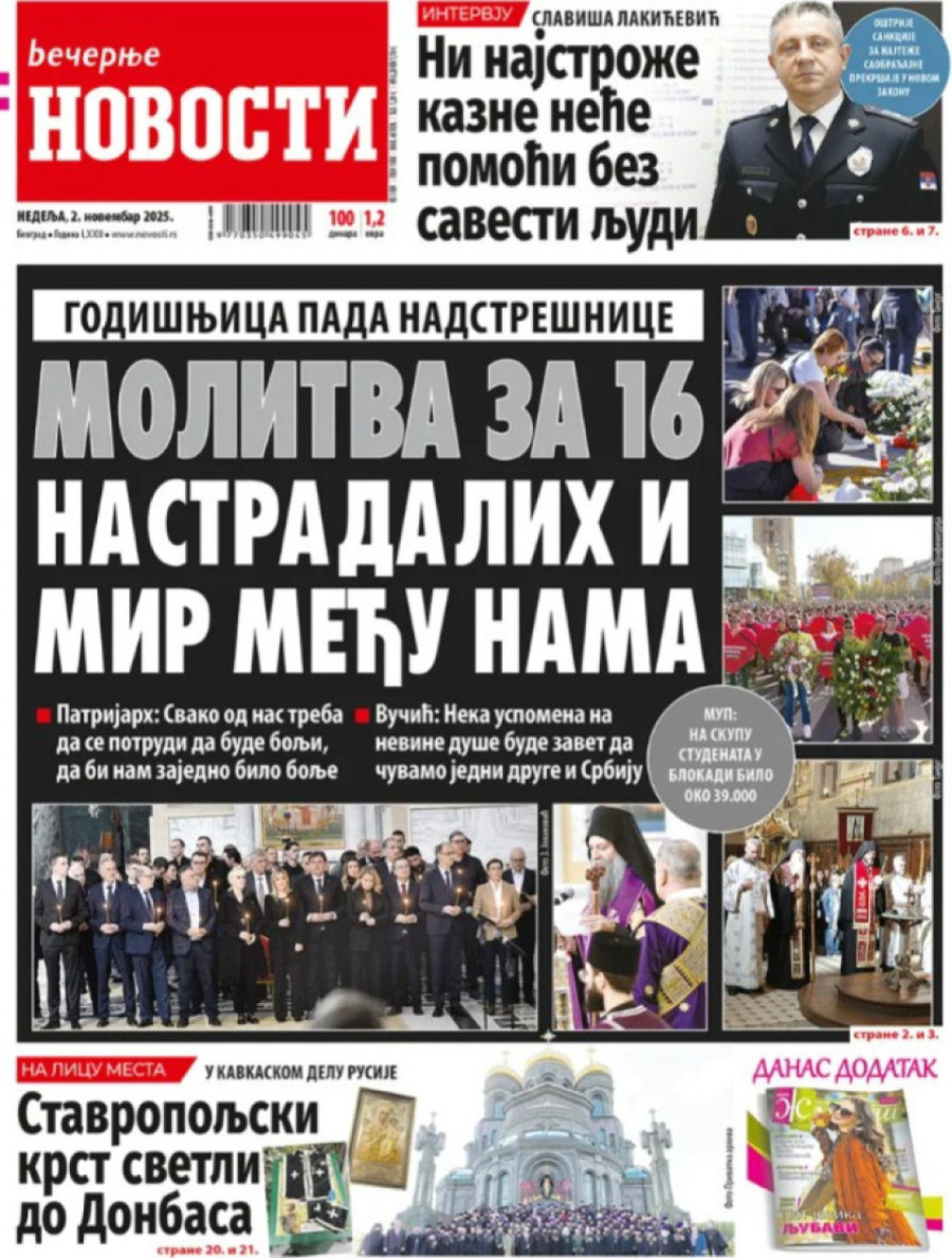Novine: "Obeležena godišnjica tragedije u Novom Sadu"; "Ni najstrože kazne neće pomoći bez savesti ljudi"