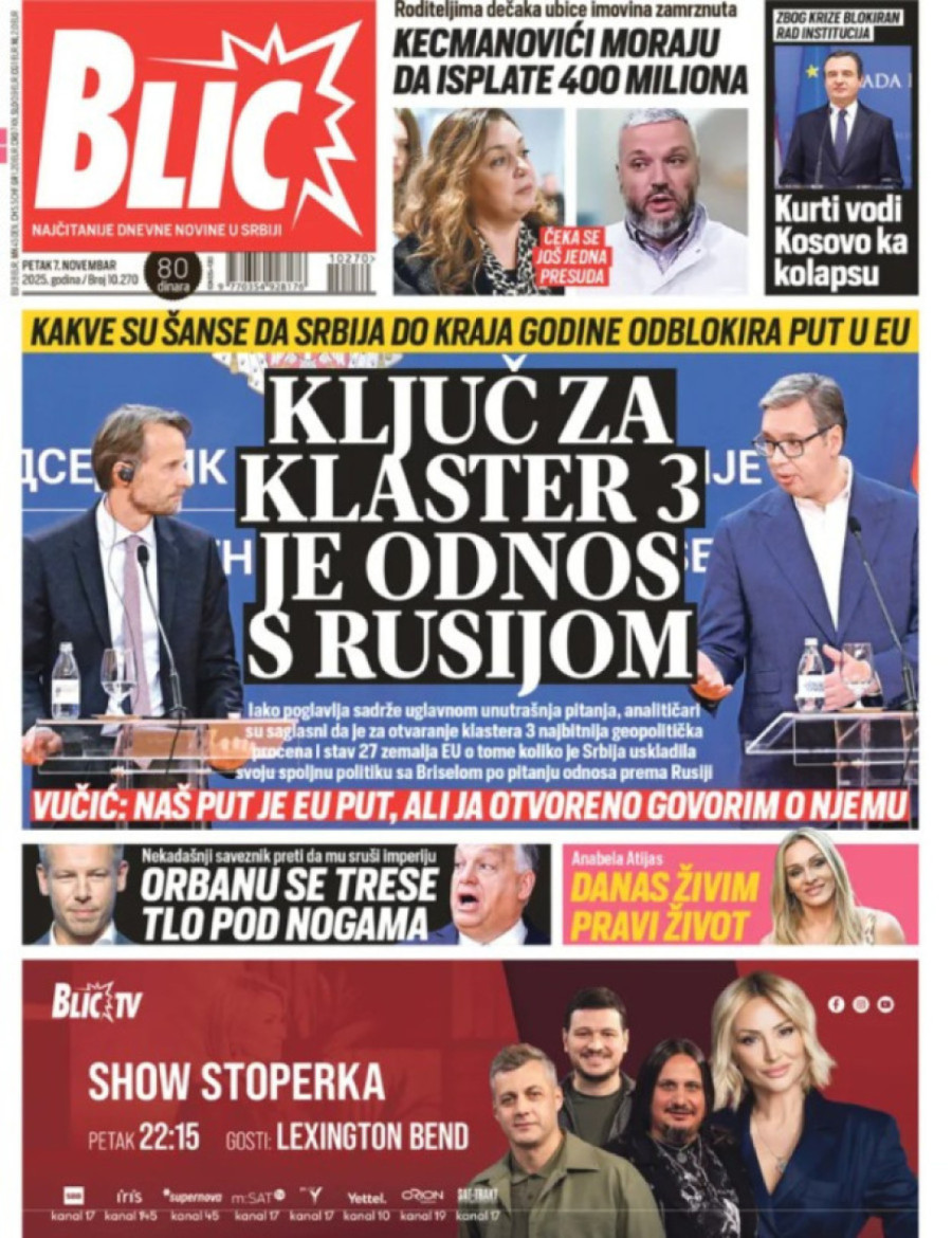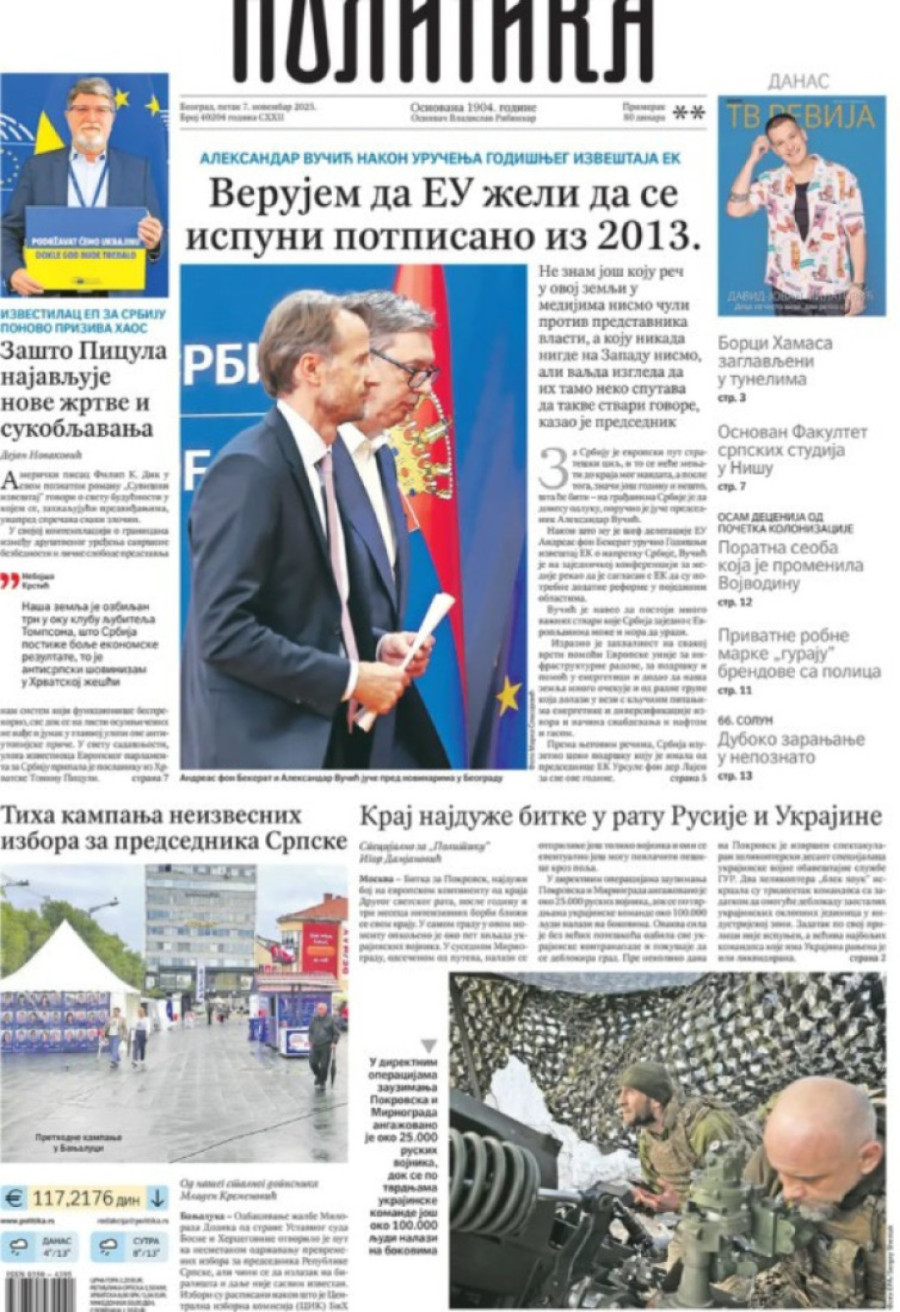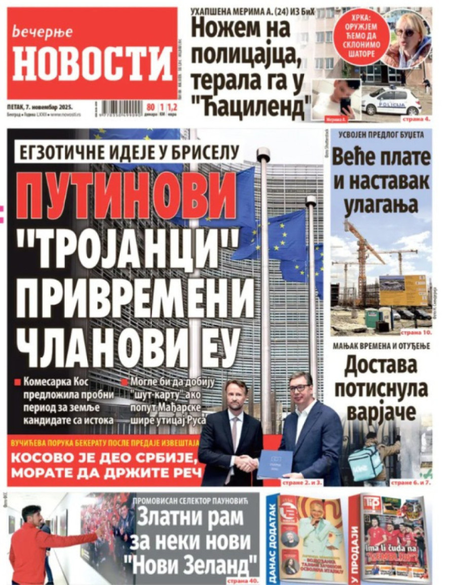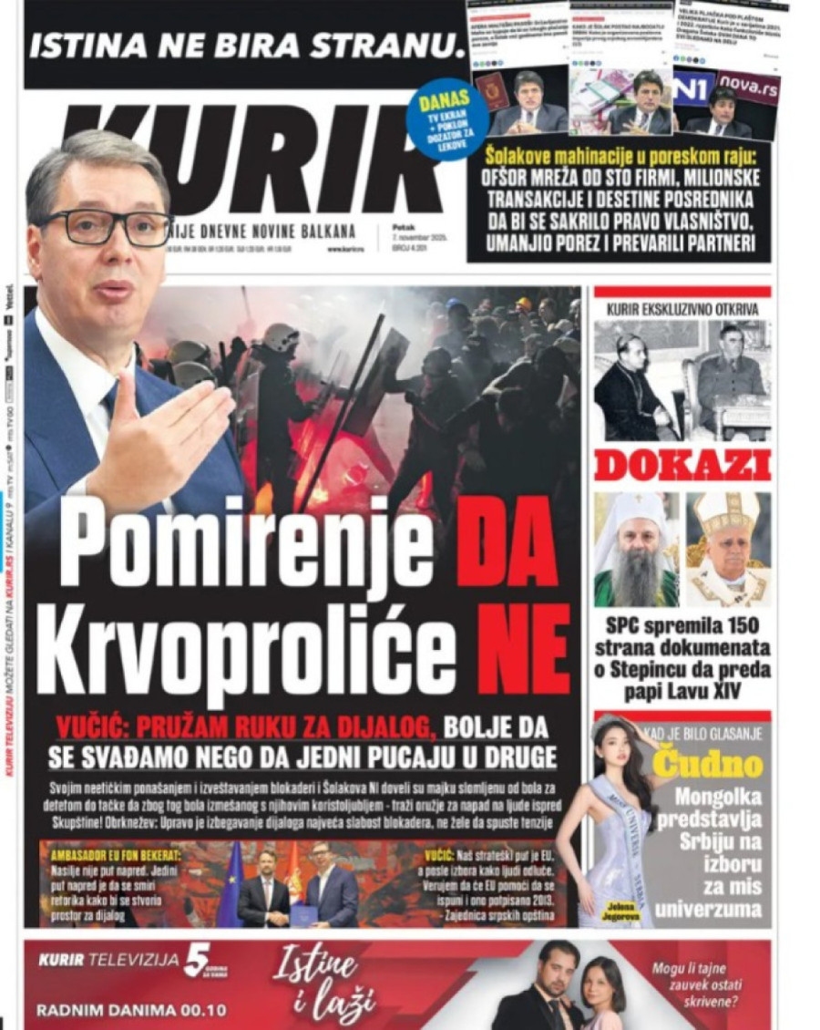 Dnevne novine u Srbiji za petak, 7. novembar 2025. godine na naslovnim stranama najavljuju brojne aktuelne društveno-političke teme i donose eksluzivne priče.