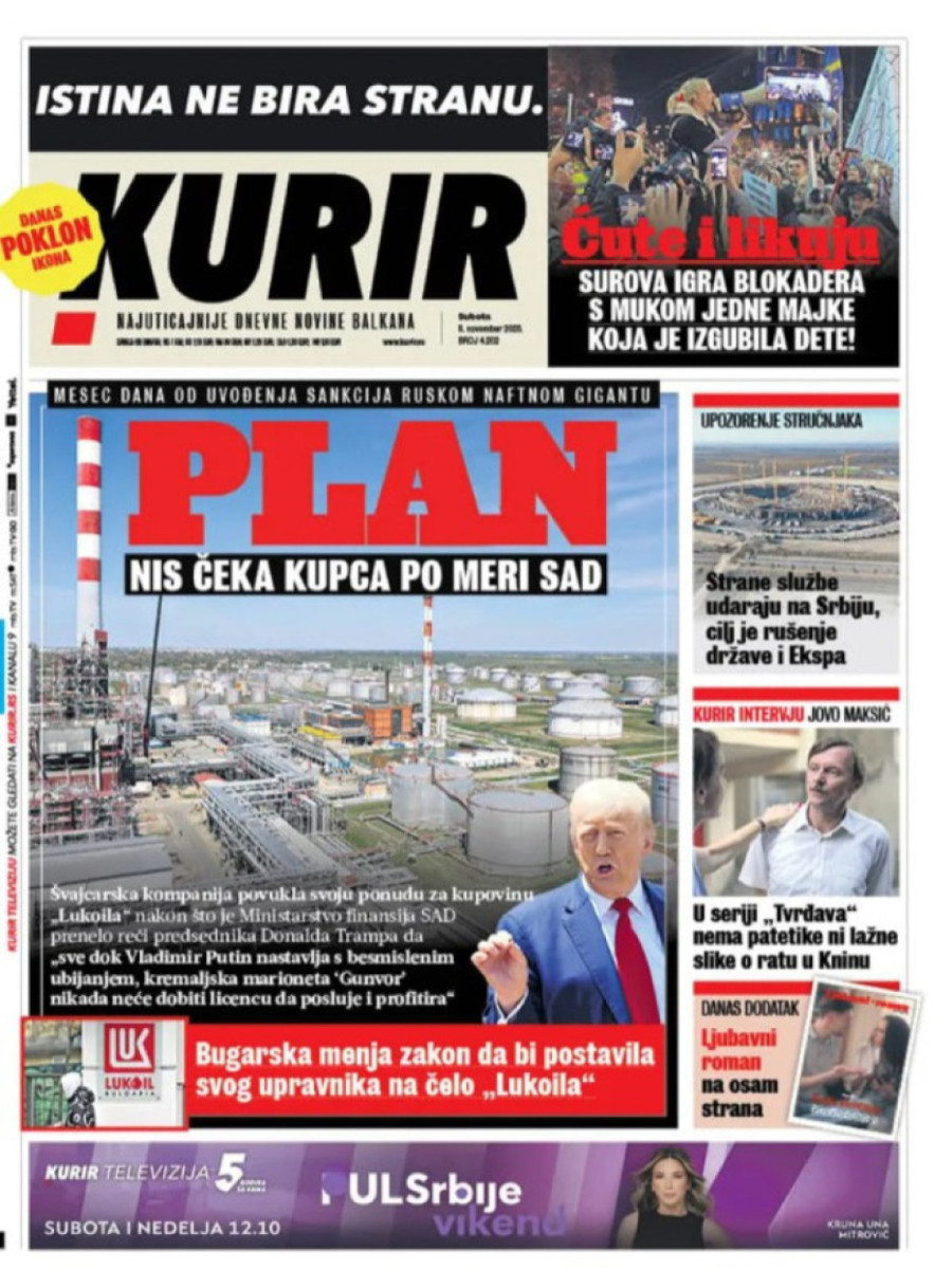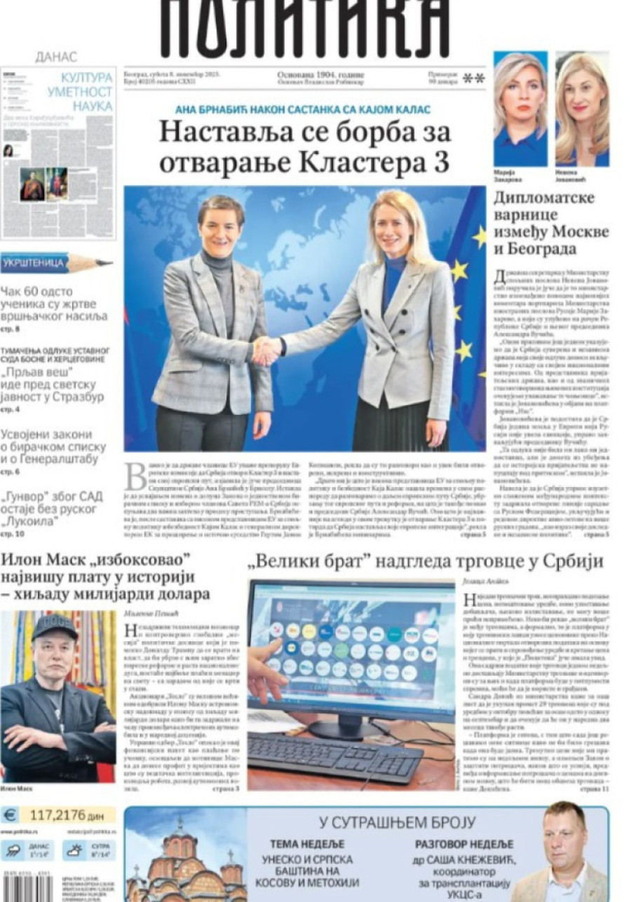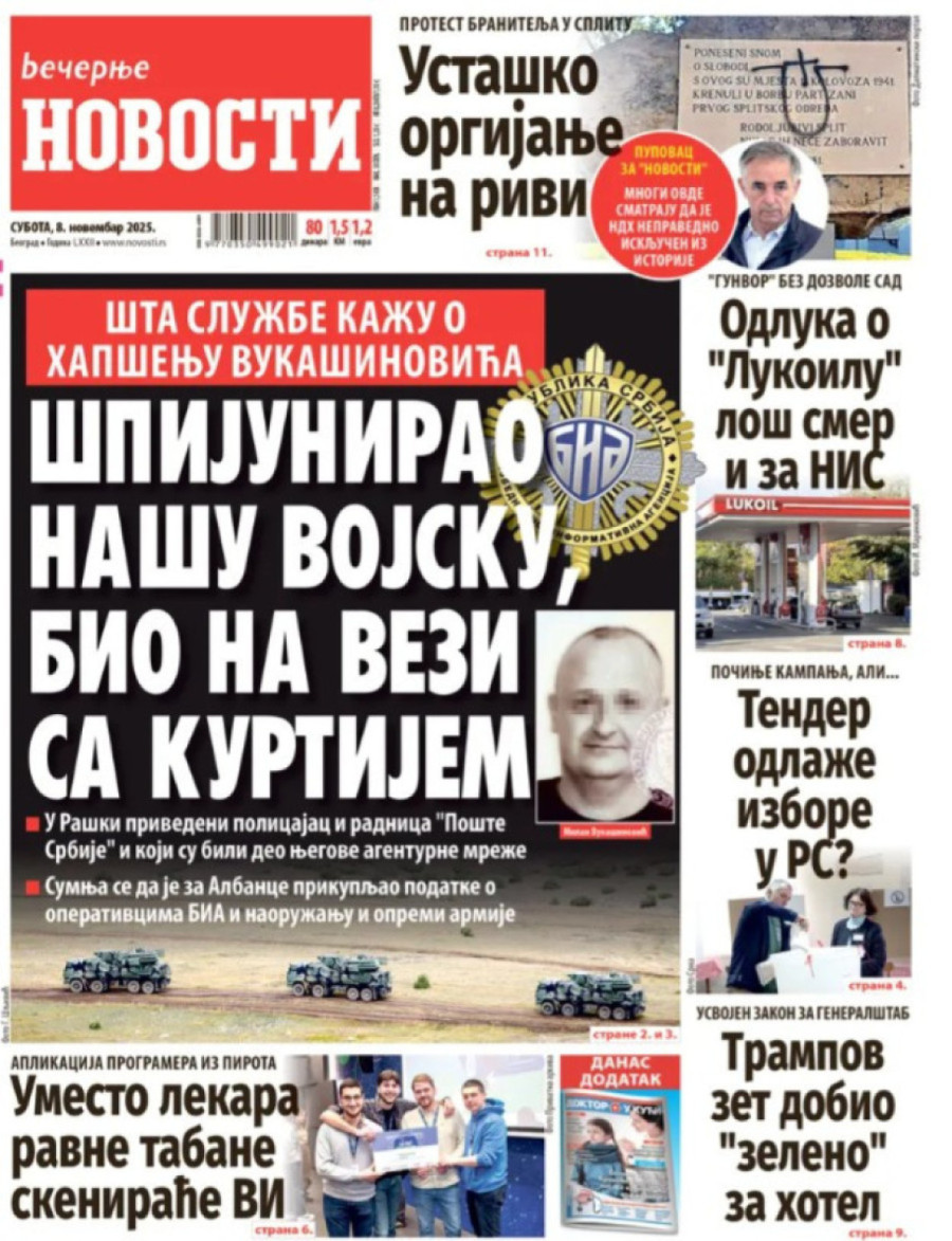 Dnevne novine u Srbiji za subotu, 8. novembar 2025. godine na naslovnim stranama najavljuju brojne aktuelne društveno-političke teme i donose eksluzivne priče.