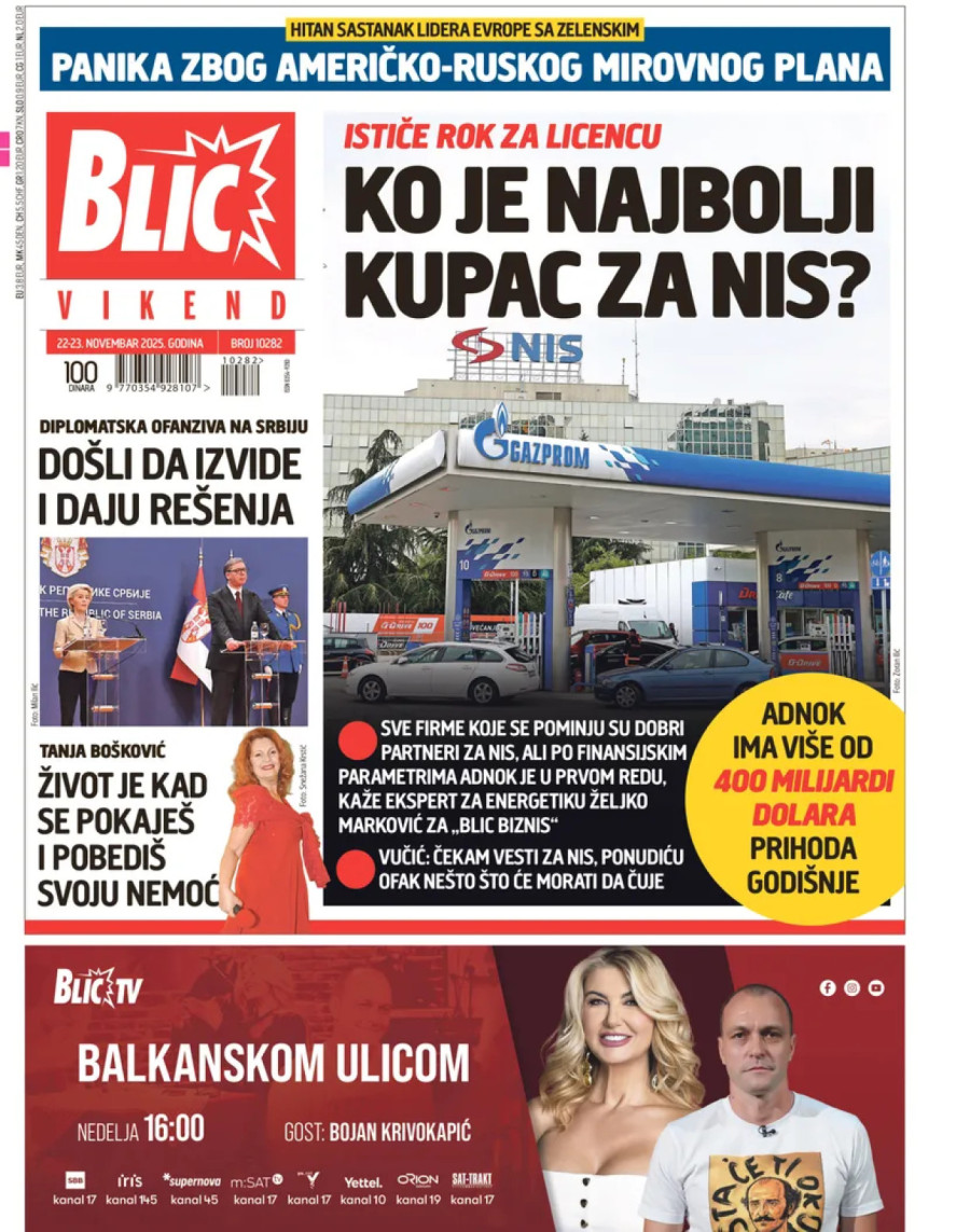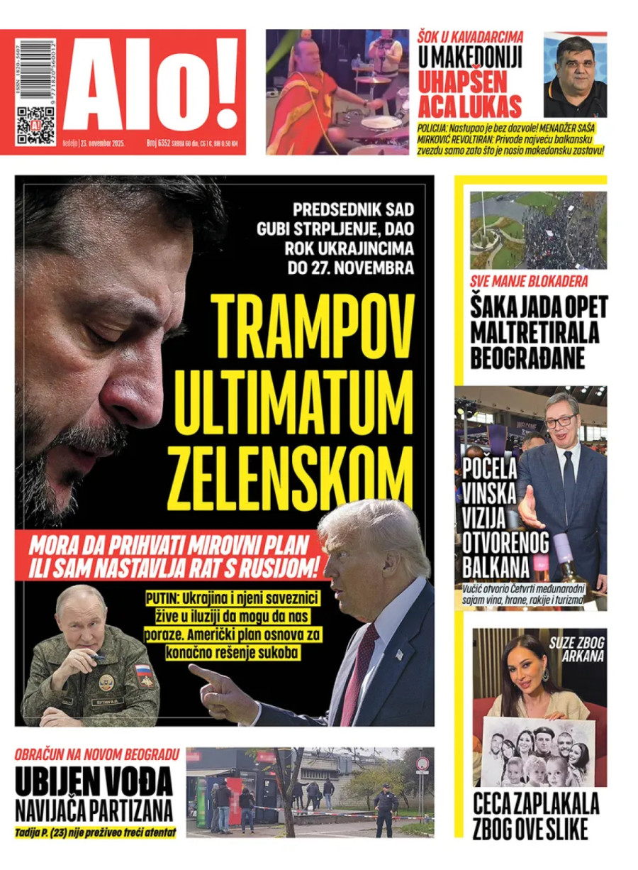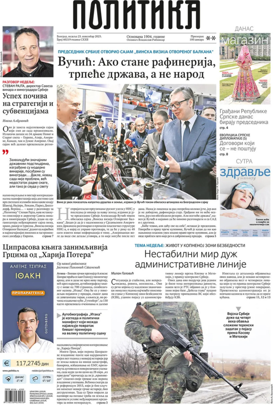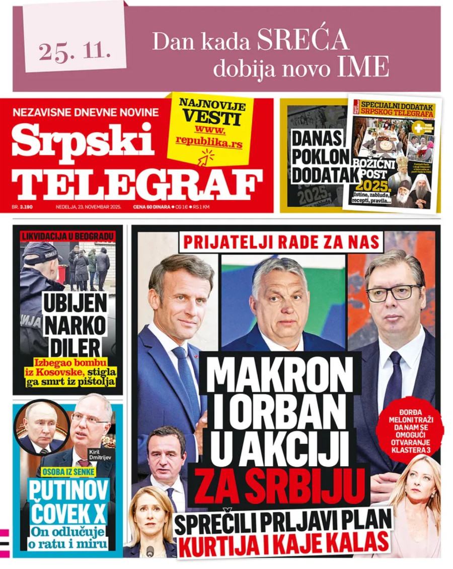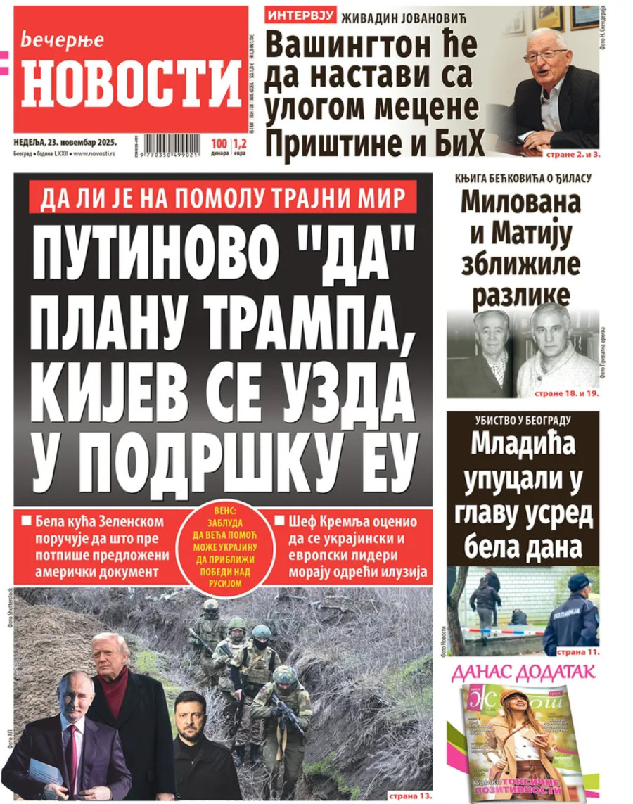 Dnevne novine u Srbiji za nedelju, 23. novembar 2025. godine na naslovnim stranama najavljuju brojne aktuelne društveno-političke teme i donose ekskluzivne priče.