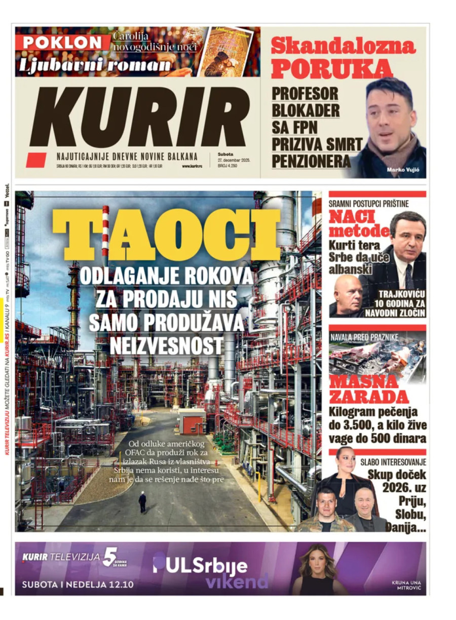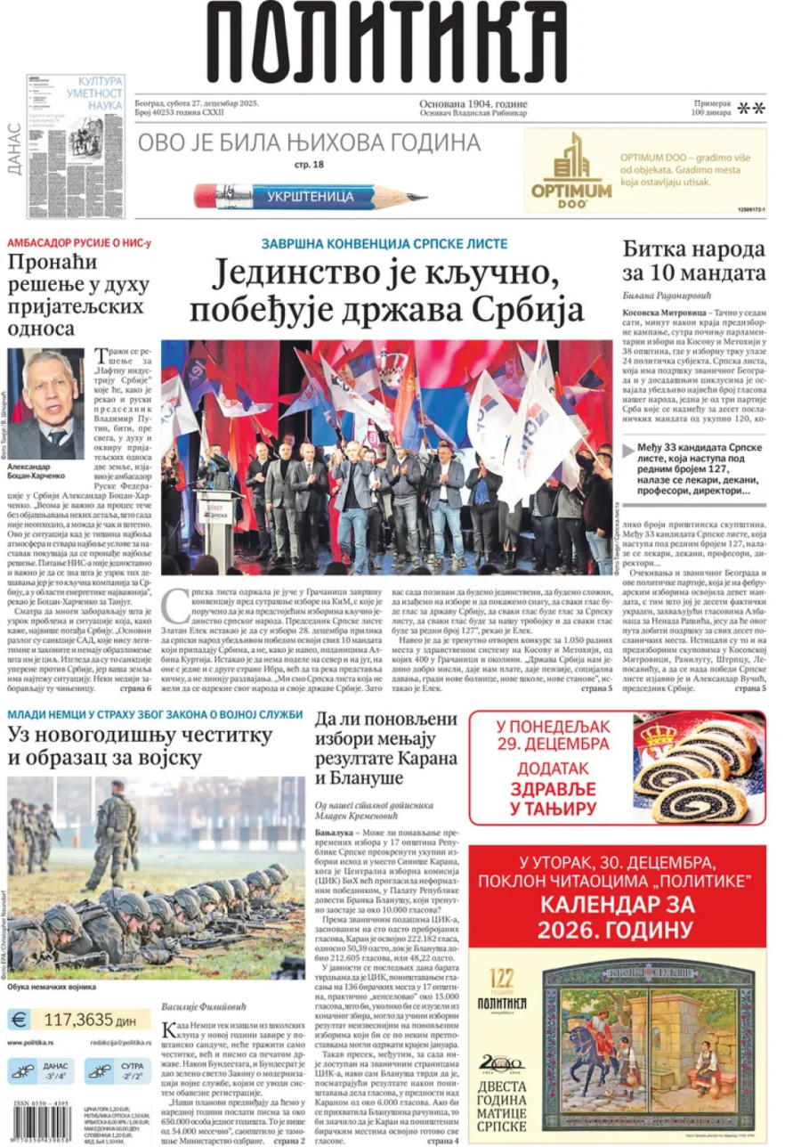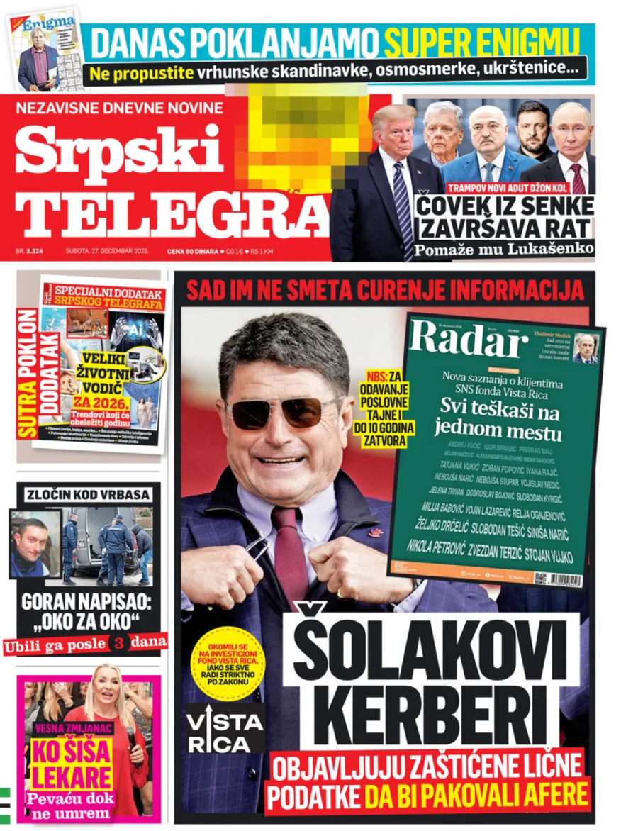 Dnevne novine u Srbiji za subotu, 27. decembar 2025. godine na naslovnim stranama najavljuju brojne aktuelne društveno-političke teme i donose eksluzivne priče.