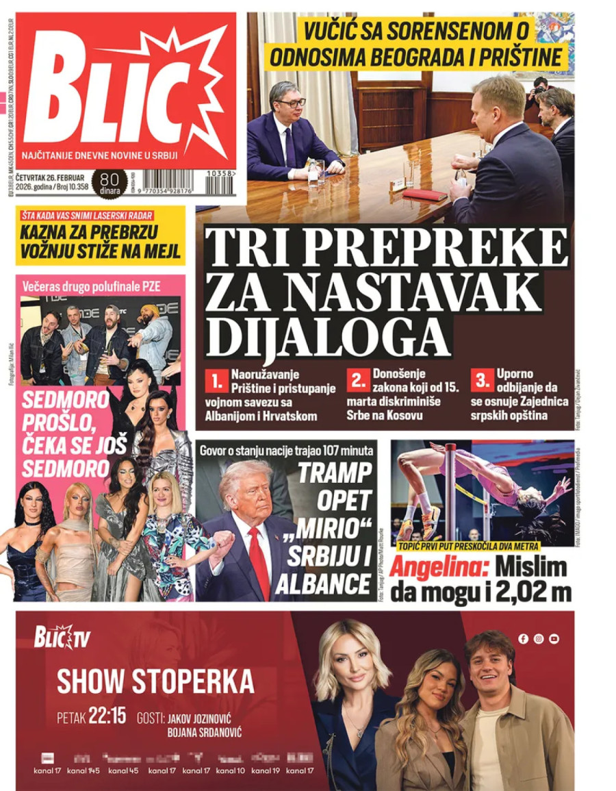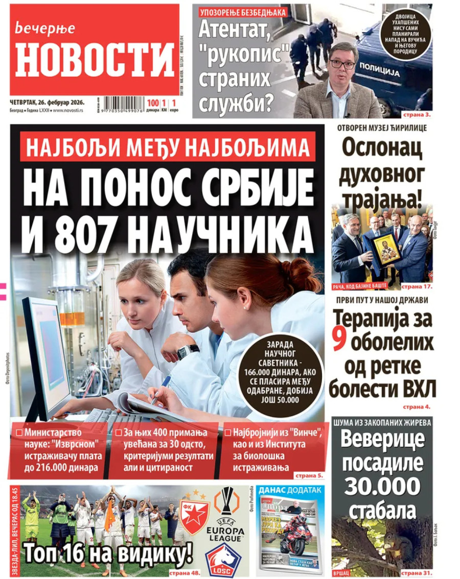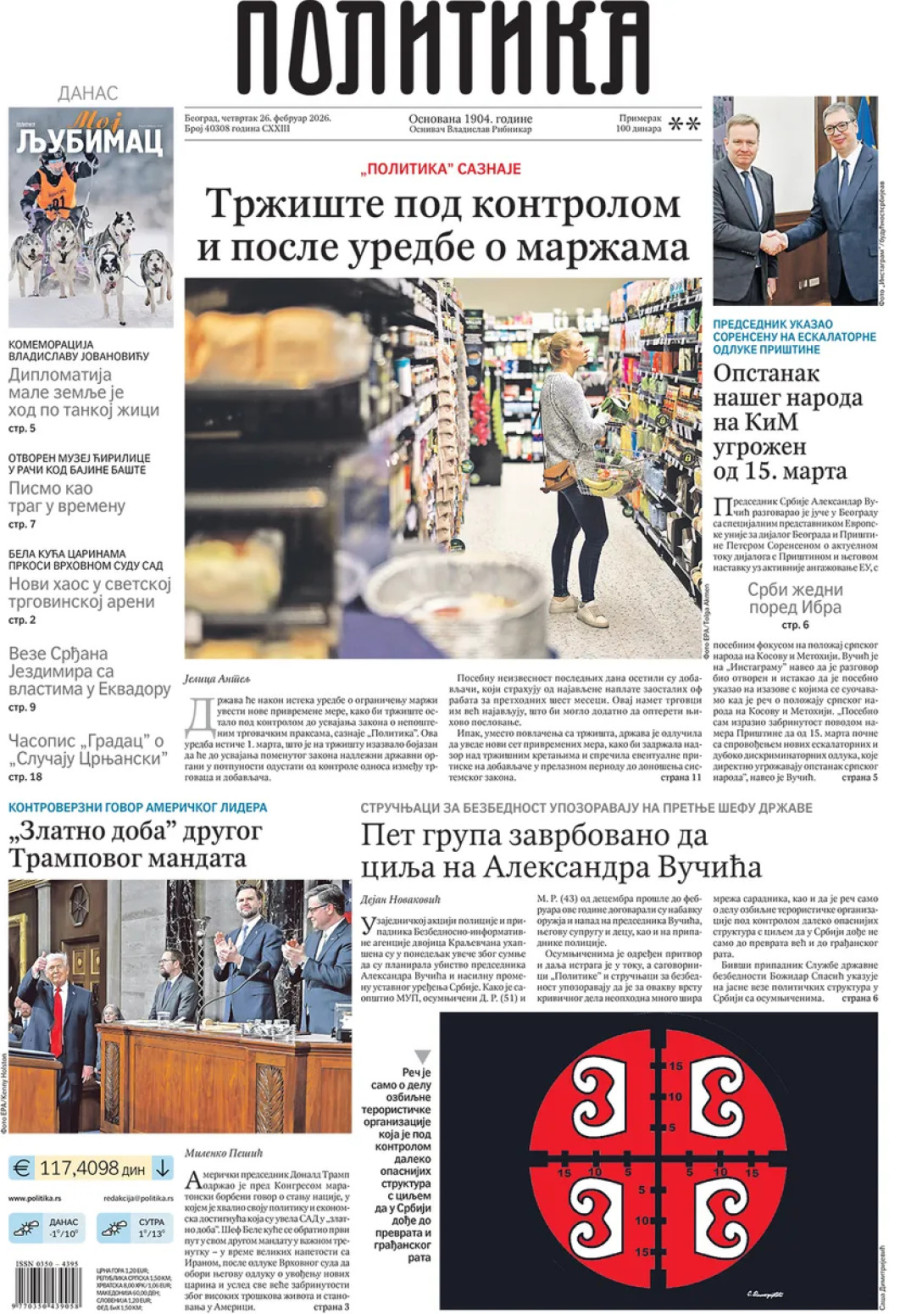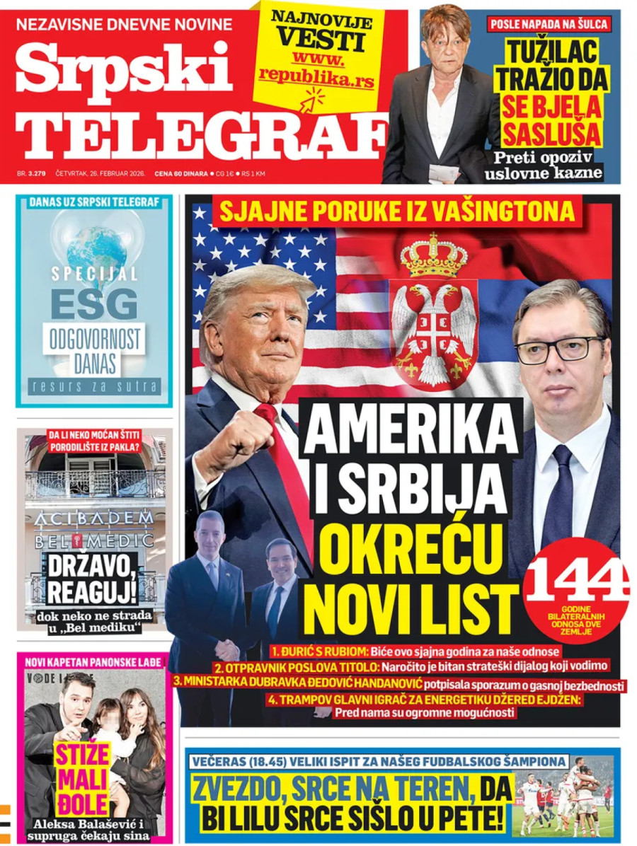 Dnevne novine u Srbiji za četvrtak, 26. februar 2026. godine na naslovnim stranama najavljuju brojne aktuelne društveno-političke teme i donose ekskluzivne priče.