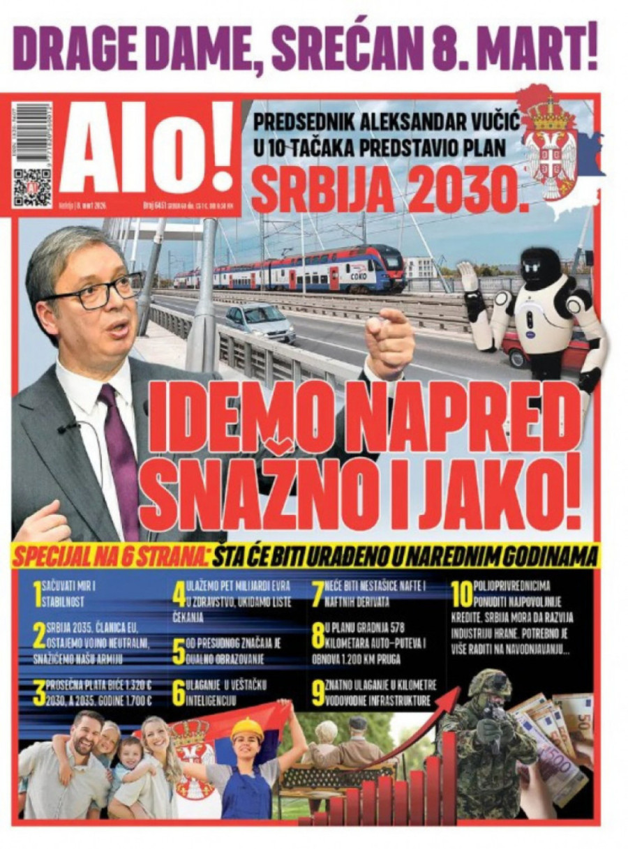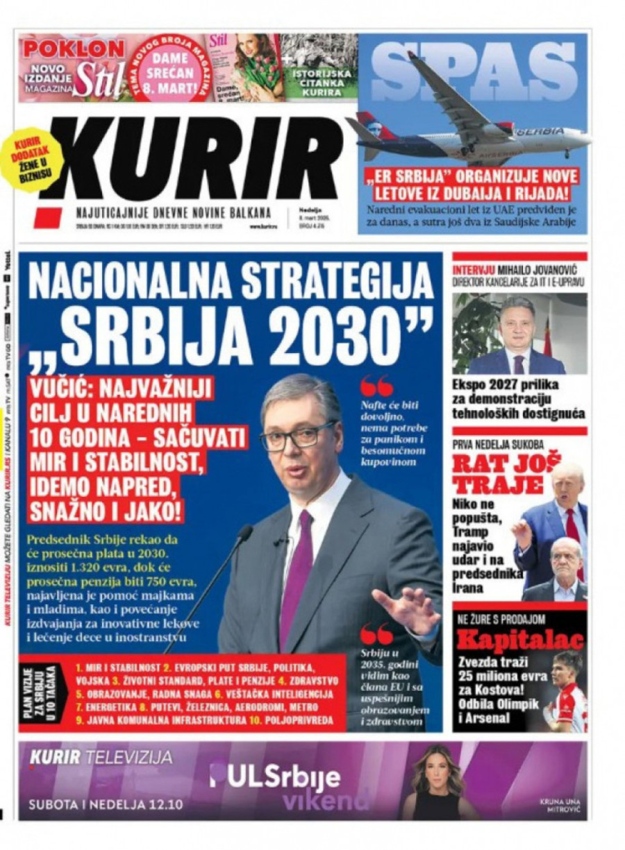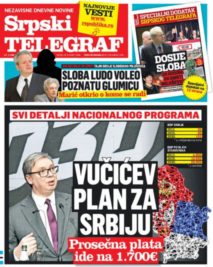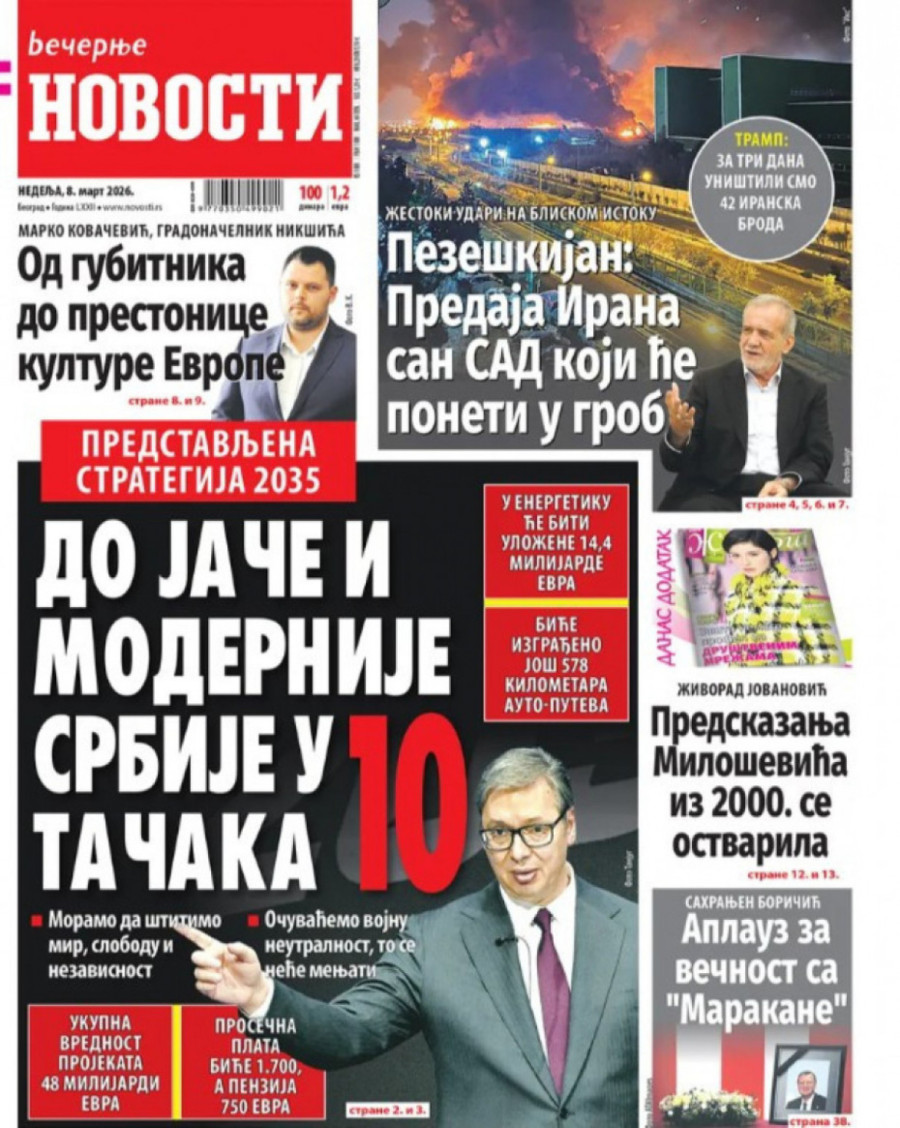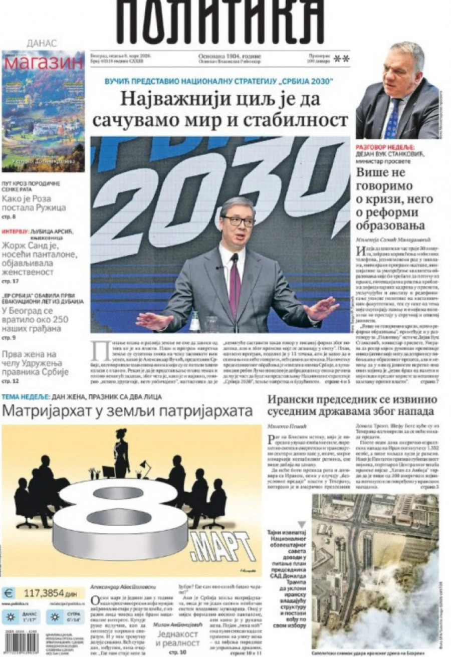 Dnevne novine u Srbiji za nedelju, 8. mart 2026. godine, na naslovnim stranama najavljuju brojne aktuelne društveno-političke teme i donose ekskluzivne priče.