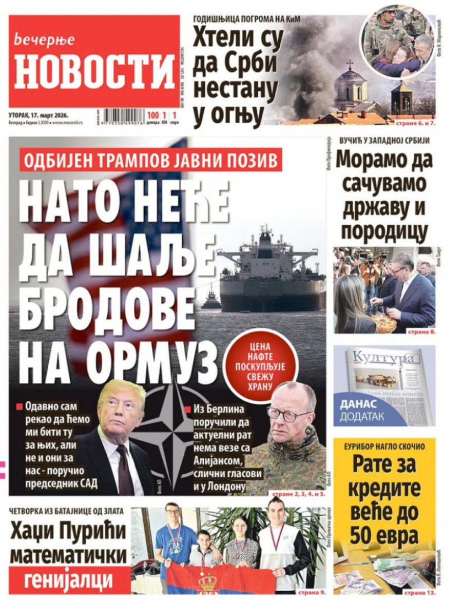 Sukobi širom Bliskog istoka – 17. dan. Iranski ministar spoljnih poslova Abas Aragči kaže da Teheran "nije tražio prekid vatre, čak ni pregovore", odgovarajući tako Donaldu Trampu. Izrael napao Bejrut tokom noći.