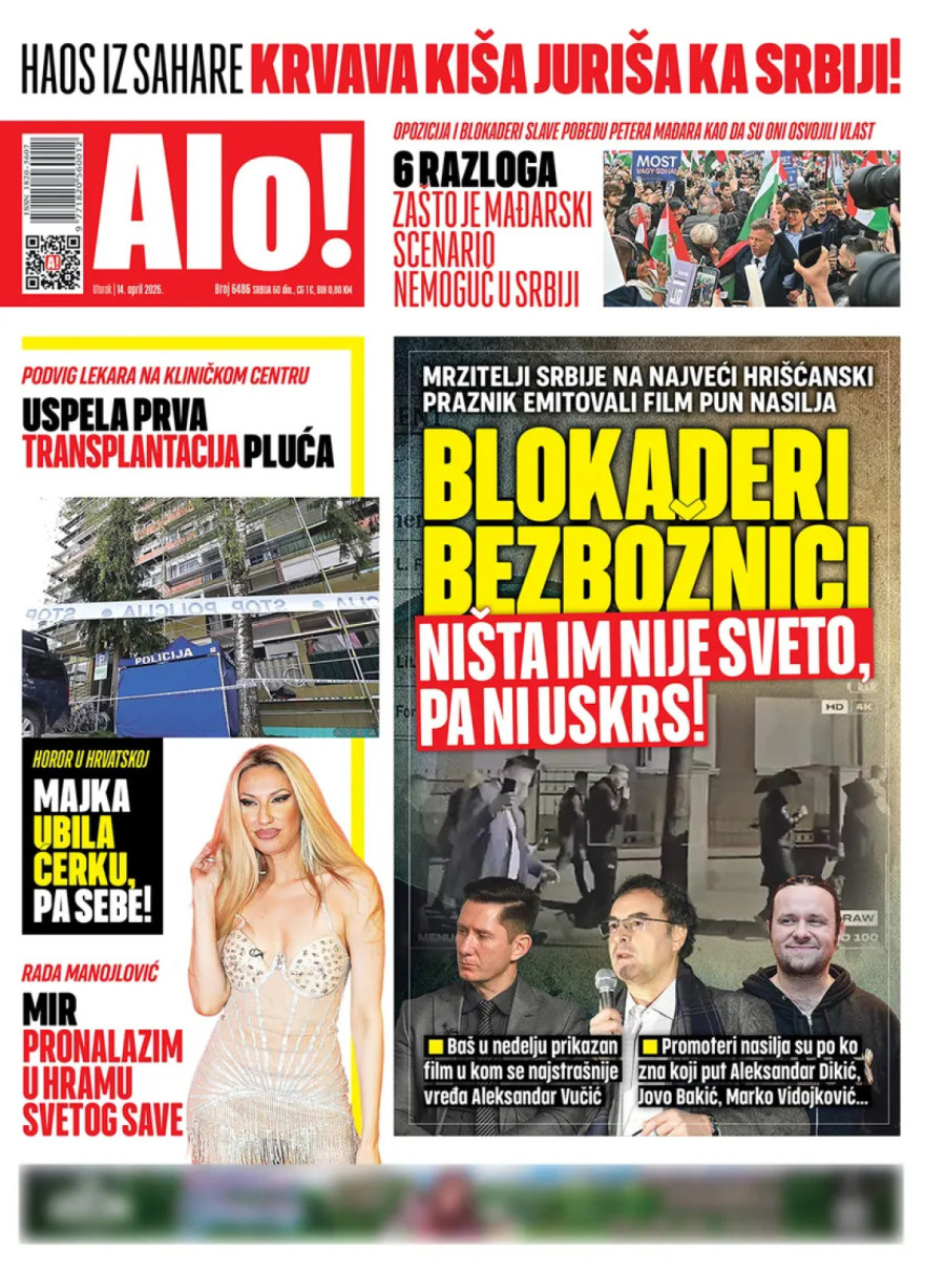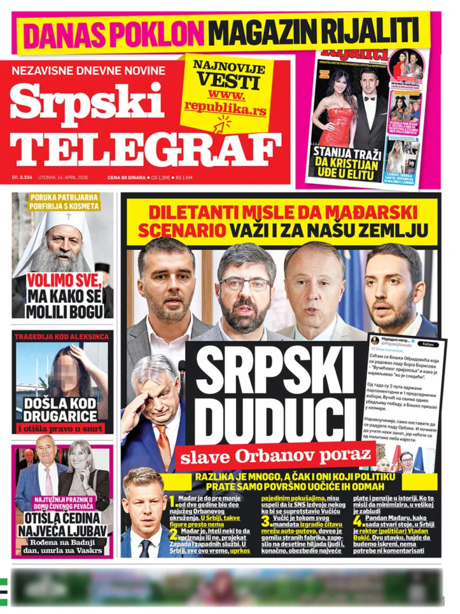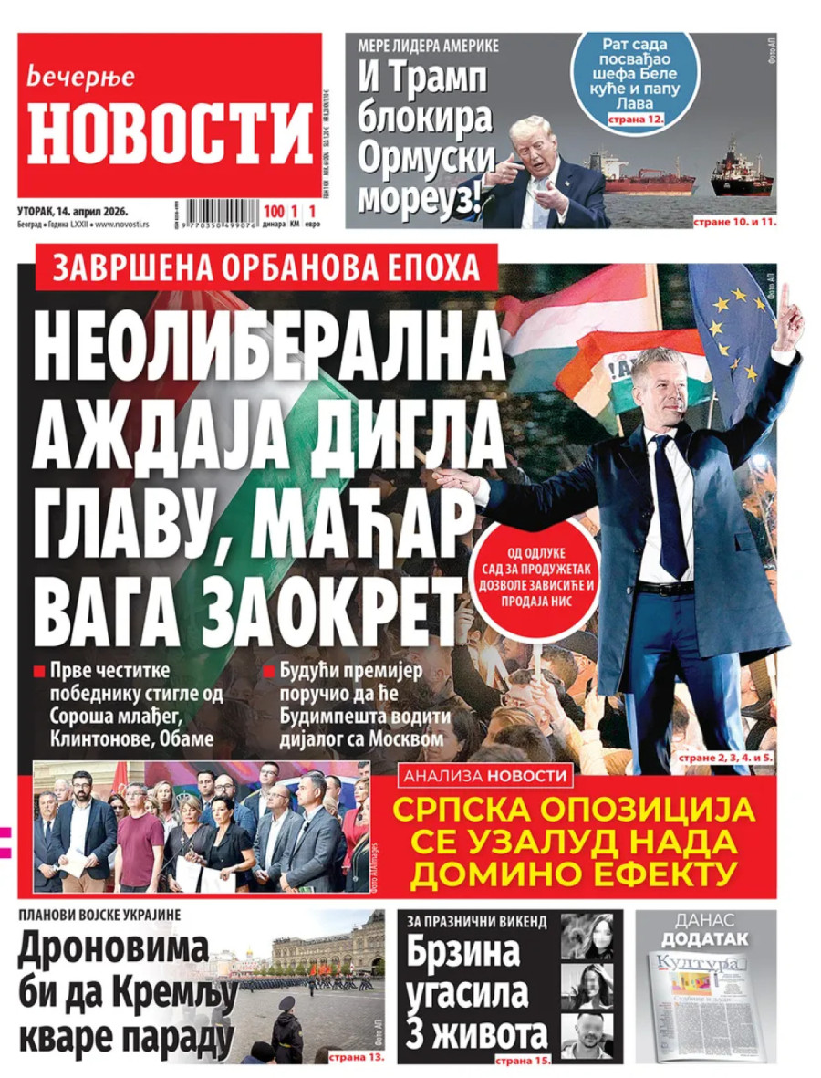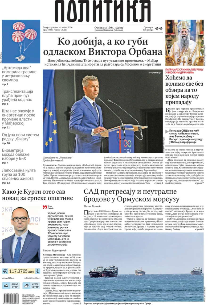 Dnevne novine u Srbiji za utorak, 14. april 2026. godine na naslovnim stranama najavljuju brojne aktuelne društveno-političke teme i donose ekskluzivne priče.