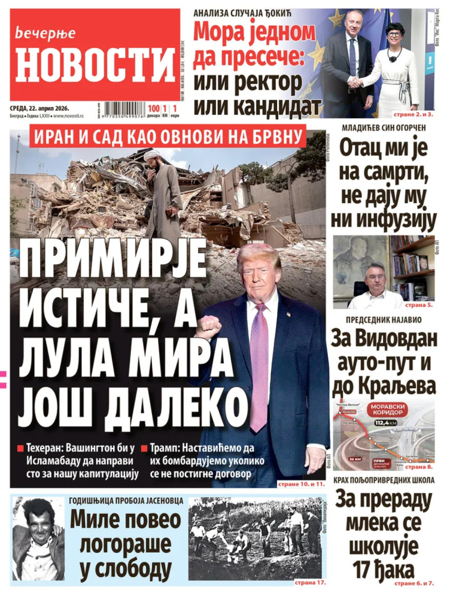 Sukob na Bliskom istoku – 53. dan. Ističe dvonedeljno primirje. Predsednik SAD Donald Tramp preti novim bombardovanjem ako ne bude dogovora. Iran odgovorio da ne prihvata pregovore pod pretnjama.