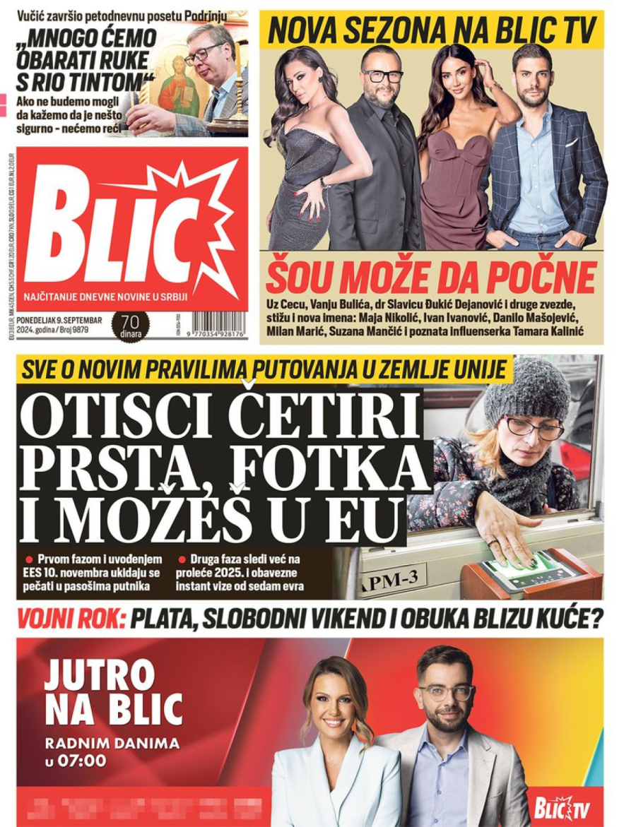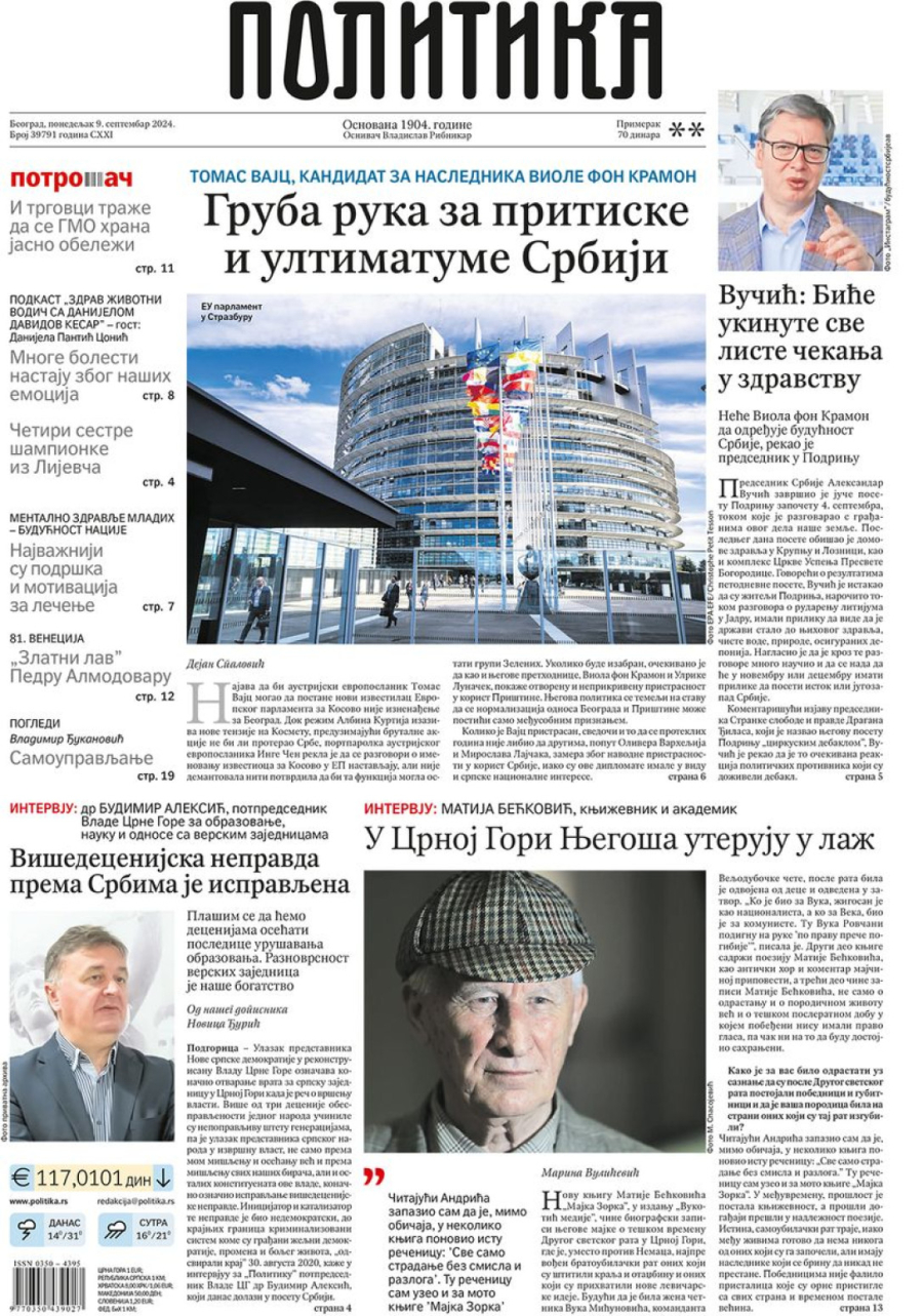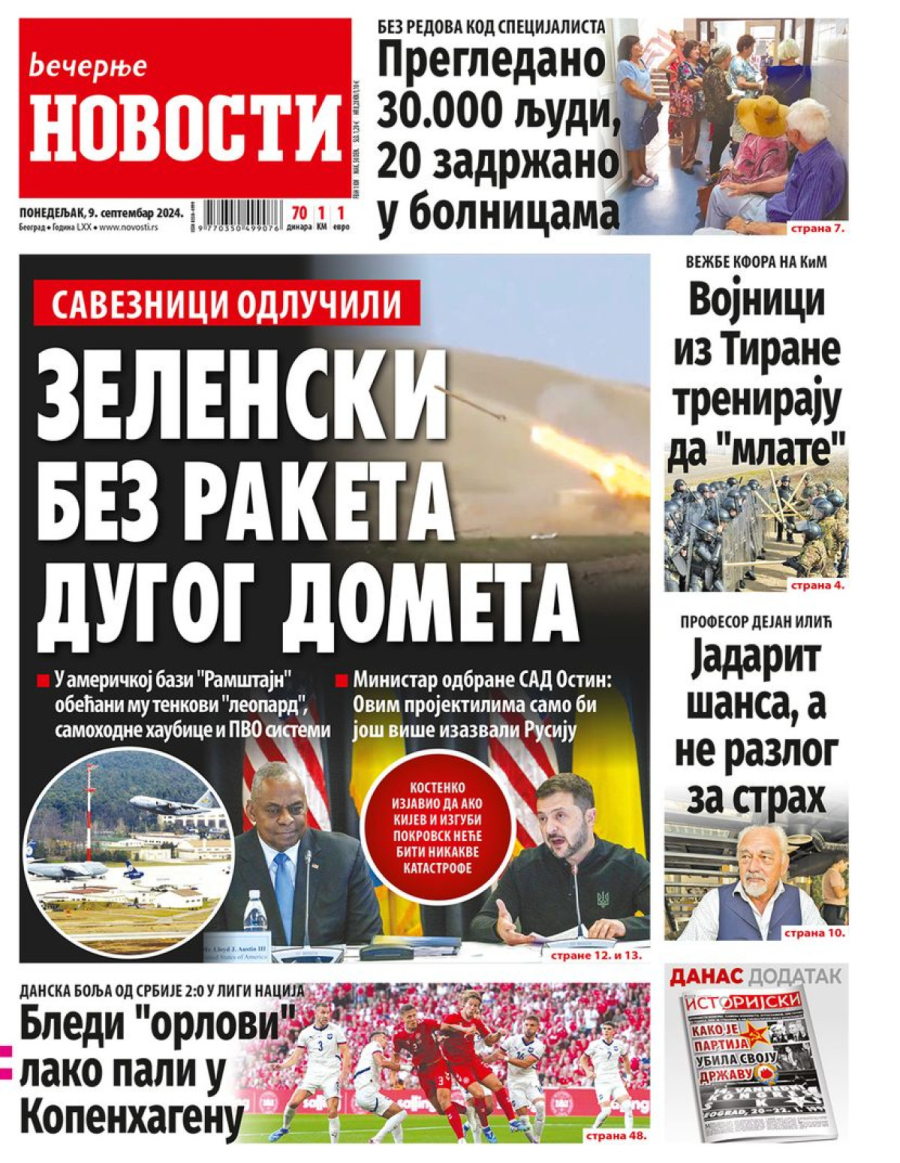 Dnevne novine u Srbiji za ponedeljak, 9. septembar 2024. godine, na naslovnim stranama najavljuju brojne aktuelne društveno-političke teme.
