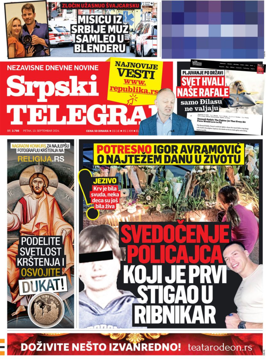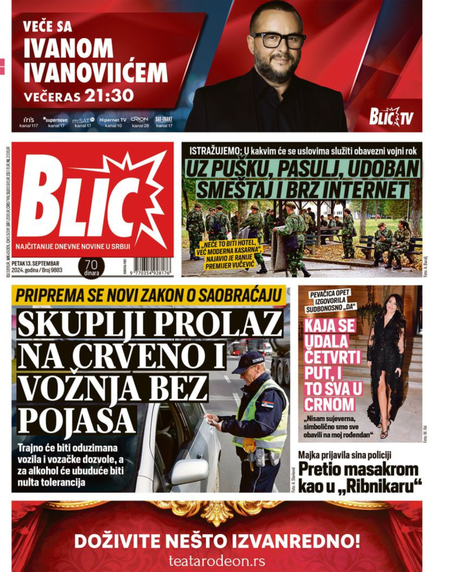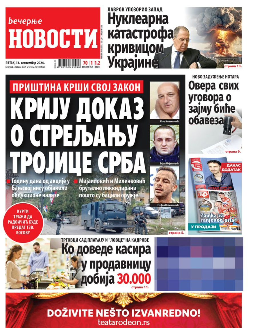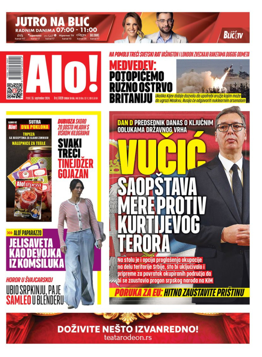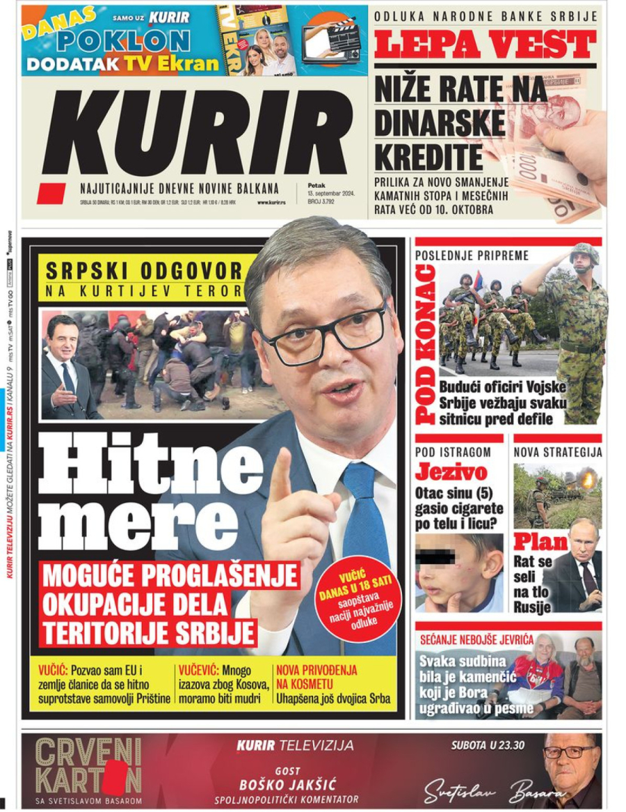 Dnevne novine u Srbiji za petak, 13. septembar 2024. godine, na naslovnim stranama najavljuju brojne aktuelne društveno-političke teme.