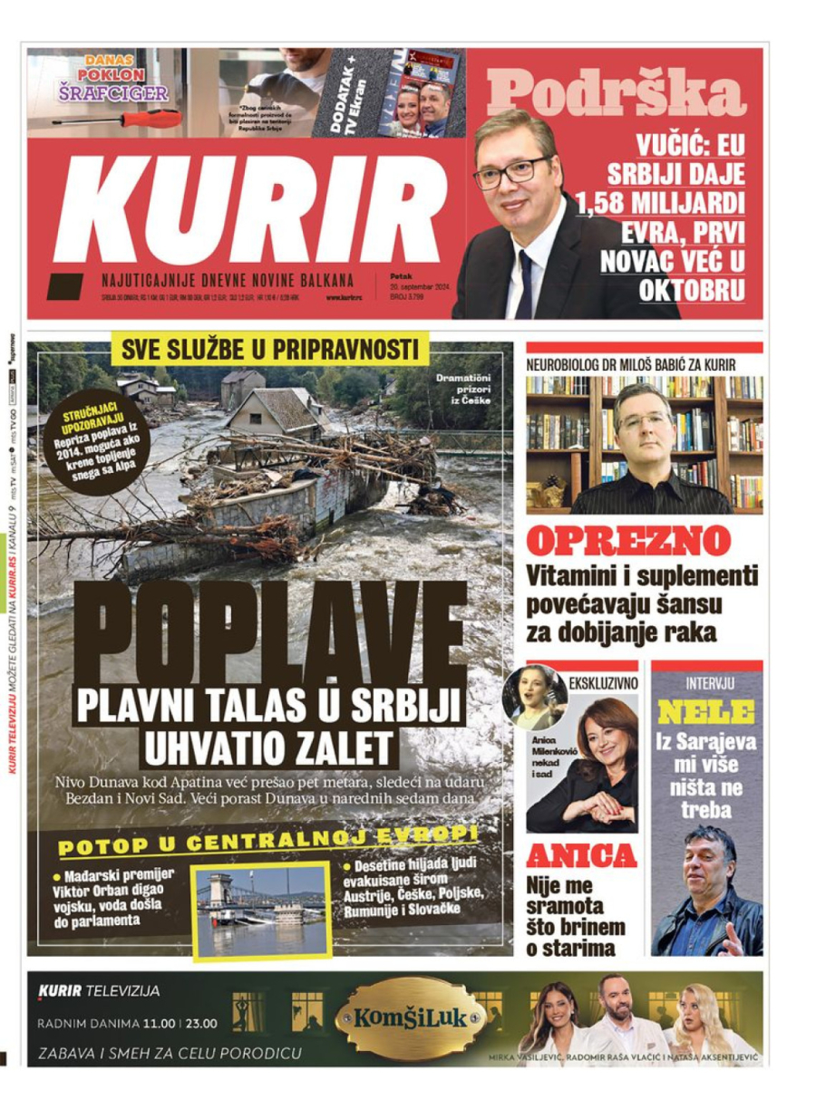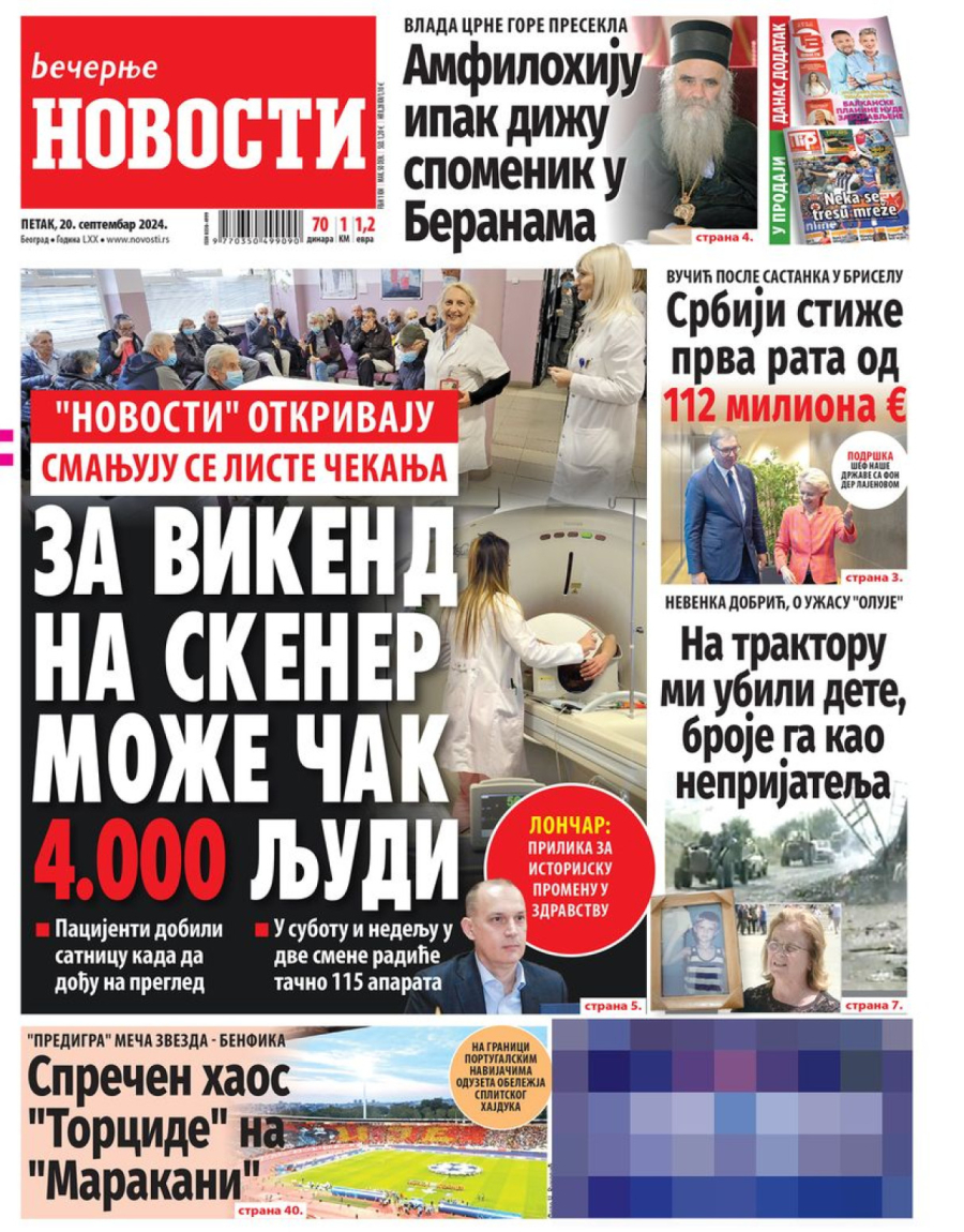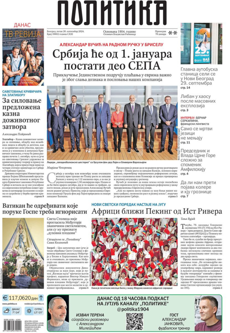 Dnevne novine u Srbiji za petak, 20. septembar 2024. godine, na naslovnim stranama najavljuju brojne aktuelne društveno-političke teme i donose ekskluzivne priče.