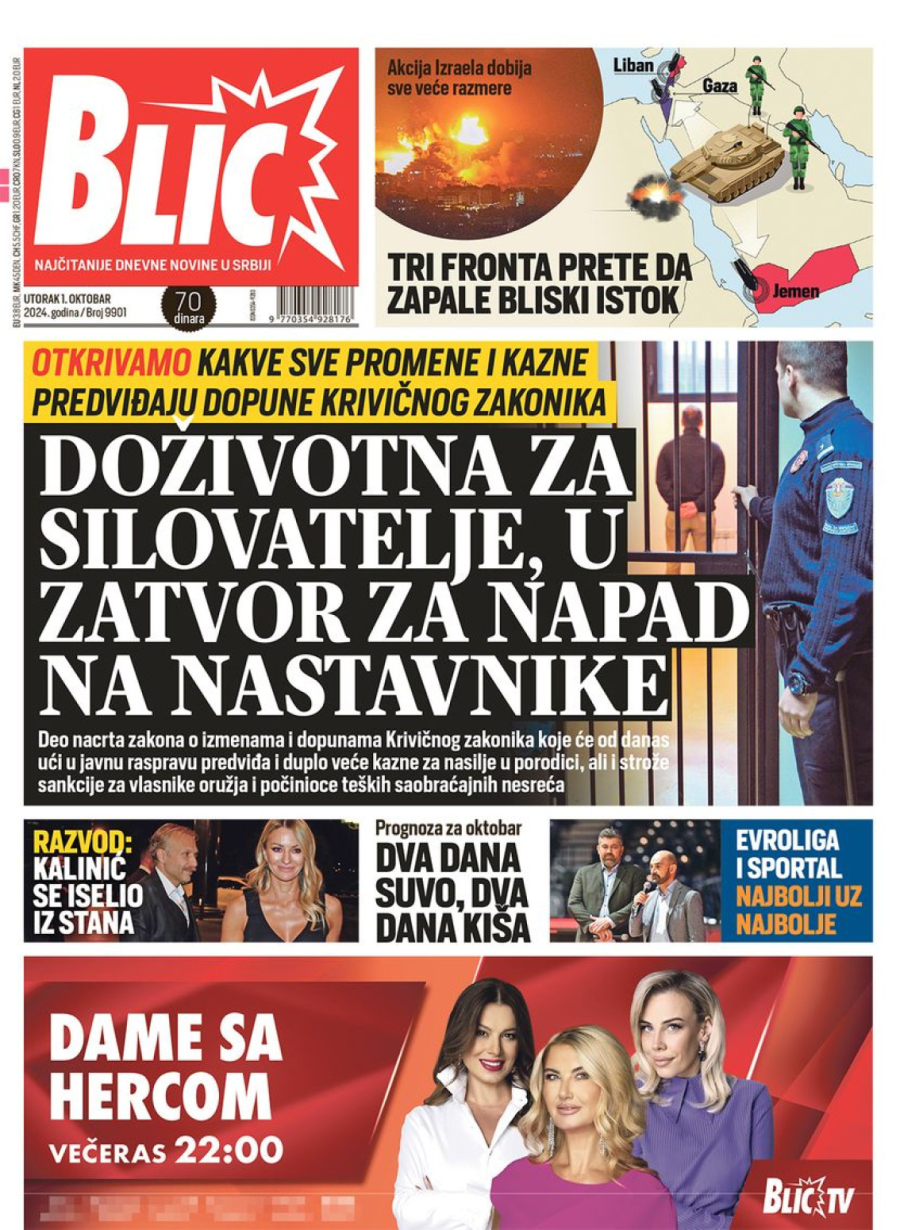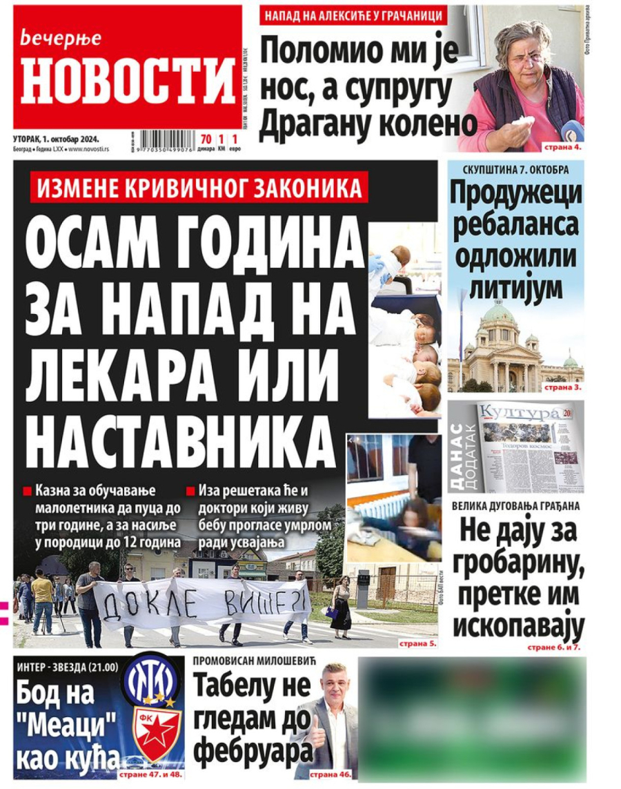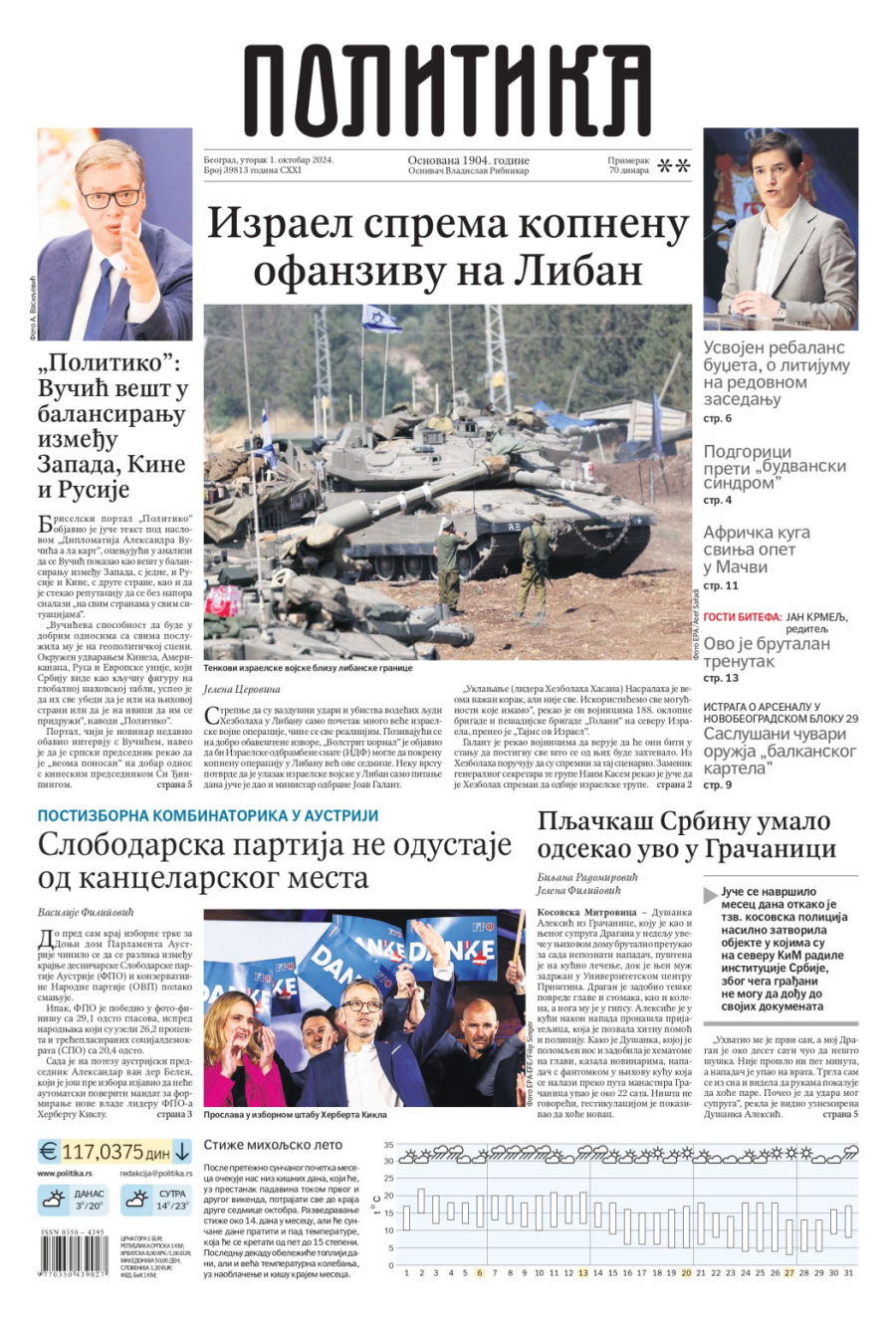 Dnevne novine u Srbiji za utorak, 1. oktobar 2024. godine, na naslovnim stranama najavljuju brojne aktuelne društveno-političke teme i donose ekskluzivne priče.