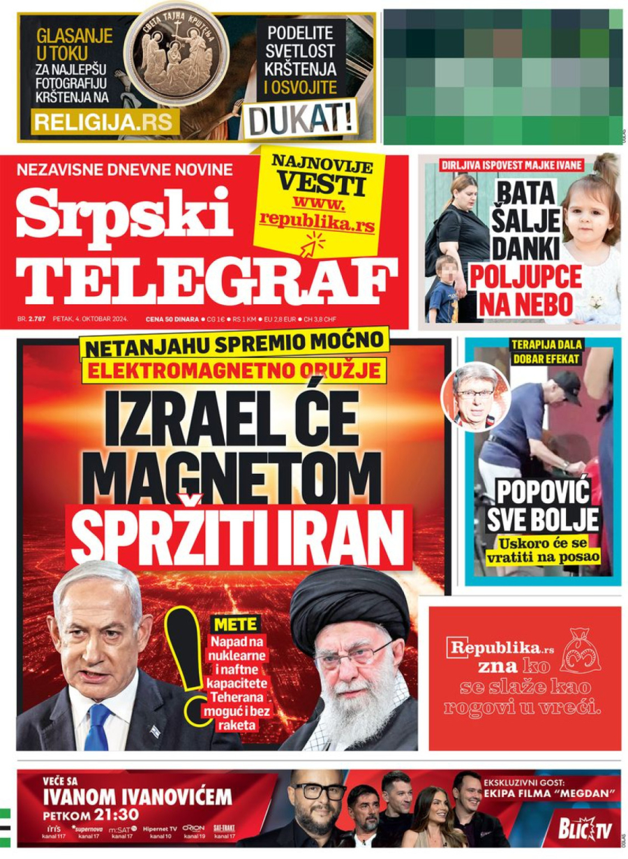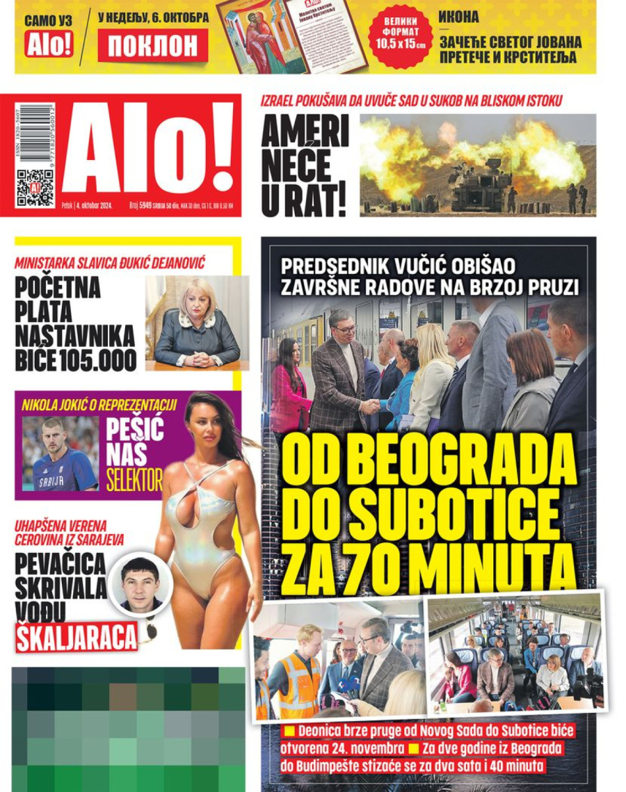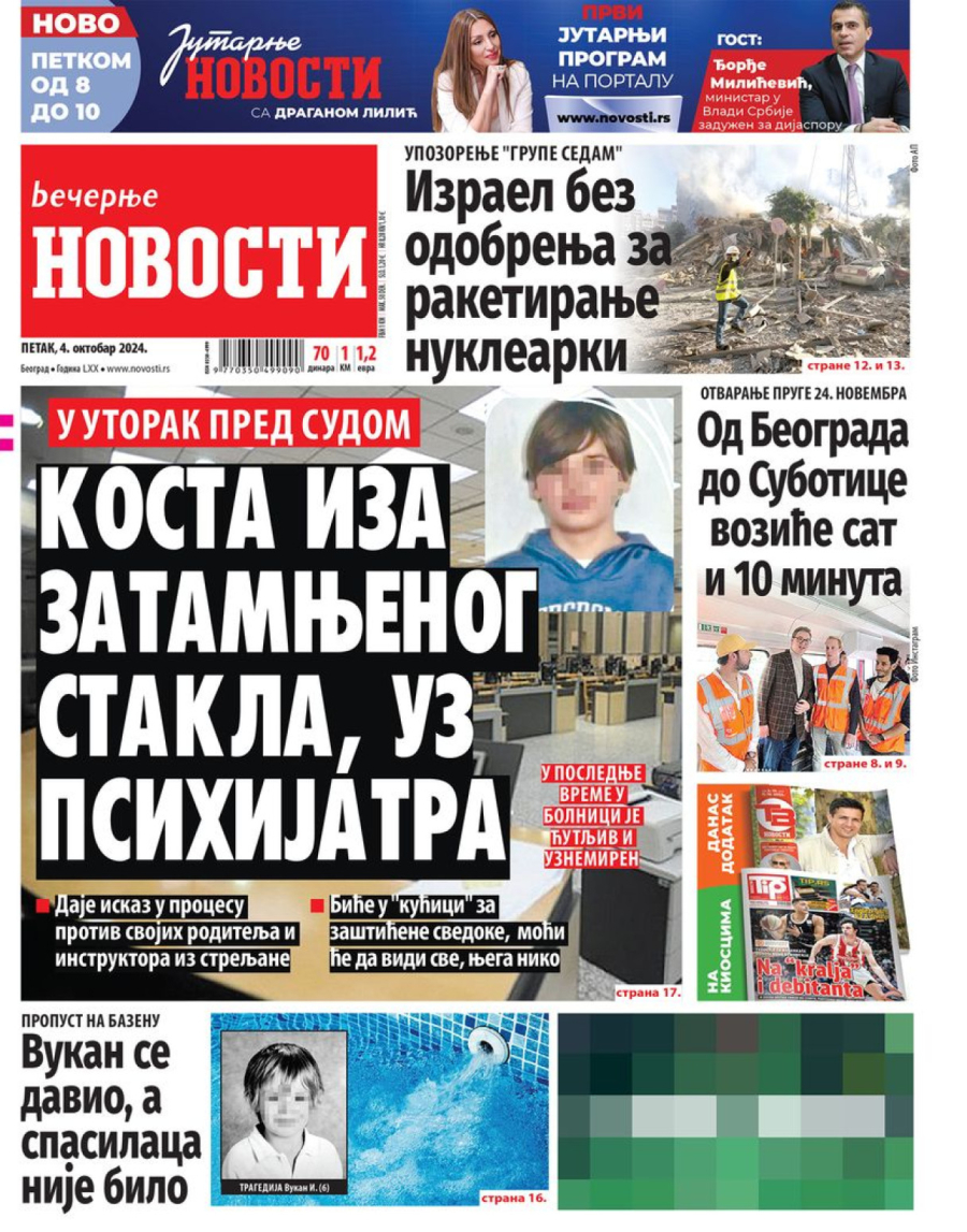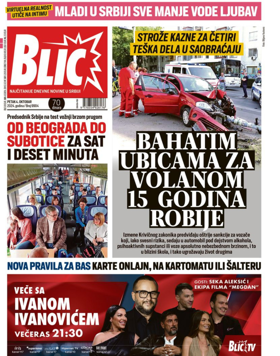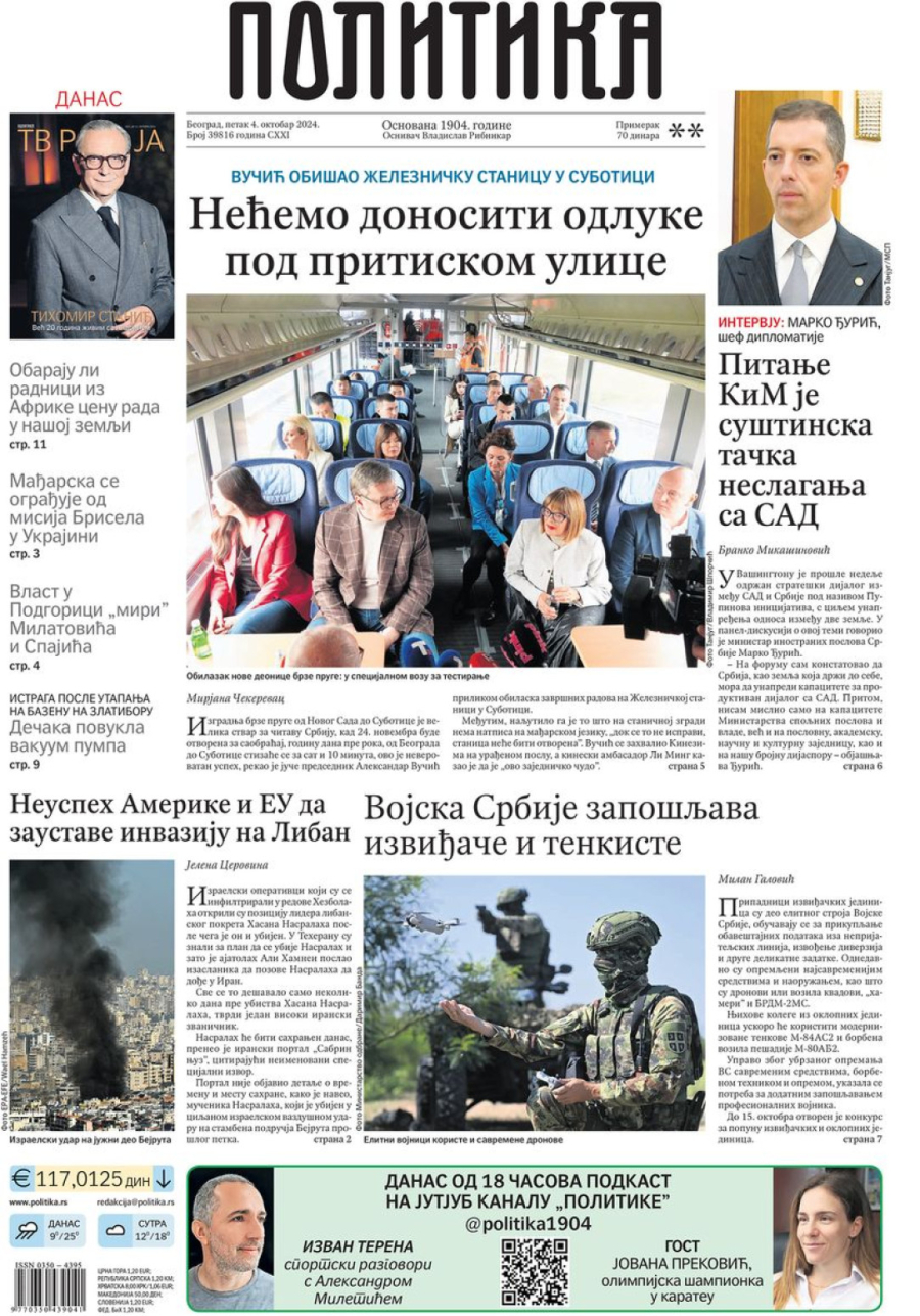 Dnevne novine u Srbiji za petak,4. oktobar 2024. godine, na naslovnim stranama najavljuju brojne aktuelne društveno-političke teme i donose ekskluzivne priče.