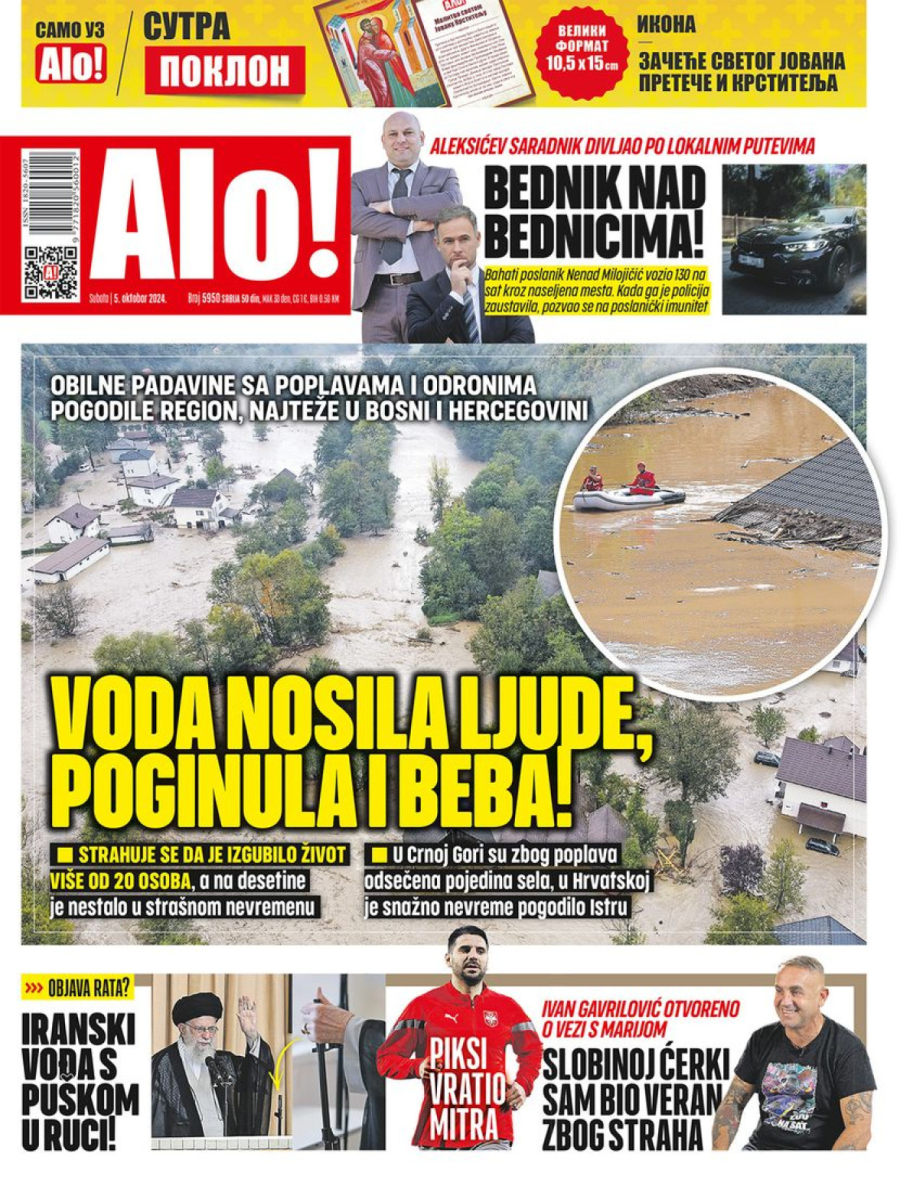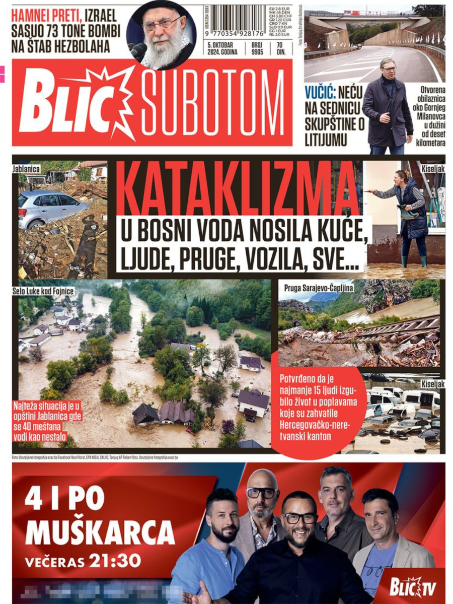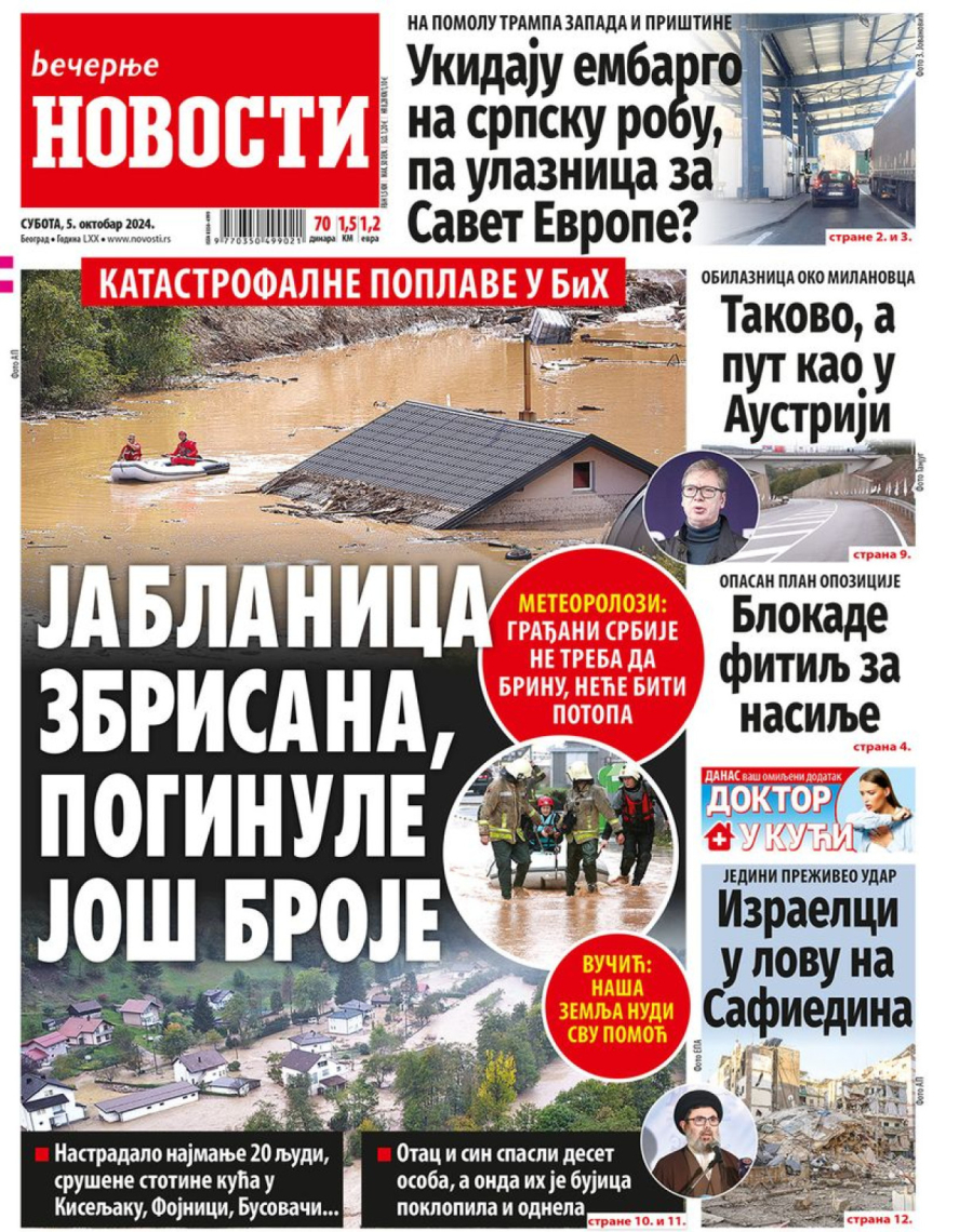 Novine: "U poplavama u BiH 20 mrtvih, desetine nestalih"; "Jablanica zbrisana, poginule još broje"