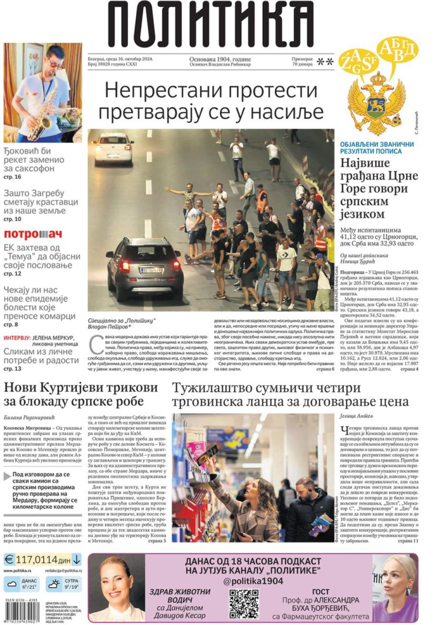 Novine: "Neprestani protesti pretvaraju se u nasilje"; "Na popisu više Srba nego 2011. godine"