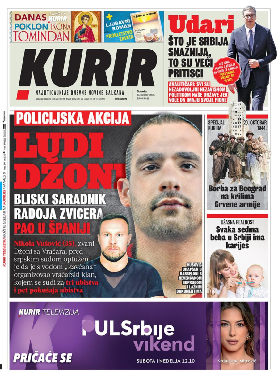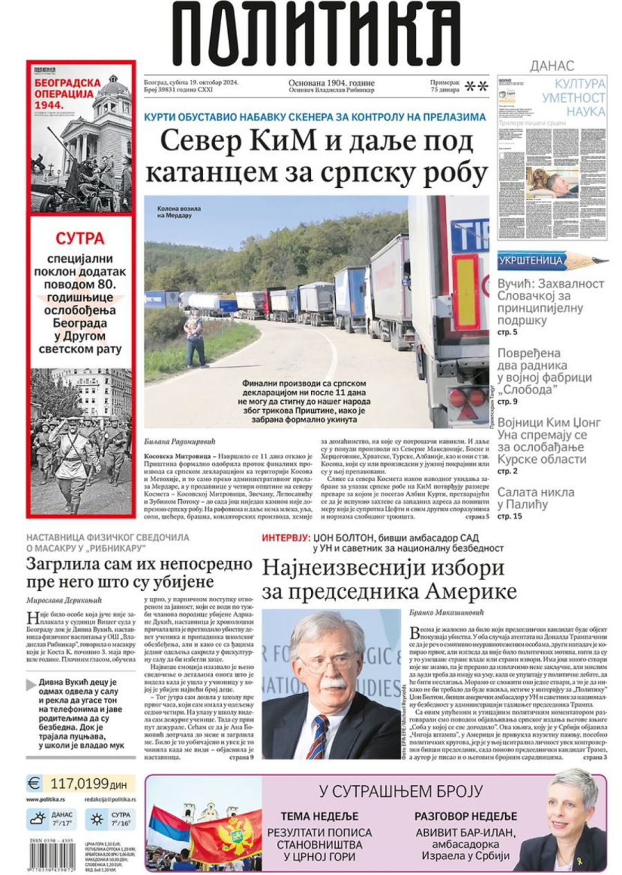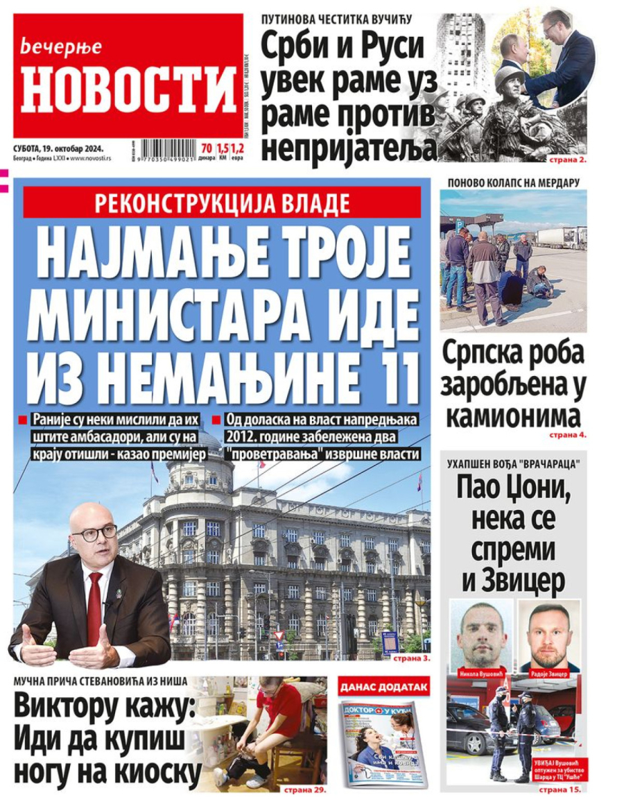 Dnevne novine u Srbiji za subotu, 19. oktobar 2024. godine, na naslovnim stranama najavljuju brojne aktuelne društveno-političke teme i donose ekskluzivne priče.