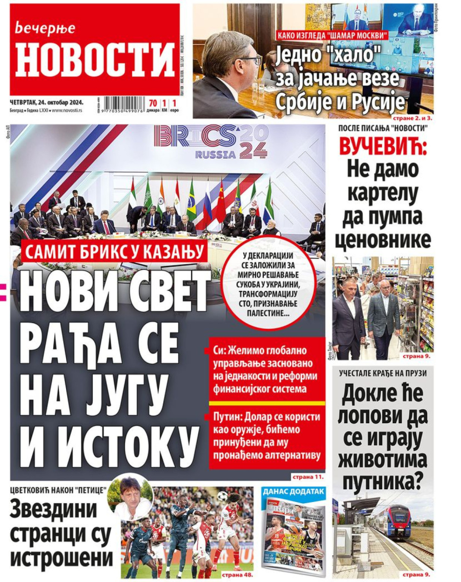 Novine: "Na delu pokazujemo odgovornost za budućnost sveta"; "Jedno 'halo' za jačanje veze Srbije i Rusije"