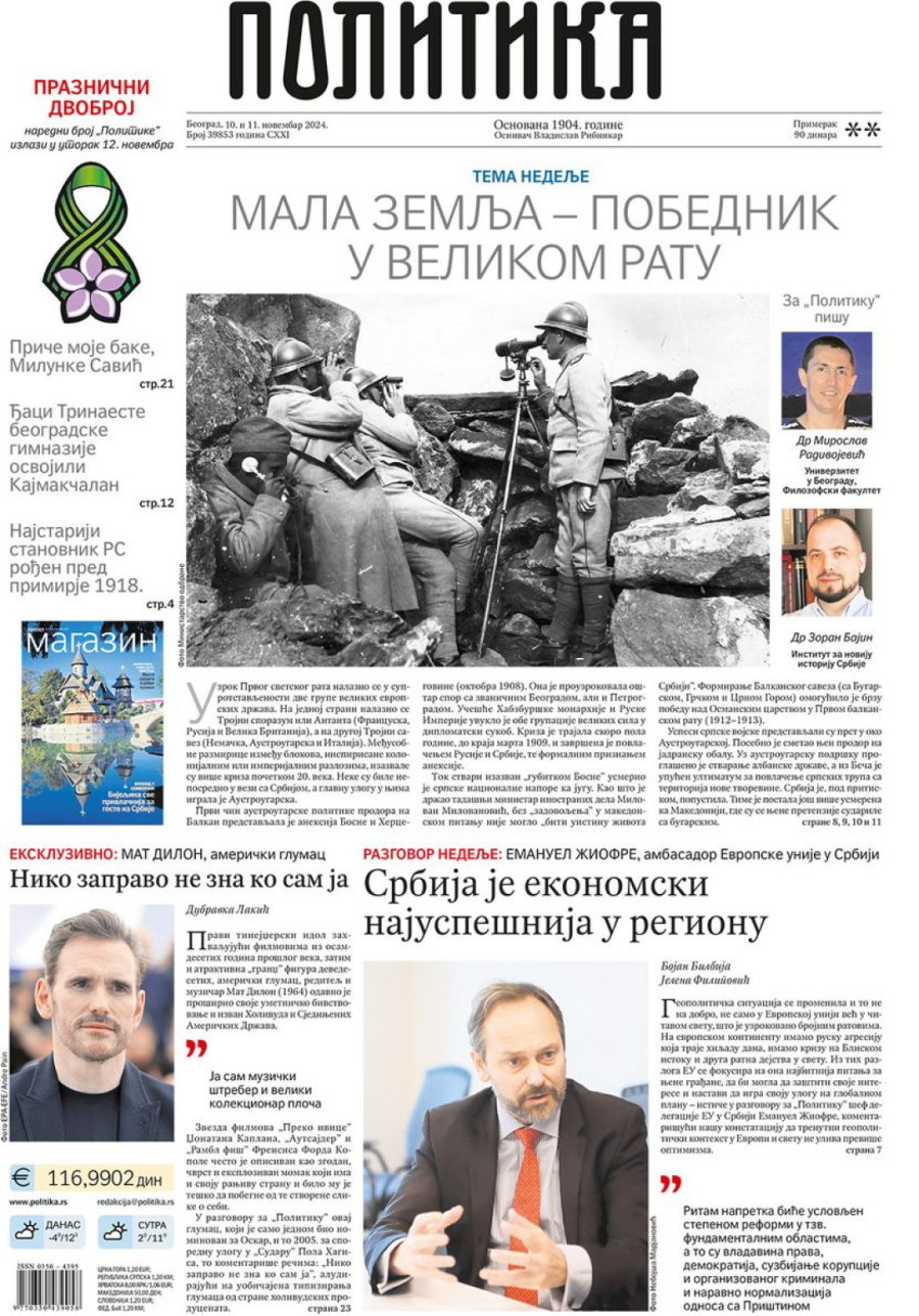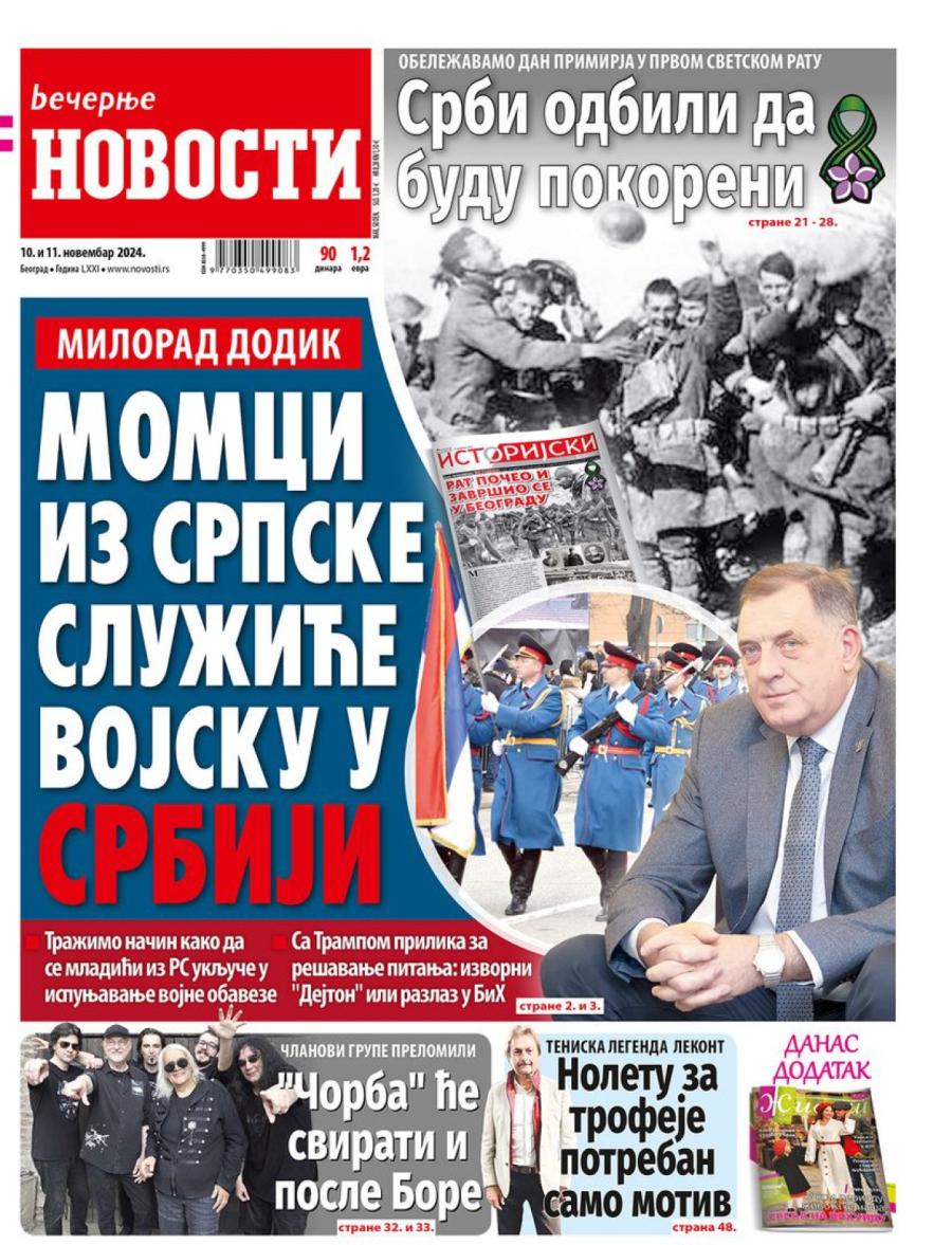 Novine: "Mala zemlja – pobednik u Velikom ratu"; "Dodik: Momci iz Srpske služiće vojsku u Srbiji"