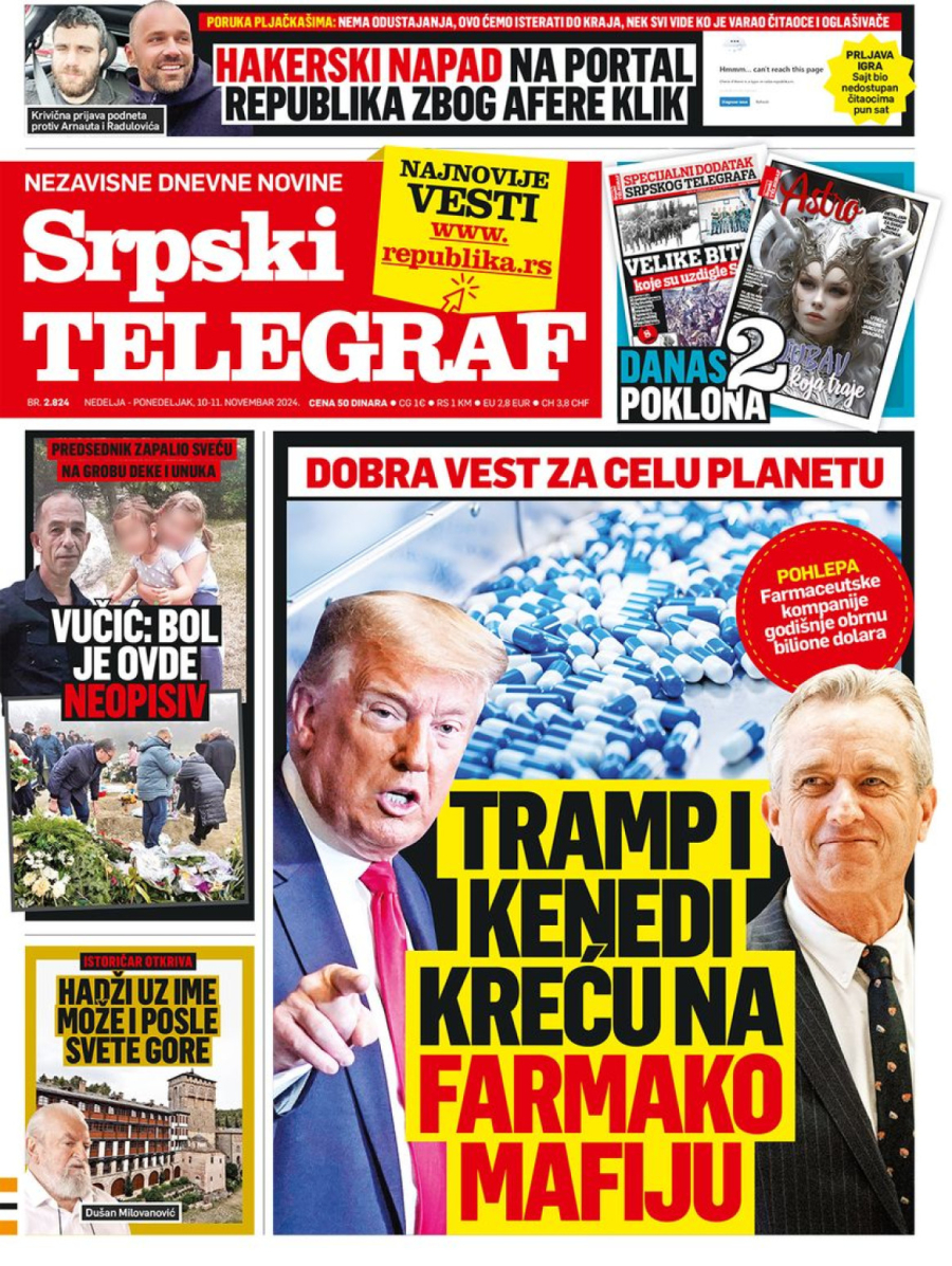 Dnevne novine u Srbiji za ponedeljak, 11. novembar 2024. godine, na naslovnim stranama najavljuju brojne aktuelne društveno-političke teme i donose ekskluzivne priče.