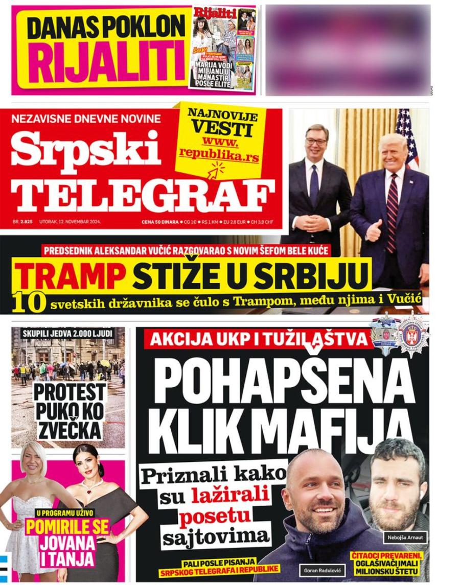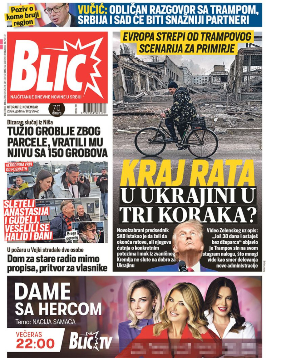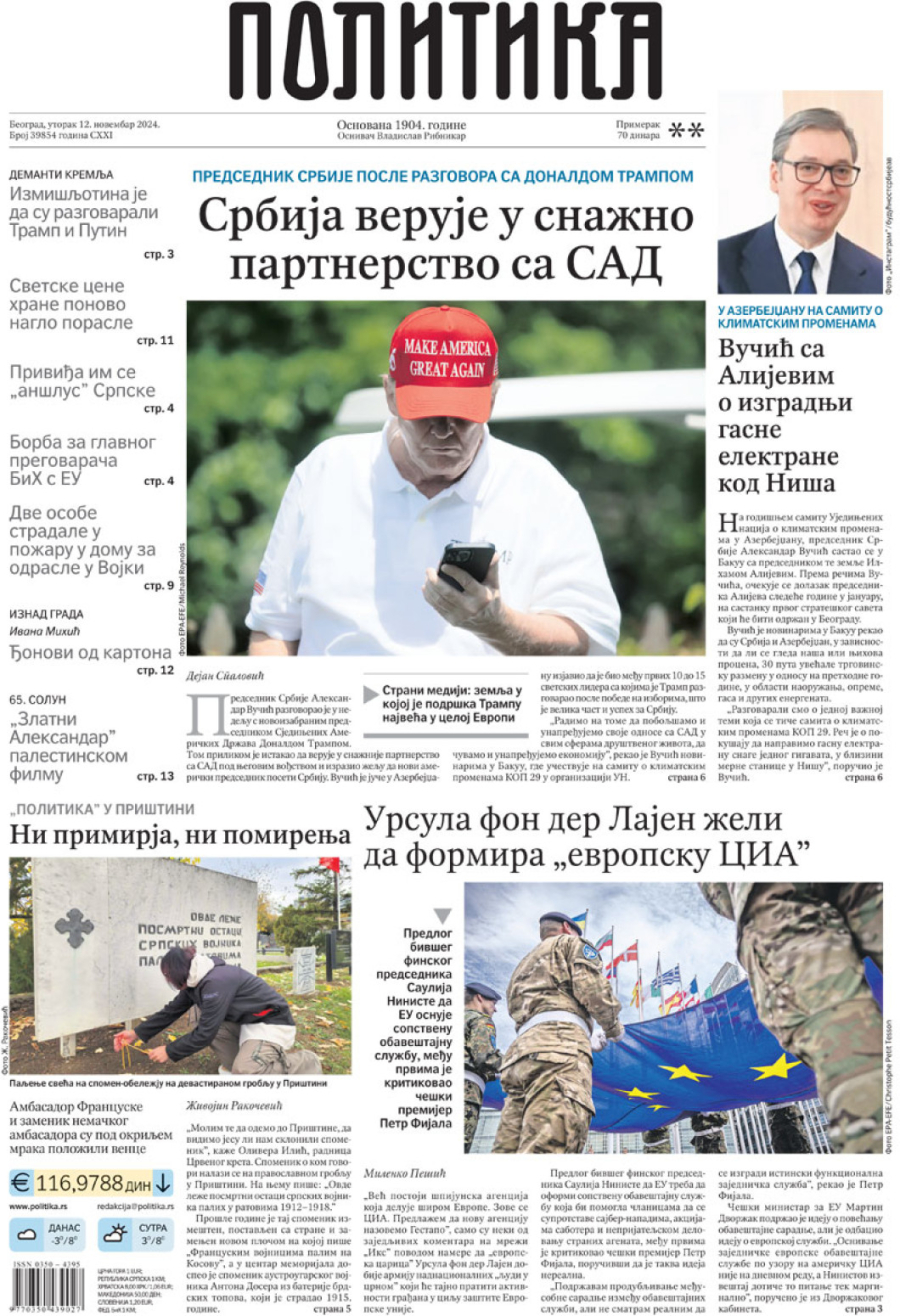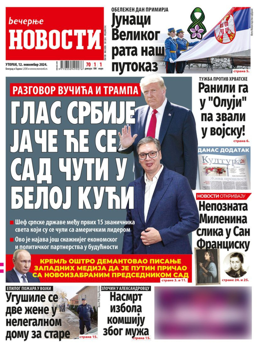 Dnevne novine u Srbiji za utorak, 12. novembar 2024. godine, na naslovnim stranama najavljuju brojne aktuelne društveno-političke teme i donose ekskluzivne priče.