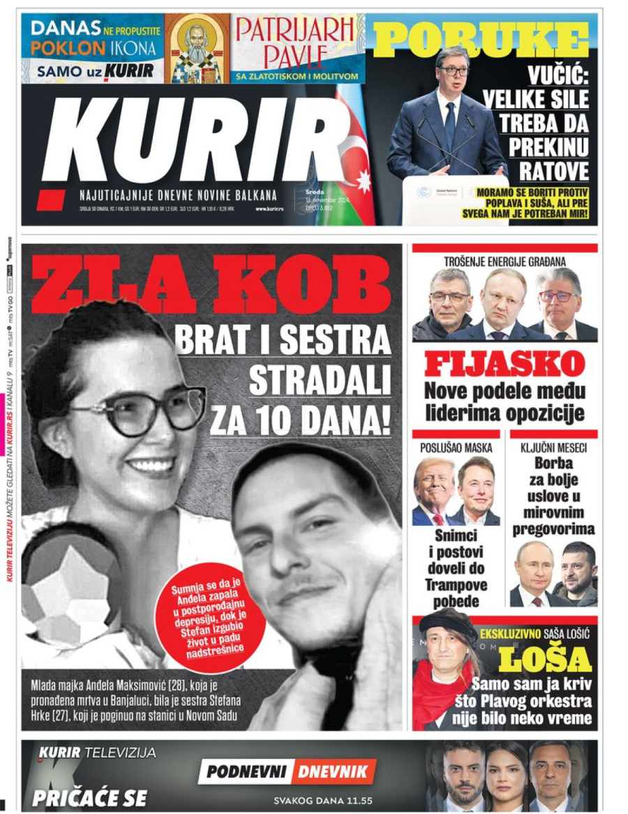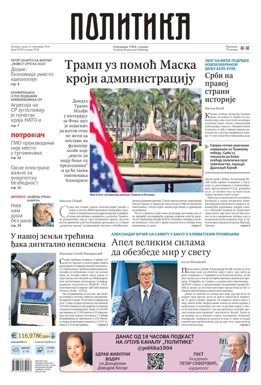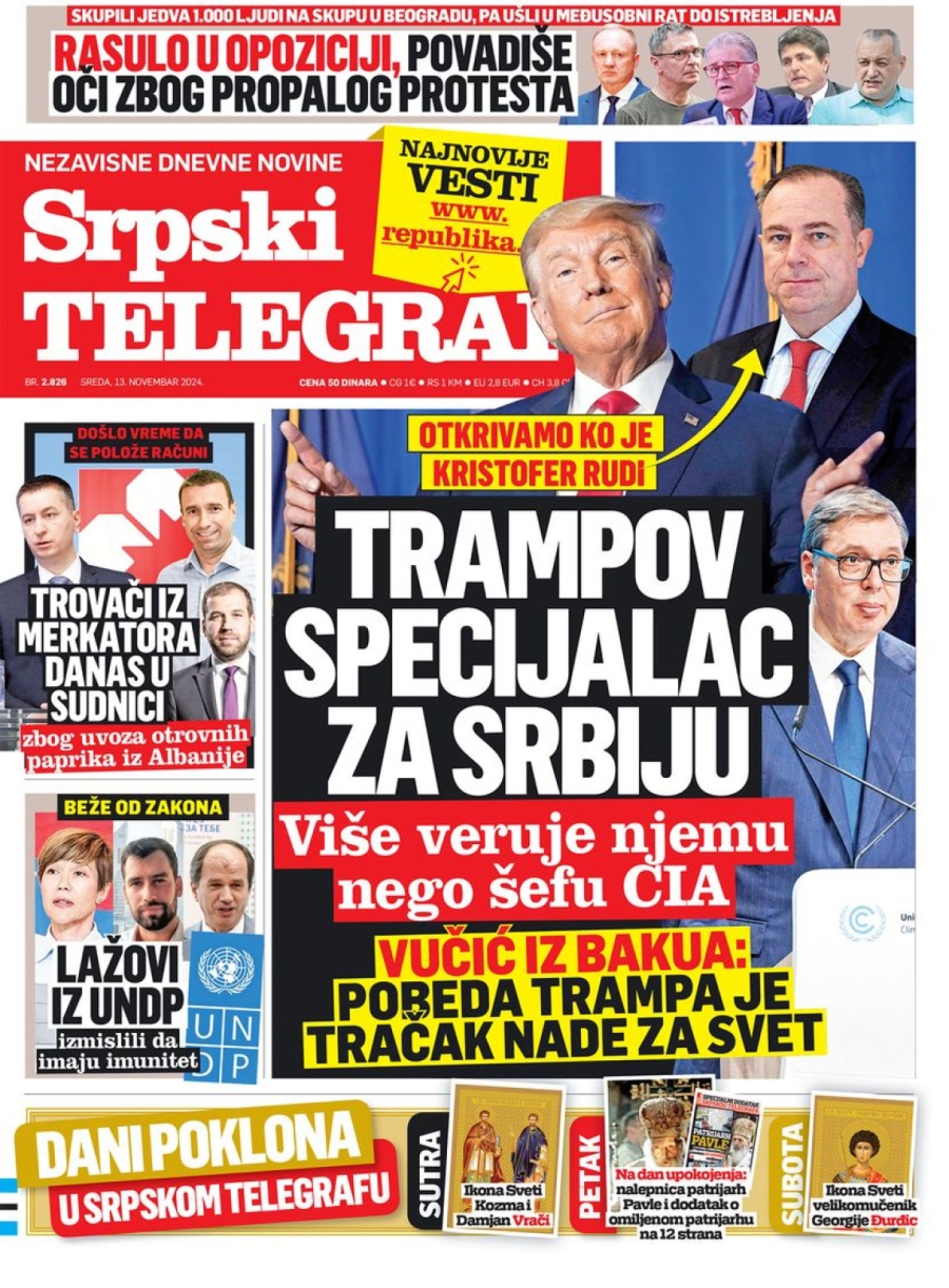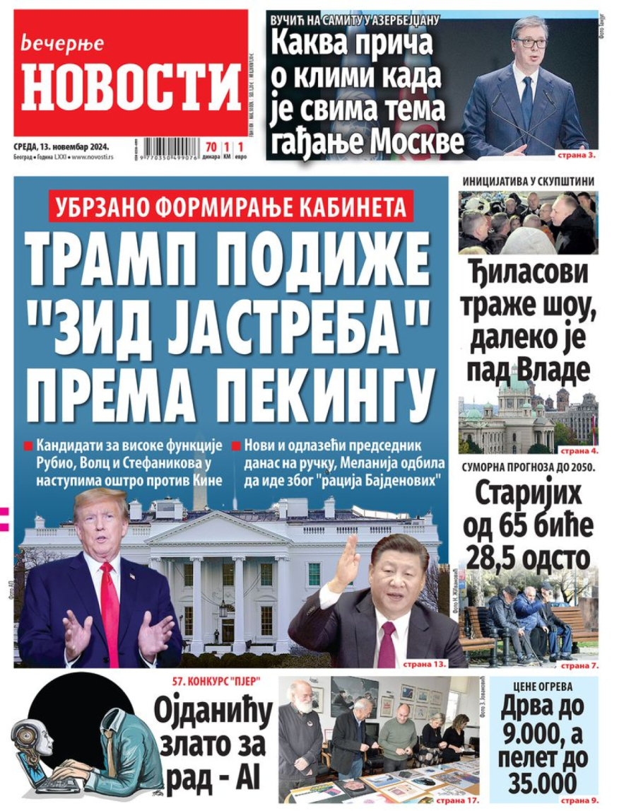 Dnevne novine u Srbiji za sredu, 13. novembar 2024. godine, na naslovnim stranama najavljuju brojne aktuelne društveno-političke teme i donose ekskluzivne priče.