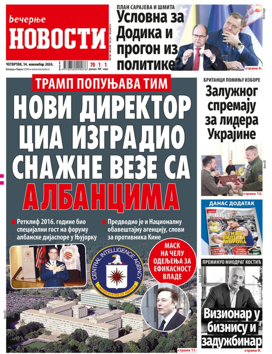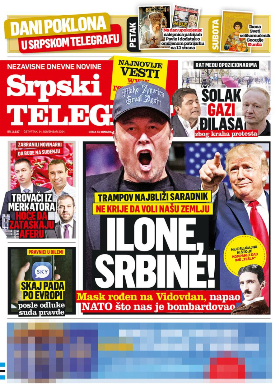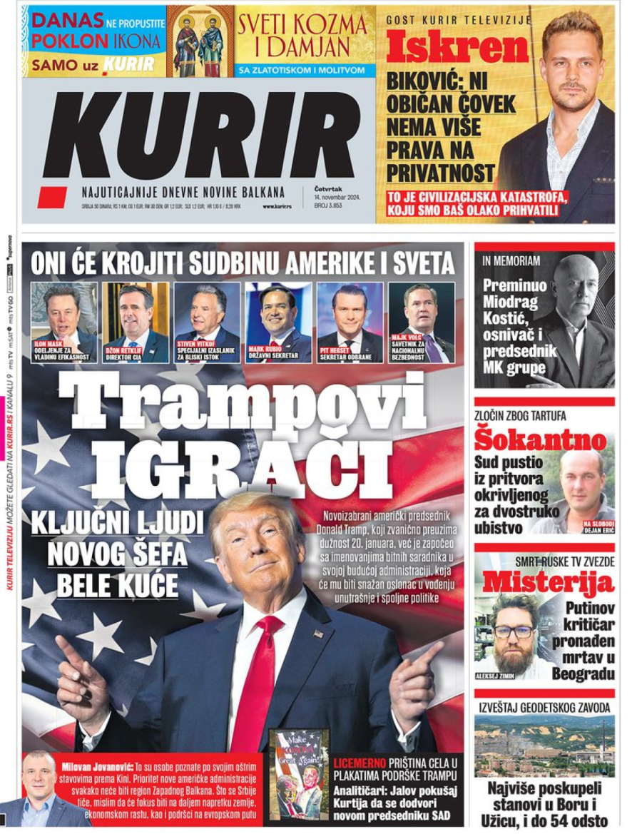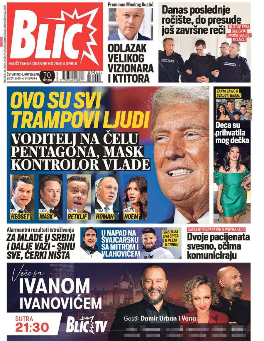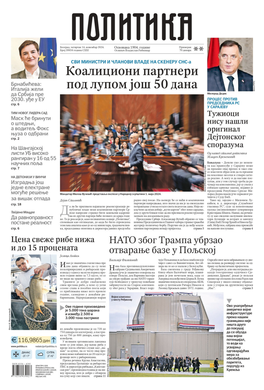 Dnevne novine u Srbiji za četvrtak, 14. novembar 2024. godine, na naslovnim stranama najavljuju brojne aktuelne društveno-političke teme i donose ekskluzivne priče.